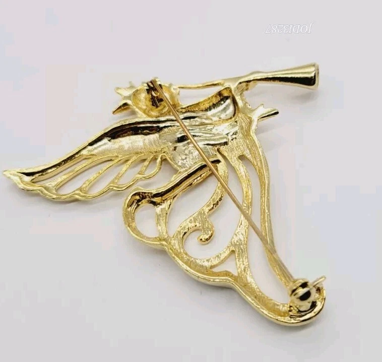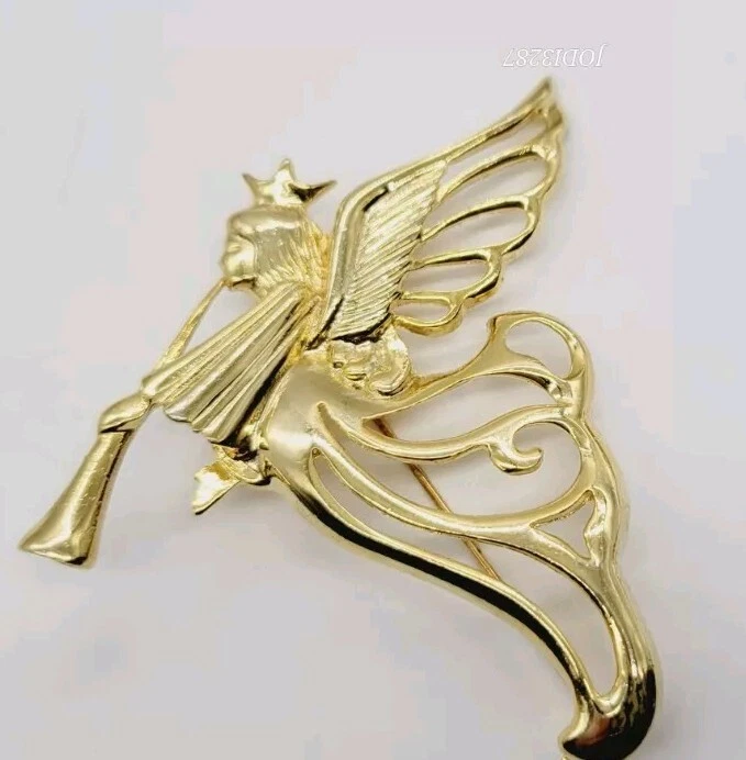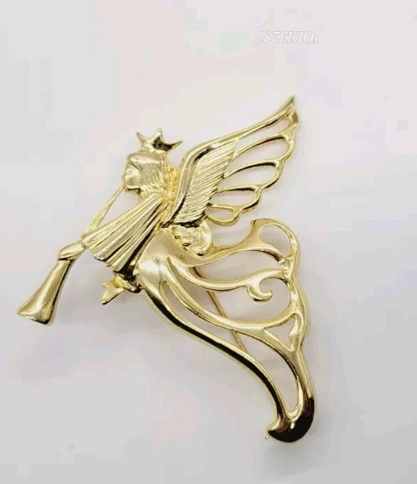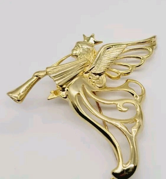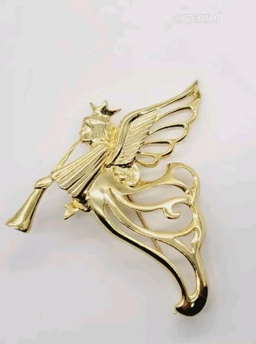 Vintage Angel Brooch Playing Horn Gold Tone Pin 3 in