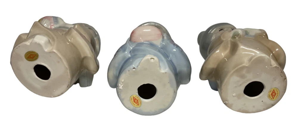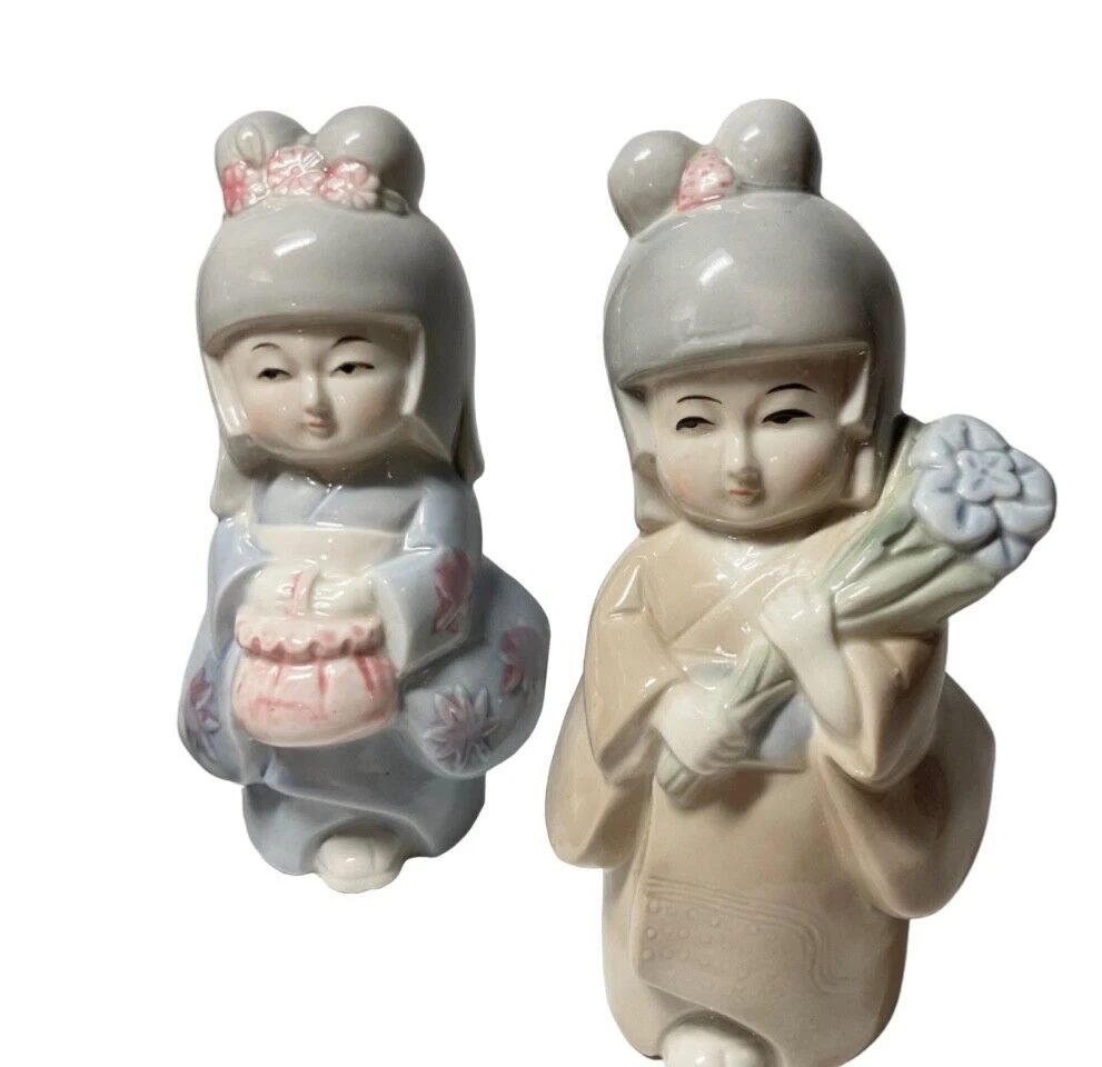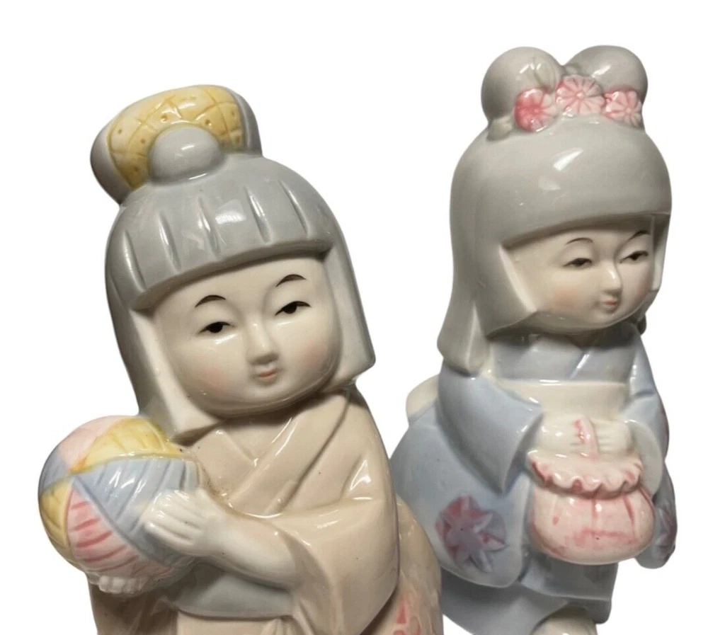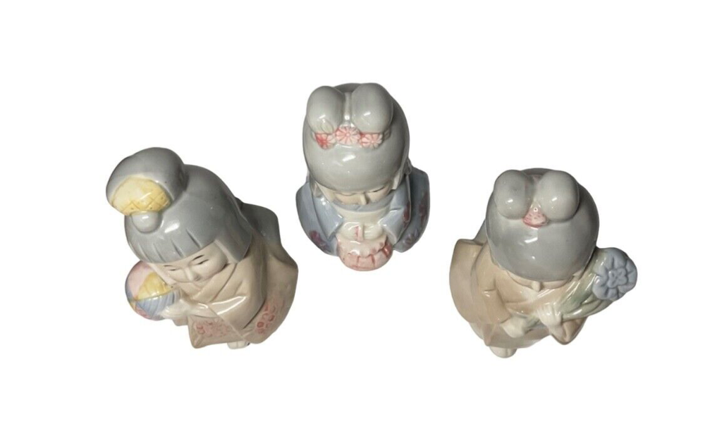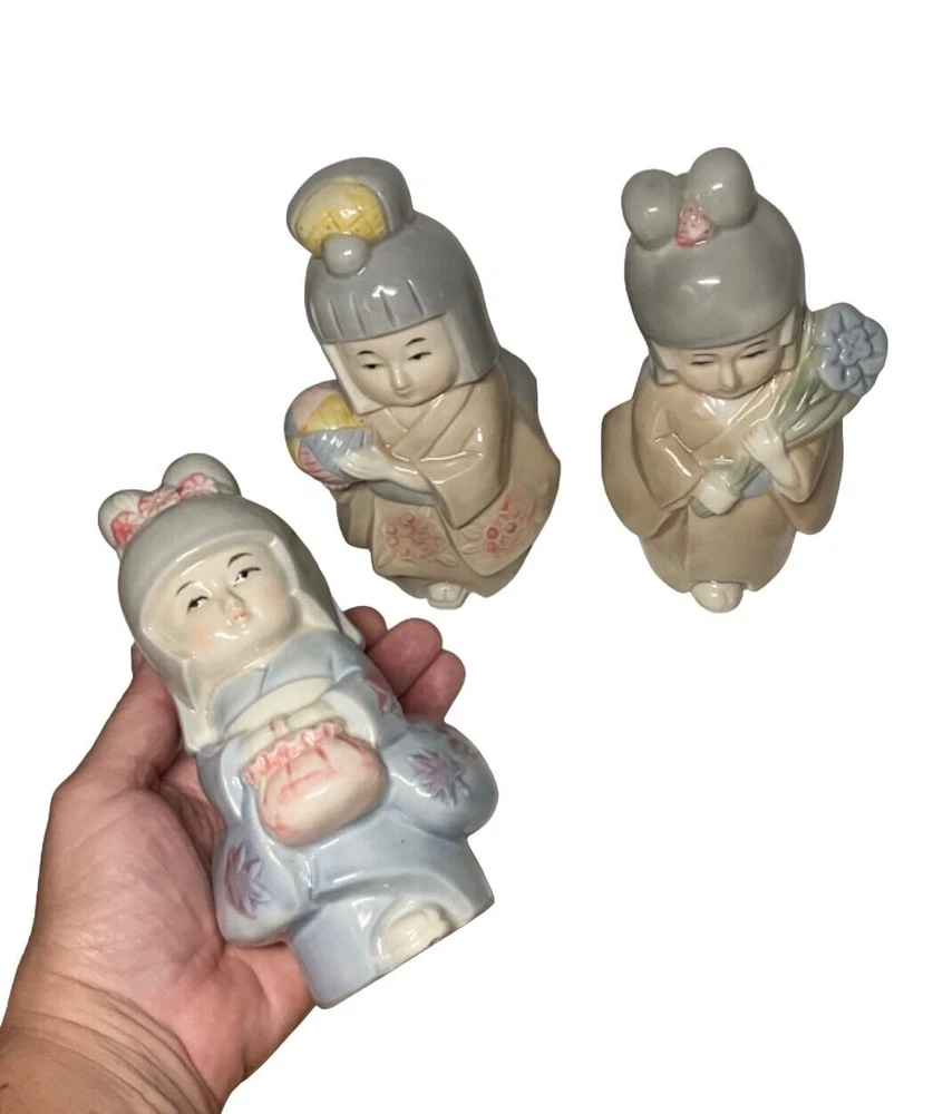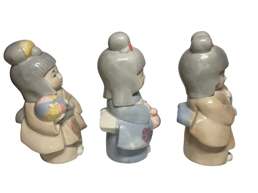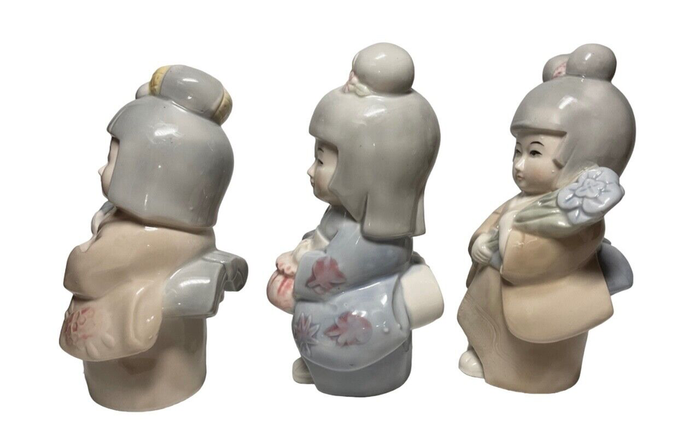 Vintage Set Of 3 Artmart Porcelain Geisha Girl Asian Figurines. Measure 6.5” h x 3.5” w x approximately 3.5” front to back. No chips or cracks but there are some little spots/flecks from manufacturing process. Foil Artmart stickers on bottom. Made in Taiwan. No boxes.
