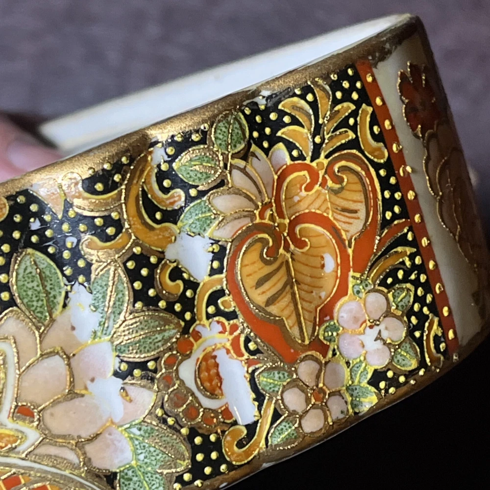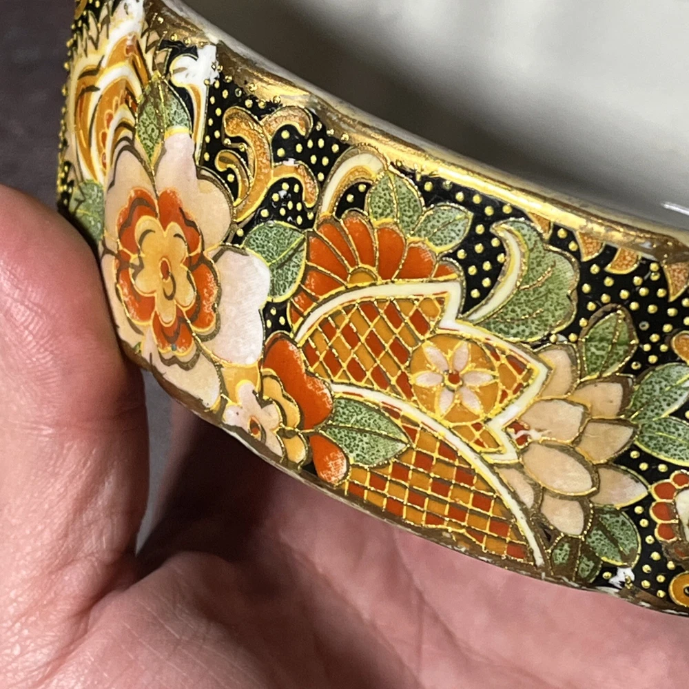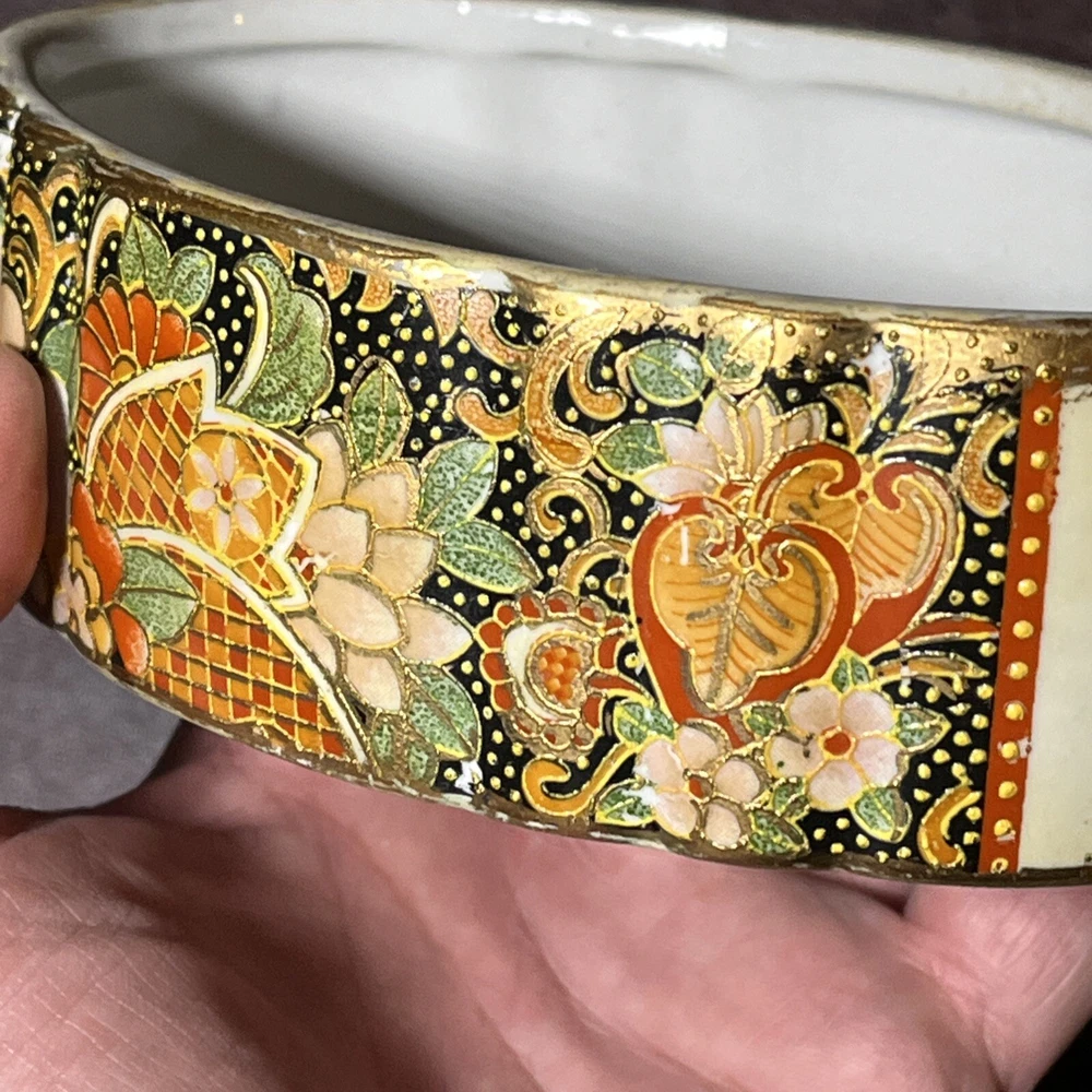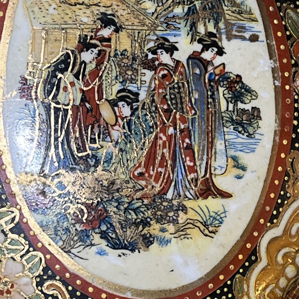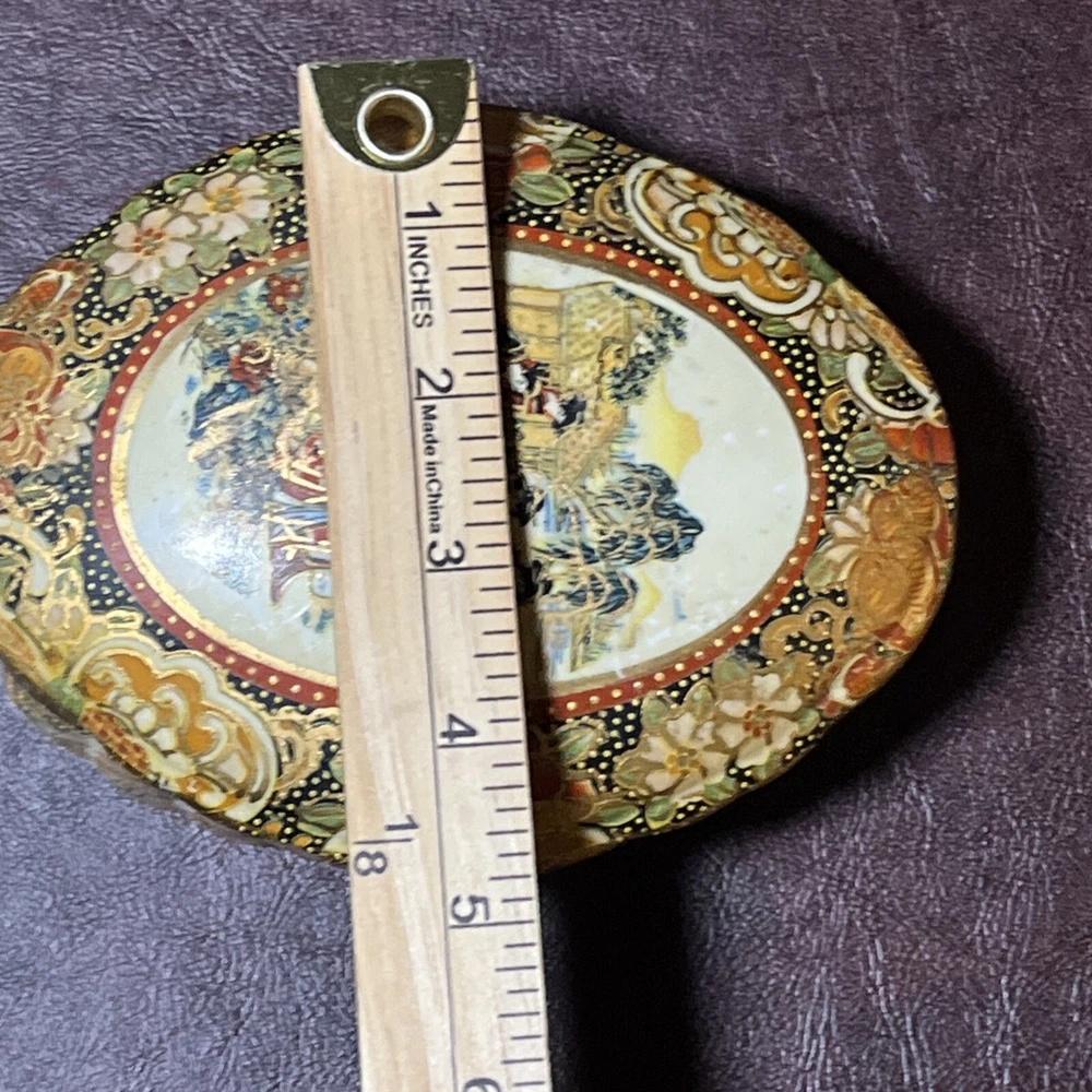 This vintage Asian ceramic jewelry box features a beautifully painted floral design with a Geisha motif, making it a charming decorative piece. The oval-shaped box with a lid provides storage for small trinkets and jewelry, perfect for all occasions. Made in China, this medium-sized trinket box showcases multicolor artwork in an Asian style, ideal for collectors and those who appreciate period styles.