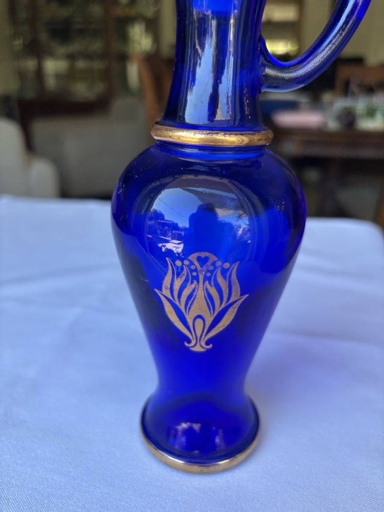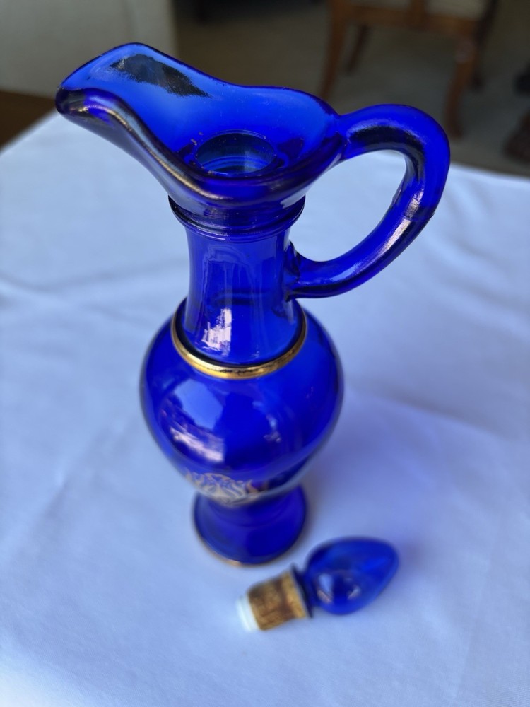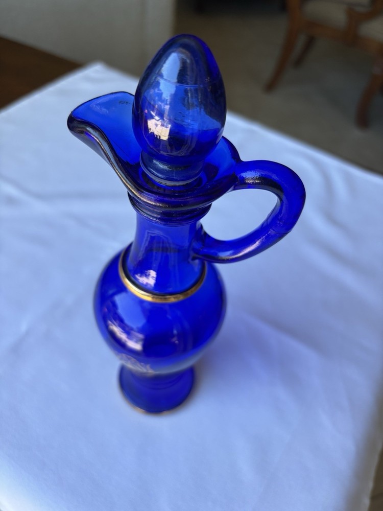 This Vintage Avon Cobalt Blue & Gold Glass Pitcher Genie Bottle Cruet with Stopper is a unique and eye-catching piece suitable for any room. Manufactured in 1975, this medium-sized bottle features an etched design with a high gloss finish, making it a stylish addition to any collection. The gold and cobalt blue colors give it a classic 1970s look, perfect for adding a touch of nostalgia to your decor. With no additional parts required and easy care instructions, this genie bottle is a convenient and attractive piece for any adult's department or furniture piece.