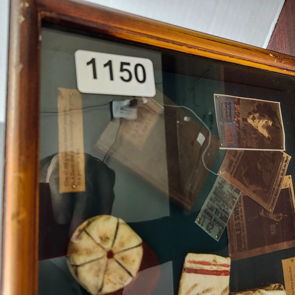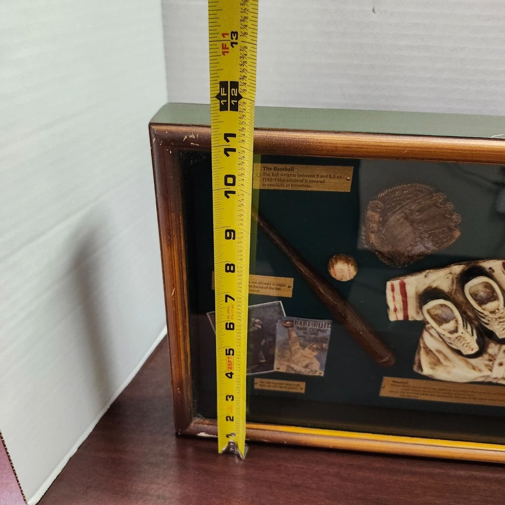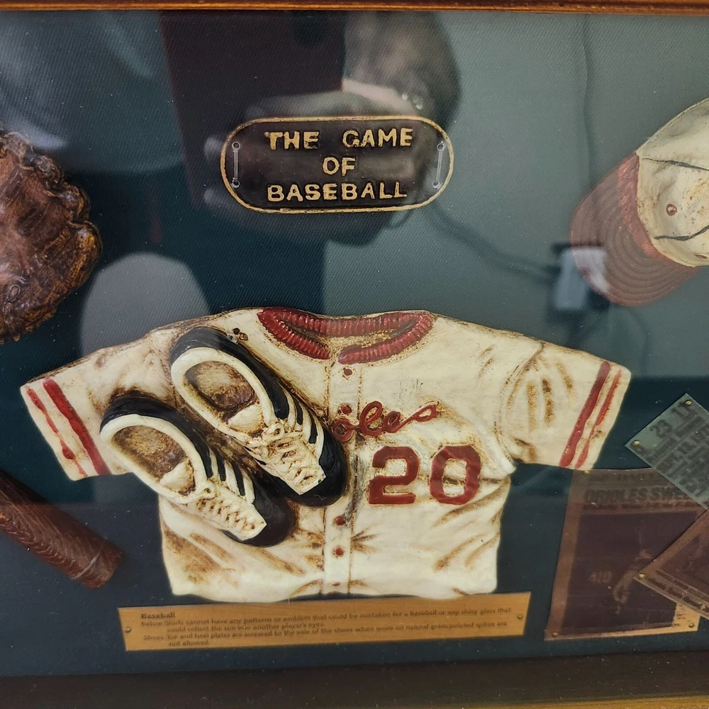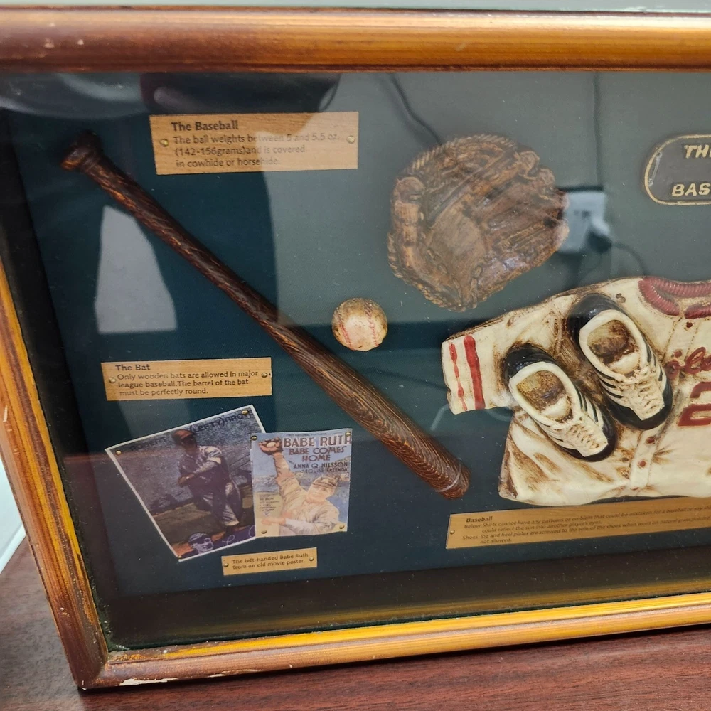 This vintage baseball memorabilia shadow box features a collection of nostalgic items, perfect for any sports enthusiast's display. • Includes vintage jersey, shoes, bat, glove, and baseball • Glass front with wooden frame • Ready to hang with attached hardware • Collectible and decorative piece Minor scratches on the frame; overall dimensions: 20" x 12" x 4"