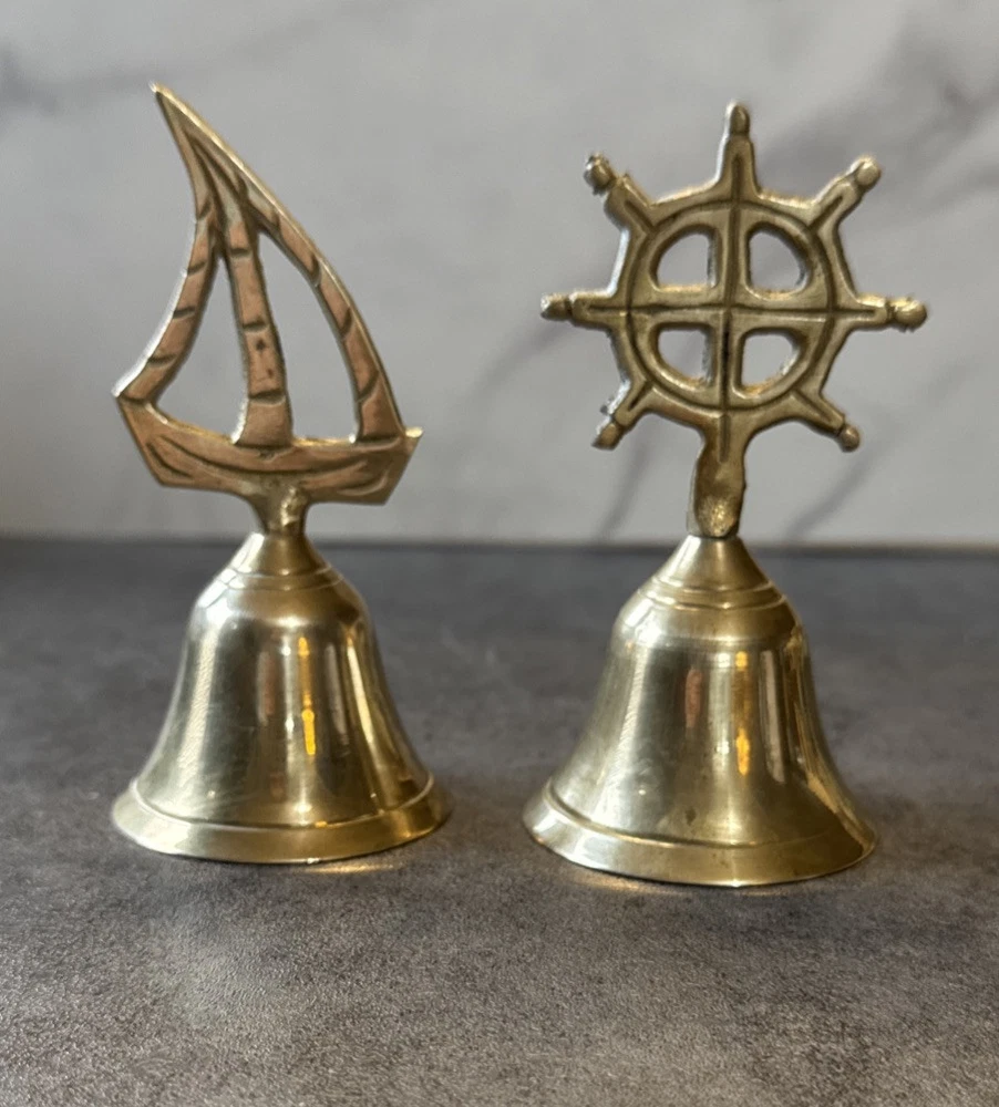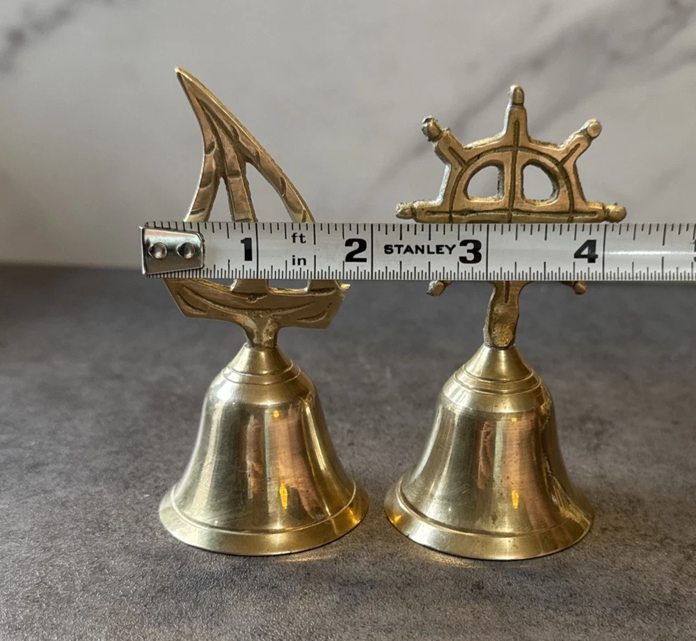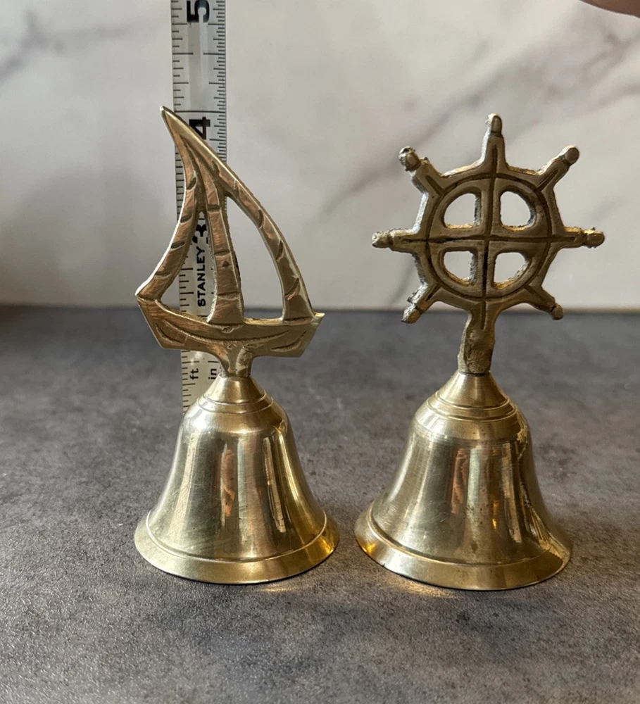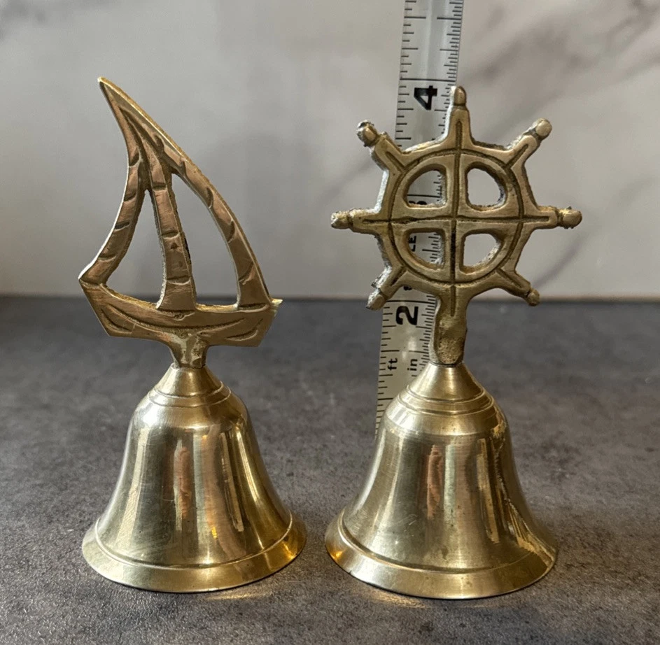 Add a touch of vintage charm to any room with this novelty set of 2 brass bells. The bells are shaped like a sailboat and captain's wheel, making them perfect for nautical themed decor. These small, unboxed bells are suitable for window, furniture, or wardrobe display. Crafted in India, the bells have a polished brass finish and are clean with Braso or Damn Cough. The unit quantity is 2, with each bell measuring 4.25 inches in height and 2 inches in length and width. These original, European style bells are perfect for all occasions and can be a great addition to any collection.