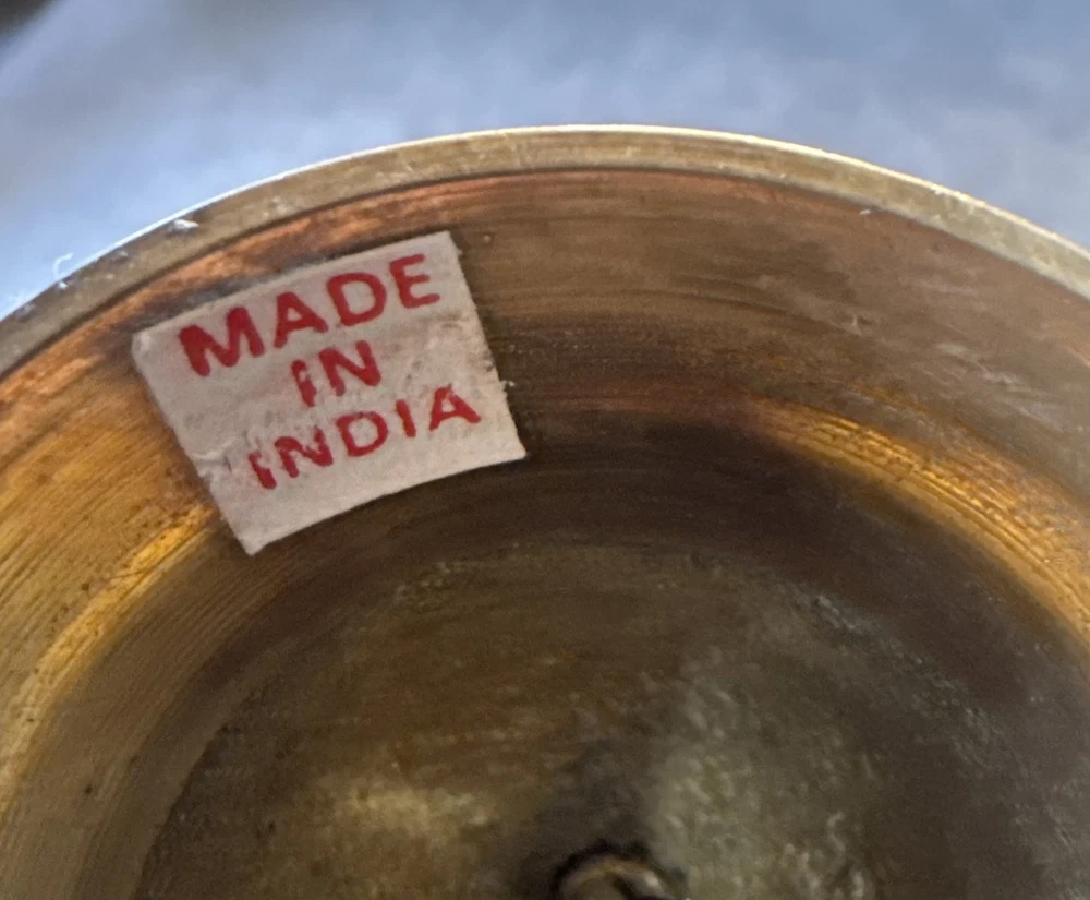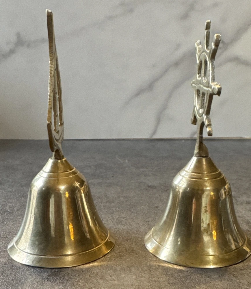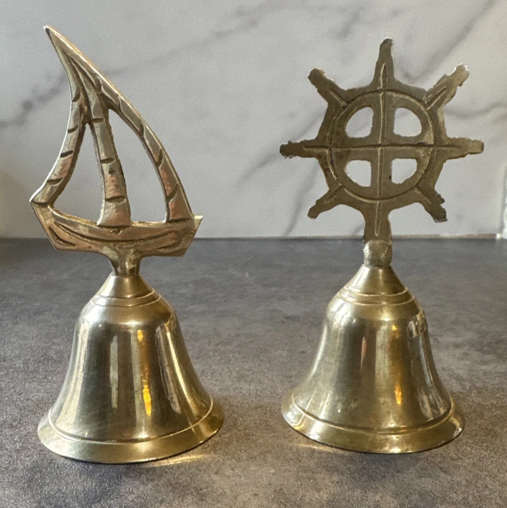 Add a touch of vintage charm to any room with this novelty set of 2 brass bells. The bells are shaped like a sailboat and captain's wheel, making them perfect for nautical themed decor. These small, unboxed bells are suitable for window, furniture, or wardrobe display. Crafted in India, the bells have a polished brass finish and are clean with Braso or Damn Cough. The unit quantity is 2, with each bell measuring 4.25 inches in height and 2 inches in length and width. These original, European style bells are perfect for all occasions and can be a great addition to any collection.