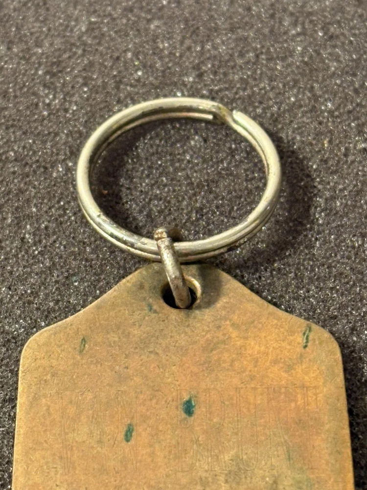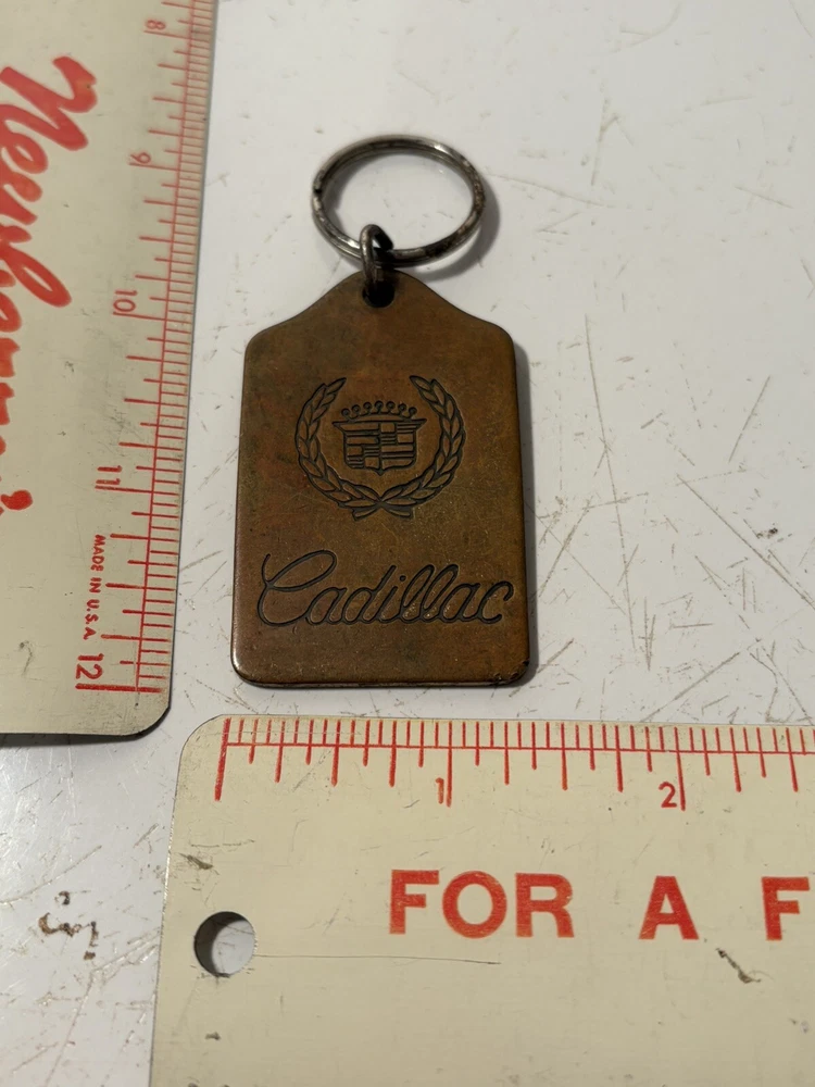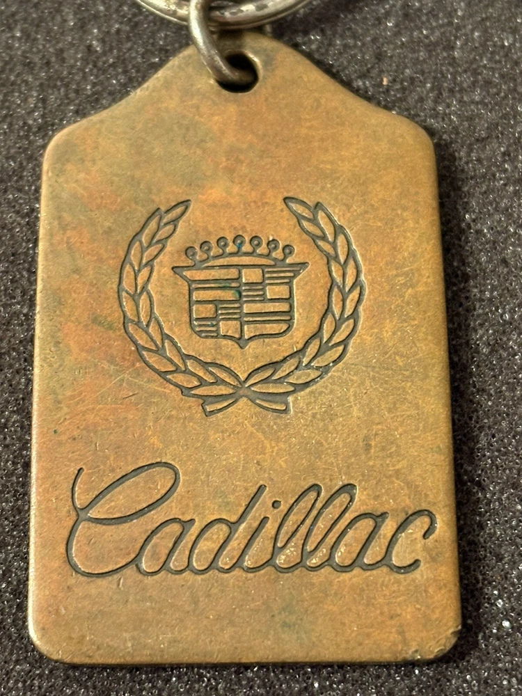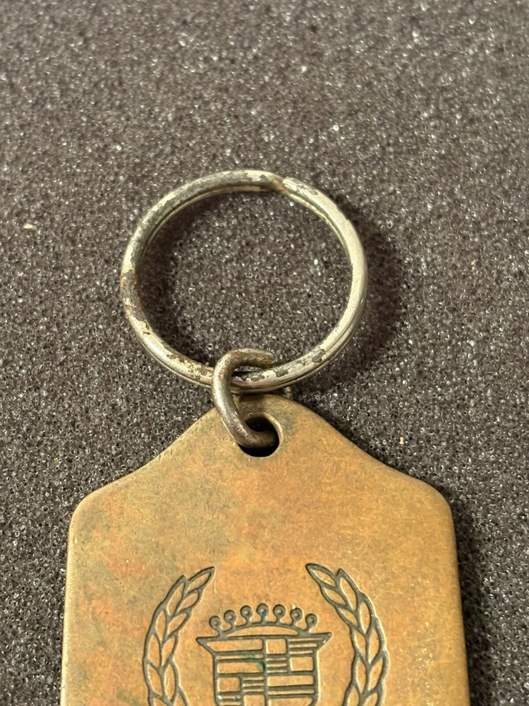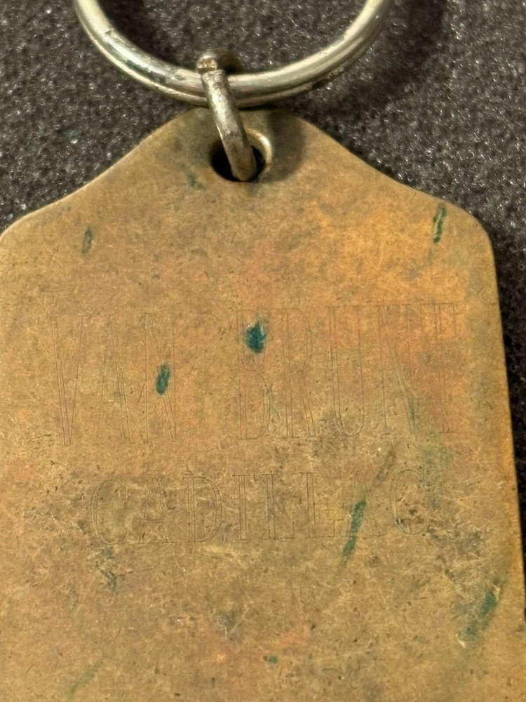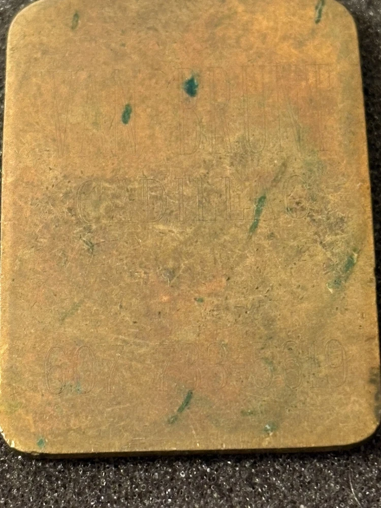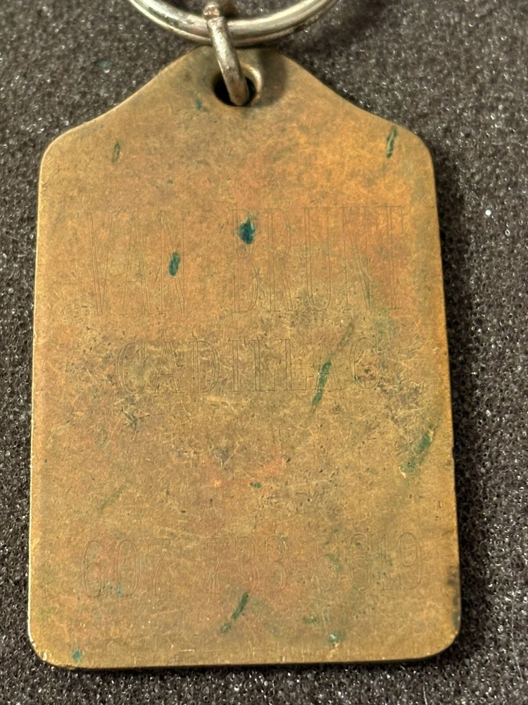 A vintage fob or keychain. Marked with the symbol of Cadillac automobiles. Advertises for Van Brunt Cadillac, an auto dealer in Elmira, New York. The keychain has a lot of wear, discoloration, and scuffs; the Van Brunt name is barely visible on the reverse. Sold as is. Note: 7/14/24 Oaks Corners