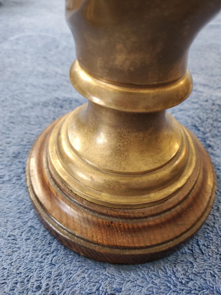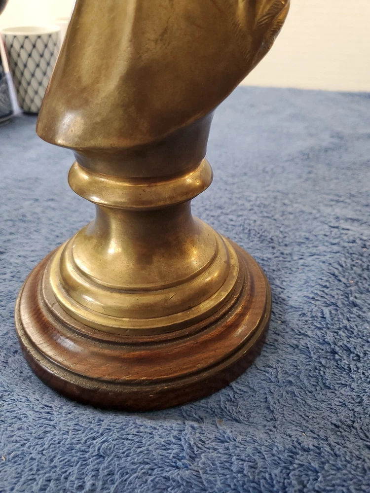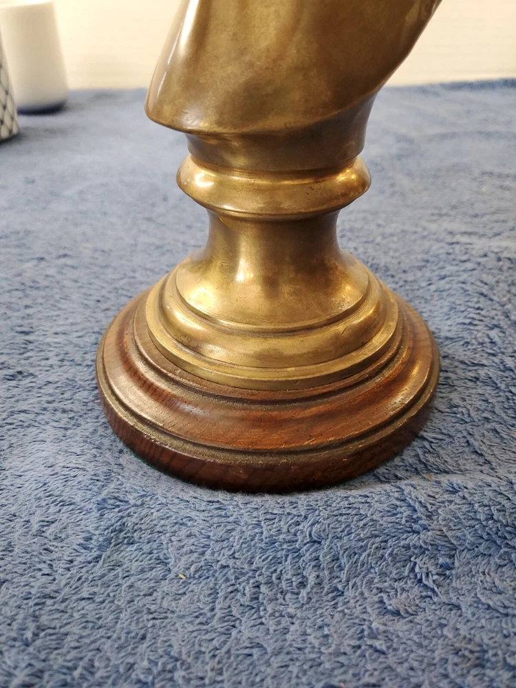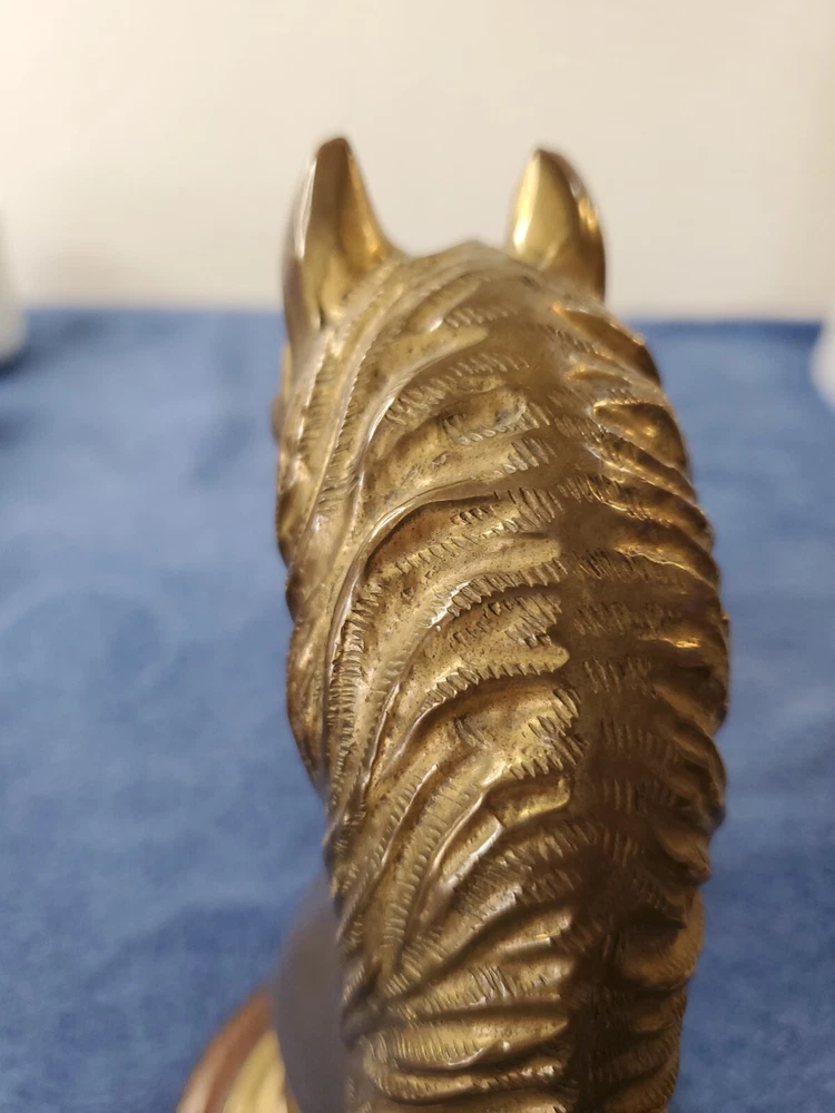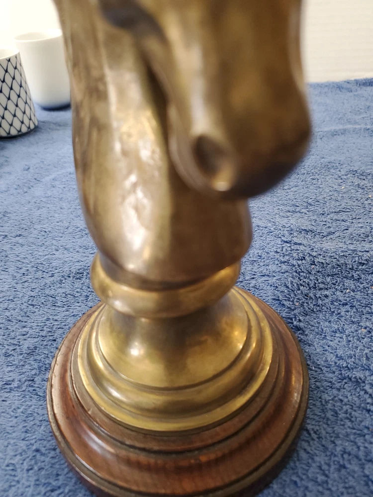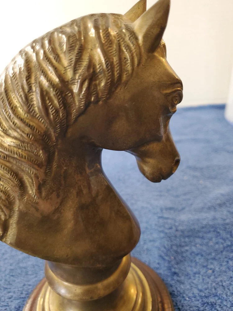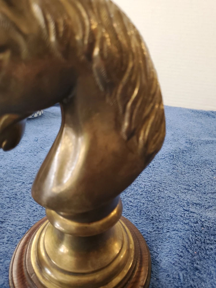 Vintage Bronze look Finish Horse Head Sculpture Bookend on Wooden base. 9 in tall with a 5" round wooden base. Very heavy and very old.