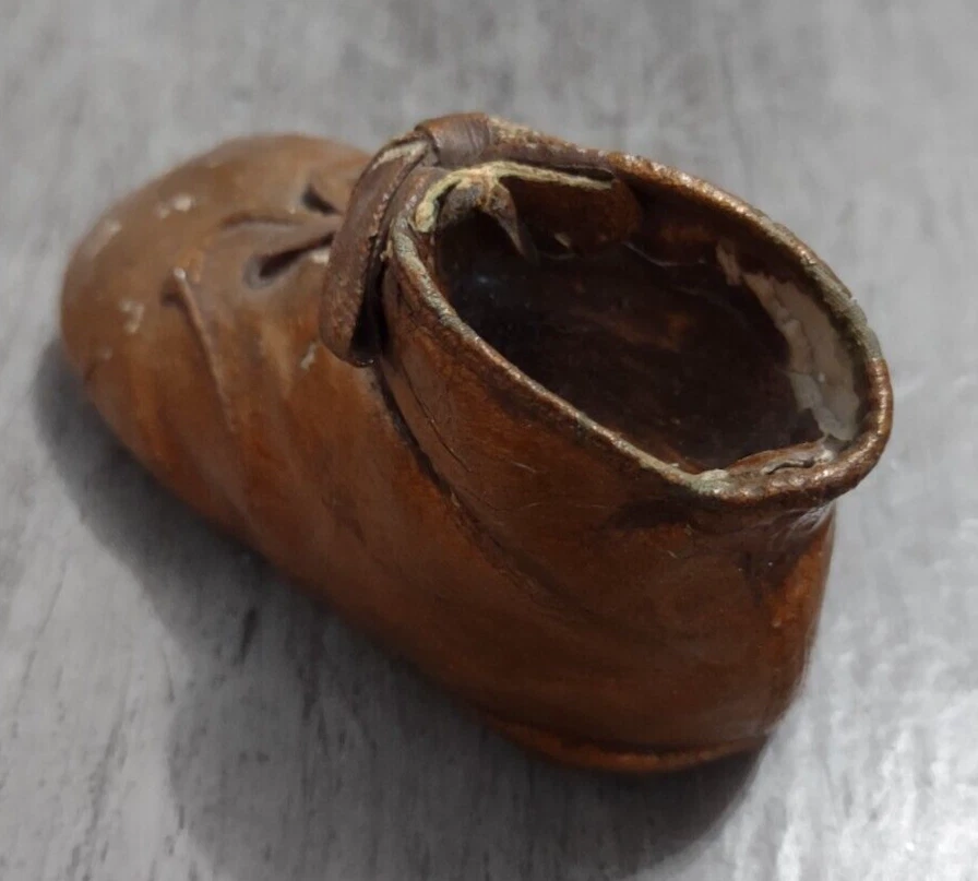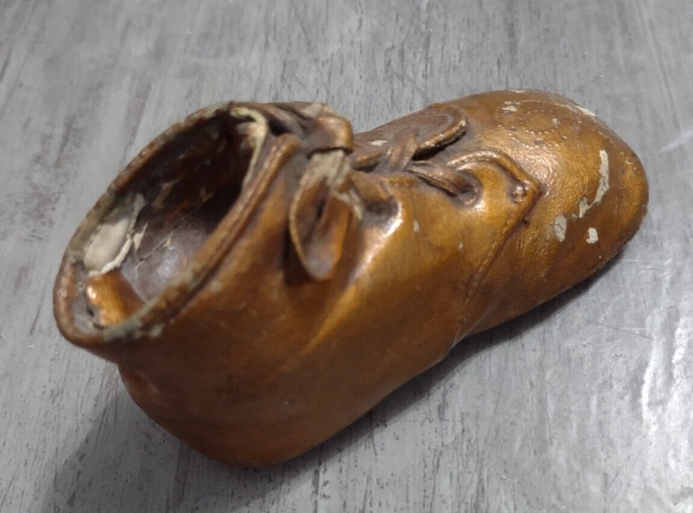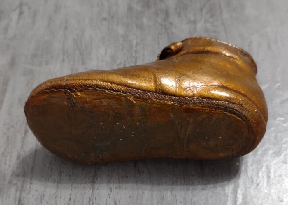 Vintage bronzed copper baby shoe nursery decor. It is 4 1/4"L x 2"H x 2"W. Good condition with some to the copper finish. Perfect for a nursery, bookshelf, etc. Please refer to photos as they are part of the description. Please ask if you have any questions. Payment is due within five days. Please look at the other items I have listed as I will combine shipping. Your item will be carefully packaged. If it arrives damaged, it is the buyer's responsibility to file a claim with the shipping carrier. Please do not leave negative or neutral feedback before contacting me with any issues as there is usually a solution to the problem. Returns will not be accepted after 30 days. Thanks for looking. CP