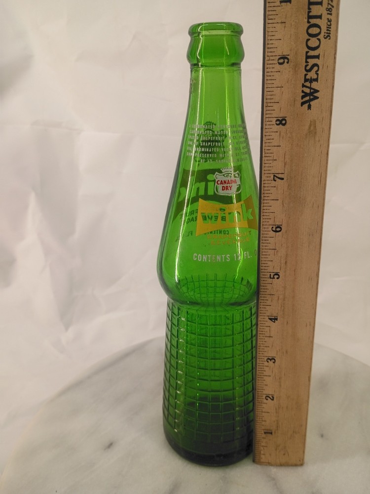 The product is a vintage 12 fl oz Canada Dry grapefruit soda pop bottle from the 1960s. It features a distinctive green glass color and is an original piece, not a reproduction. This collectible advertising item from the United States captures the nostalgia of a bygone era in the soda industry. Perfect for collectors of vintage memorabilia or fans of Canada Dry soda, this bottle is a unique and authentic piece of history. Thank you for visiting my listing today and thank you for your interest in this item! My goal is to have a pleasant transaction resulting in a satisfied customer. I hope any transaction between us leaves you with a feeling of confidence knowing you can trust me and the items I offer here. *Most if not all my listings are set to accept offers. Feel free to send an offer and I will be happy to consider it!! *Please contact me with any questions or concerns and I will be happy to help. *Always examine the photos carefully, and if in doubt, email me with any questions you may have. *Please note that condition statements are offered as a guide only. They will always be somewhat subjective and reflect our opinion, which may not necessarily agree with someone else's opinion. PLEASE READ: I aim to please and I want my buyers to have a positive transaction with me. If you have questions, concerns, or special requests related to any of my items I hope you will contact me so we can work them out to your satisfaction. I sell my items to give you a great item at a decent price while making a little profit at the same time. If you feel the item you are interested in is too pricey do not hesitate to send me a fair offer and I will consider it. My goal is to satisfy your needs and mine so both parties can benefit. SHIPPING: If you prefer a different shipping method or company please contact me and I will do all I can to make that happen. If you have concerns or requests about the packaging of your item contact me and I will do all I can to accommodate them. Shipping costs are based on location in each state or country, the costs always differ. After I have received your payment I will ship your item out within 3 business days or less excluding weekends and holidays. BEFORE PURCHASING & BIDDING: **Please see all the pictures. I do not have great photography skills but I try to get the most accurate photos I can. If you are unsure about something you see in a photo contact me so I can do what I am able to answer your concern about the item. **I cannot stress enough that if you have any questions or concerns please contact me before purchasing and bidding. Communication can solve so much. **As a customer myself, I understand the meaning of customer satisfaction and my goal is to have nothing but satisfied customers. If you are not unsatisfied with your purchase I ask that you please contact me so I can take care of your issue. My goal is for you to be 100% satisfied. INTERNATIONAL BUYERS WELCOMED - PLEASE NOTE: I welcome International buyers! Please be aware that any custom/duties/taxes that the parcel might incur once it is out of the USA are the responsibility of the buyer. Please check with your country's customs office to determine what these additional costs will be prior to bidding or buying. Please refer to the eBay Site Map for more information if needed.