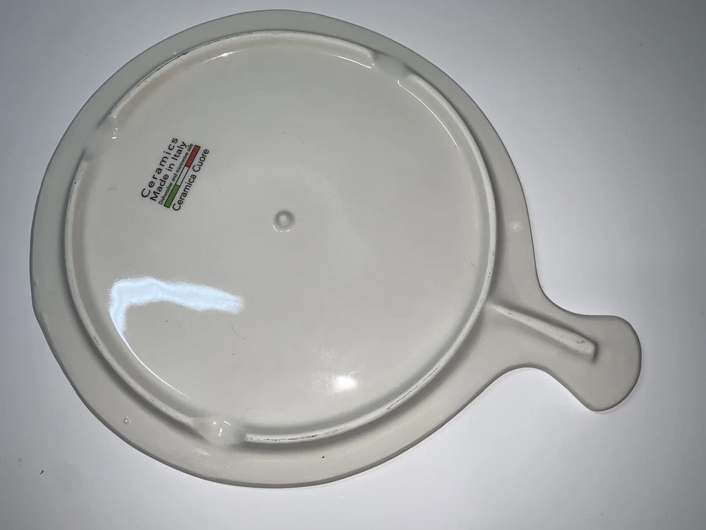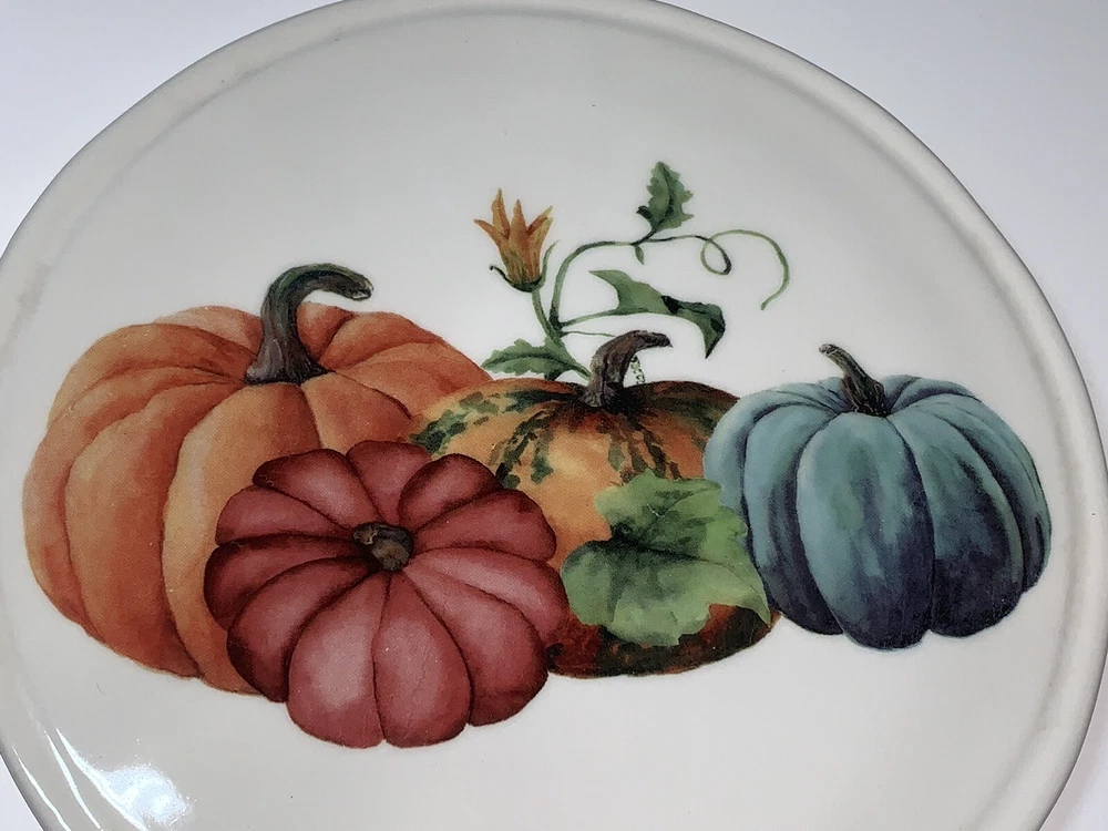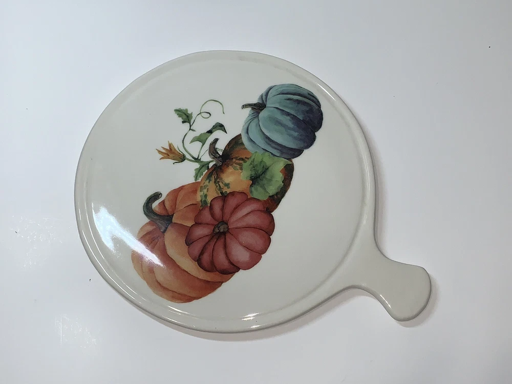 This vintage ceramic cheese plate by Ceramica Cuore is perfect for your Thanksgiving celebration. With a beautiful pumpkin pattern and a glossy finish, it adds a decorative touch to your farmhouse style. Made in Italy using pottery production technique, this cheese plate has a diameter of 8.5 inches and a height of 10 inches. The set includes a cutting board and trivet, and it is in excellent condition. This cheese plate is a contemporary original and is perfect for serving cheese and crackers to your guests. Celebrate the holiday season with this beautiful piece of decor. **See photos! Great condition with a little wear on the feet but not too noticeable.