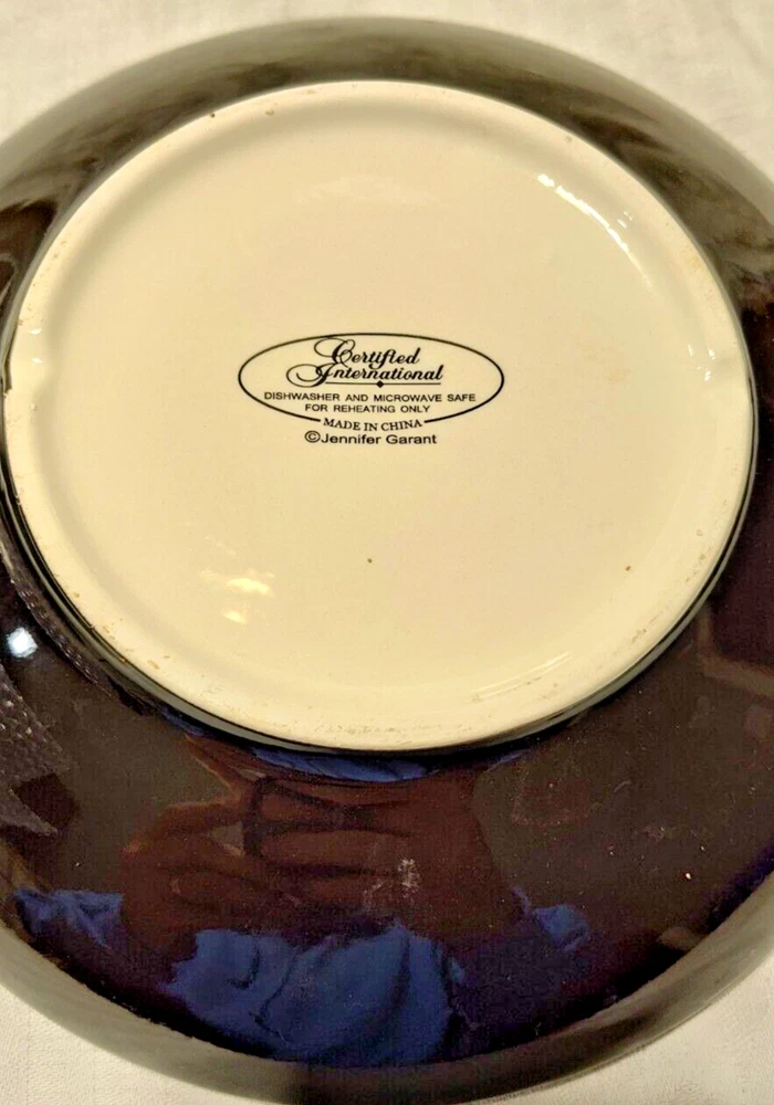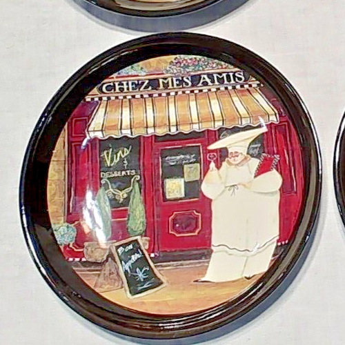 The Vintage Certified International Bistro Chef Pasta Plate set includes four 9-inch round pasta bowls made of bone china. The design features a vibrant multicolor pattern with an Italian theme, embodying a traditional style. Manufactured in 1998 by Certified International, these shiny-finished bowls are ideal for serving pasta dishes and adding a touch of charm to your dining table.