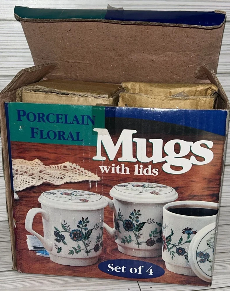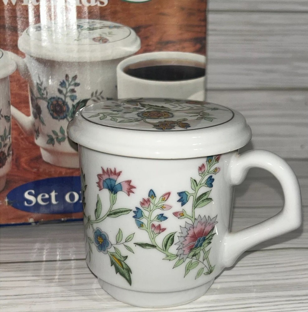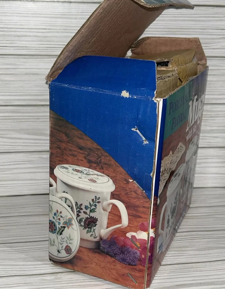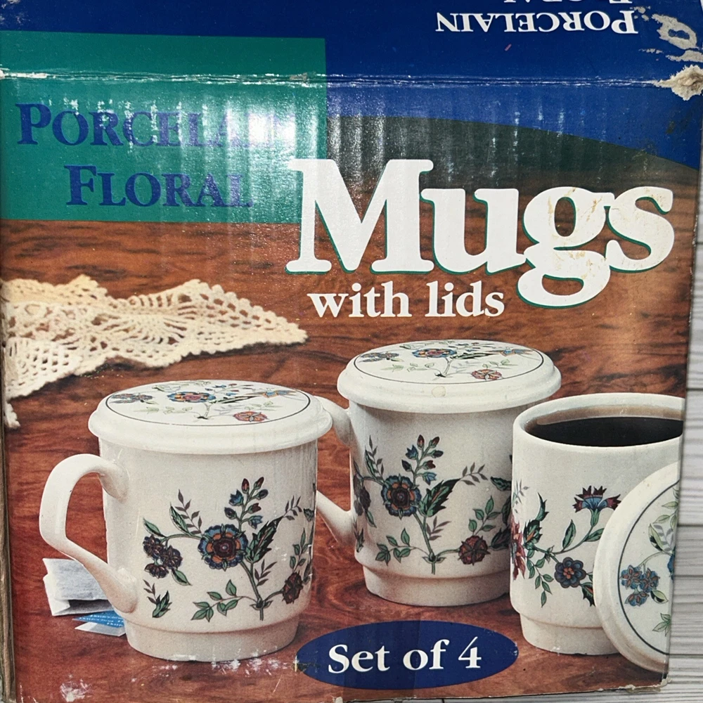 Vintage Circa 1998 NIB NOS Tea Mugs Cups With Lids Floral Porcelain Set Of 4 These Are New The Box Has Some paper missing and some damage but cups are all in new condition have never been used made in Georgia USA Very Cute Set