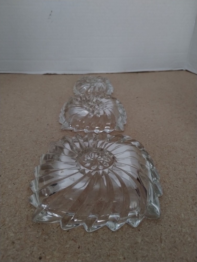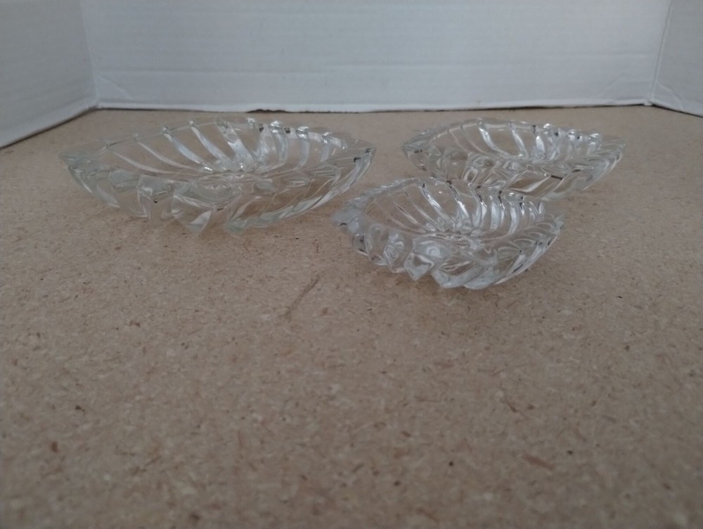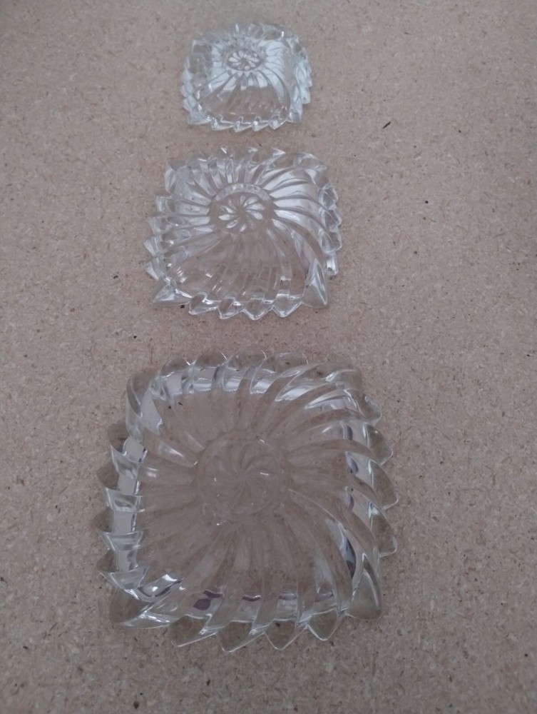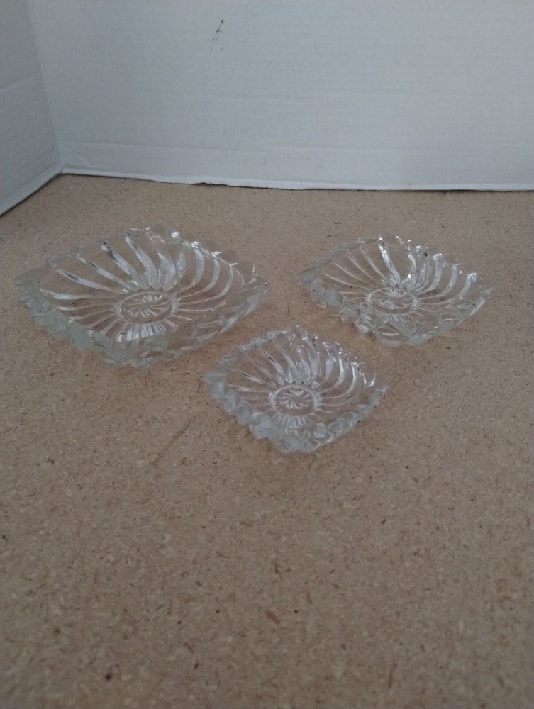 This set of three vintage clear glass snack dishes features elegant swirling patterns. Suitable for serving small snacks or displaying decorative items. Their transparent design allows them to seamlessly blend with any table setting or decor style. • Vintage design • Swirling pattern • Square shape • Clear glass • Multi-purpose use