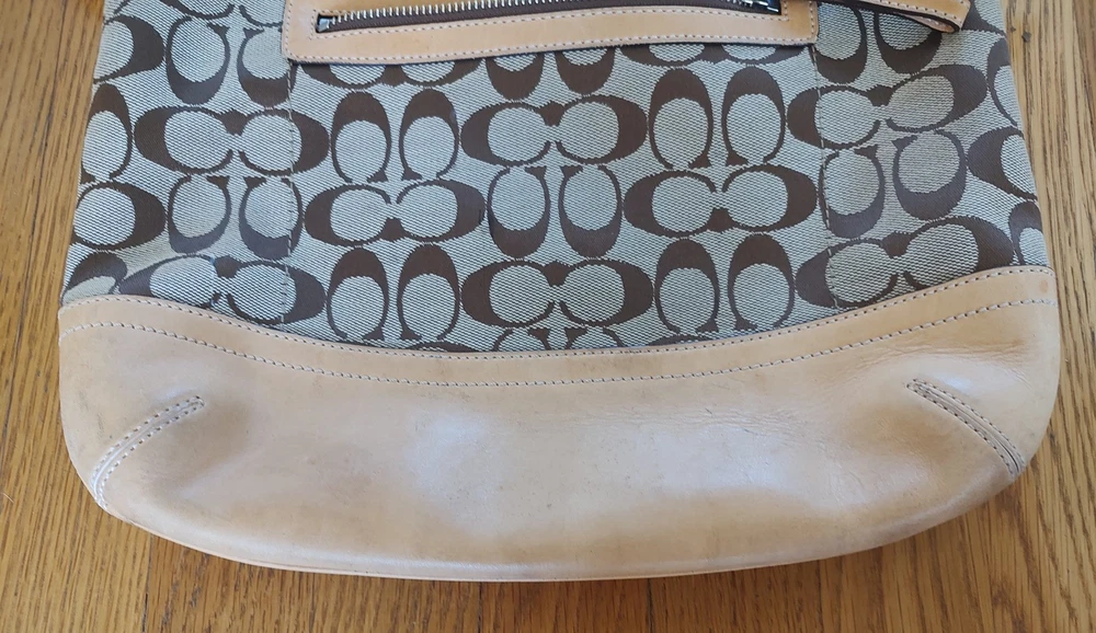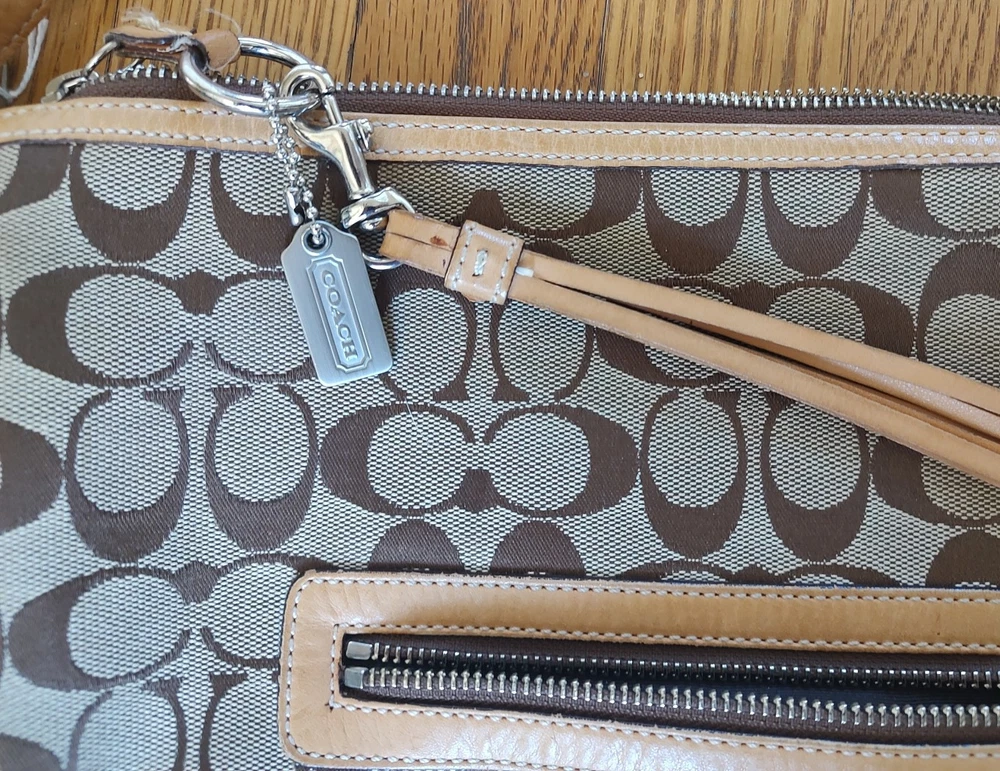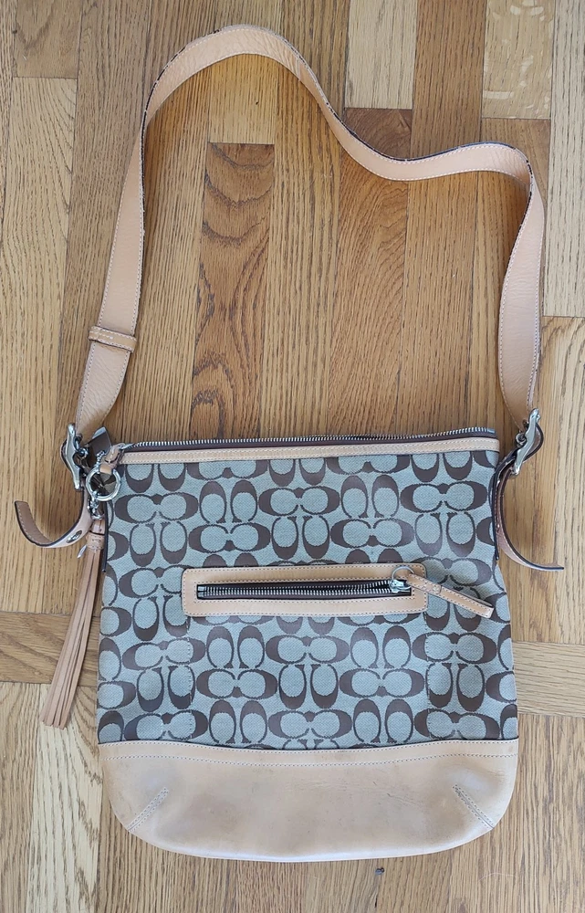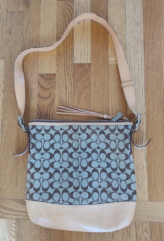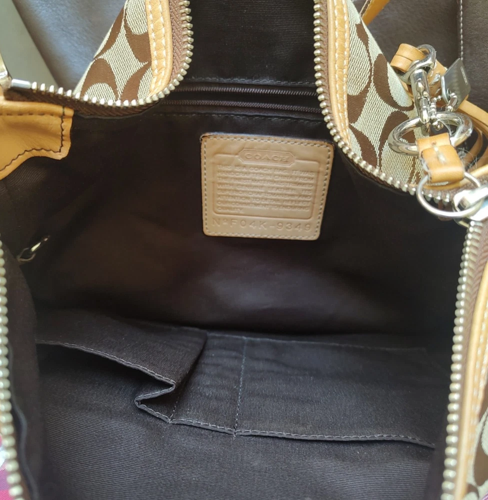 Vintage Coach Brown Signature Leather Jacquard bag crossbody 9349 Y2k Model: 9349. Condition is preowned. Shipped with Ground advantage. - Condition: Good condition. No holes rips or repairs. There is wear on the side of the straps per the photos and light marks on the botton of the purse per the photos. - Height: 26.5 cm - Width: 28 cm - Depth: 10 cm - Handle Drop: 56 cm Thanks for looking at this bag and Happy Shopping!
