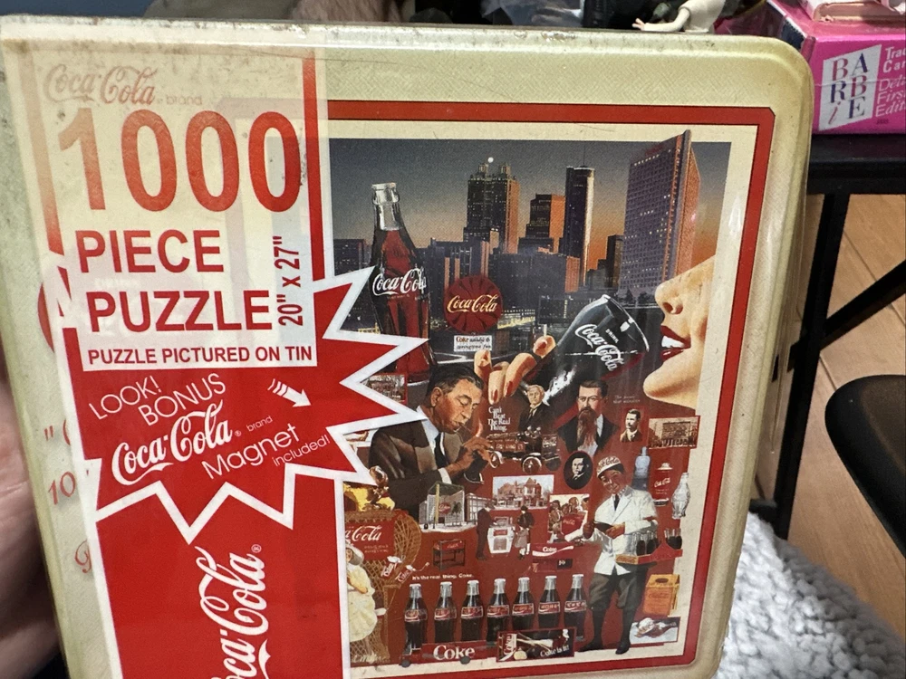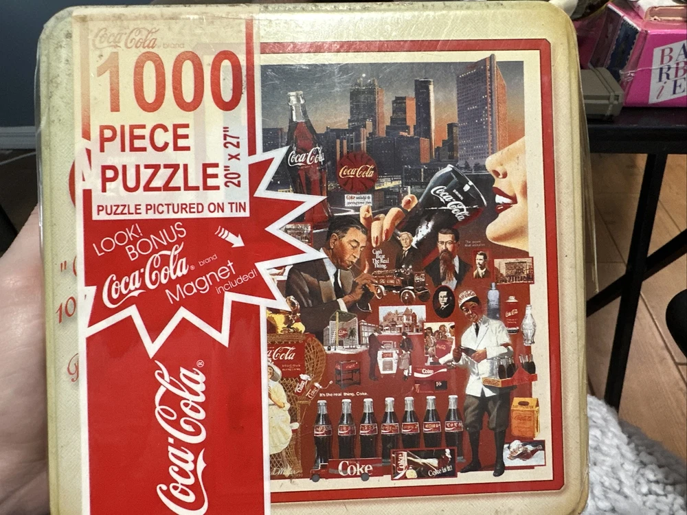 Brand:Coca-ColaNumber of Puzzle Pieces:1,000Size:20" x 27"Feature 2:Collector TinPackaging:Original in Unopened Shrink WrapOriginal/Reproduction:OriginalColor:Multi-colorCountry/Region of Manufacture:United StatesFeature 1:Bonus MagnetTheme:SodaAges:12 and upUPC:756621110146gtin13:756621110146Date of Creation:1998Modified Item:NoTitle:Coke HistoryType of Advertising:Puzzle