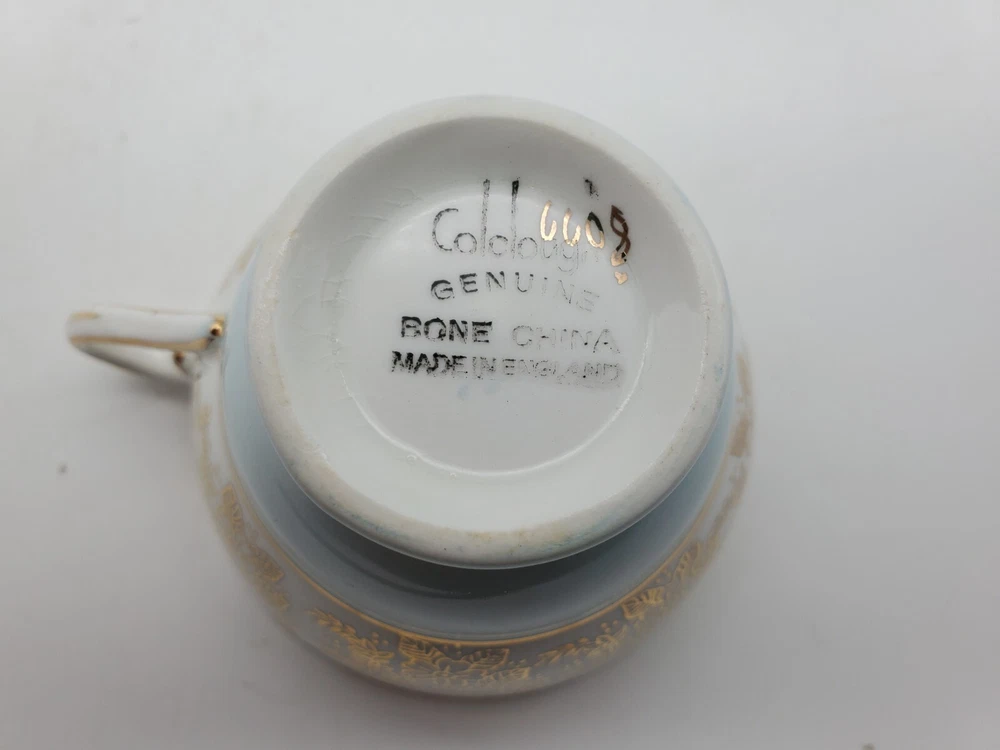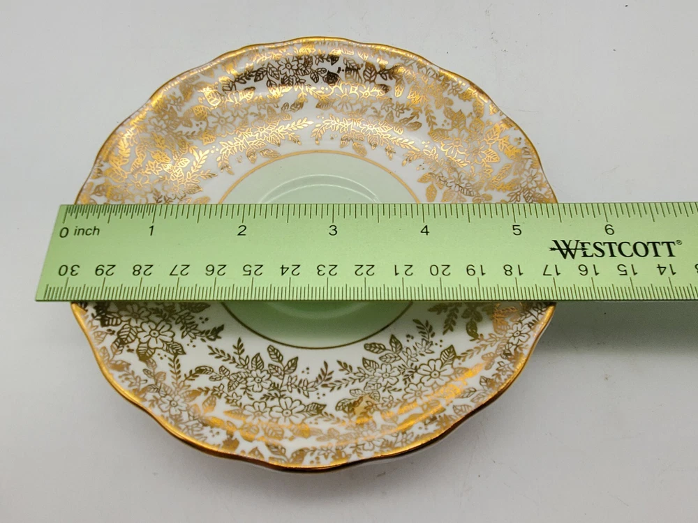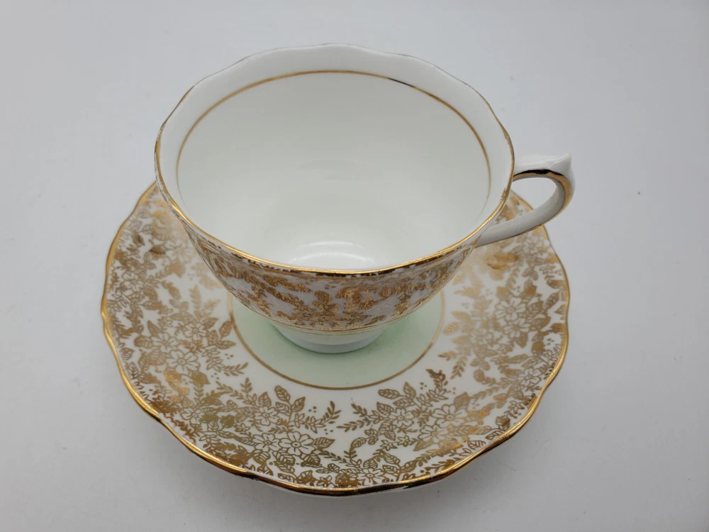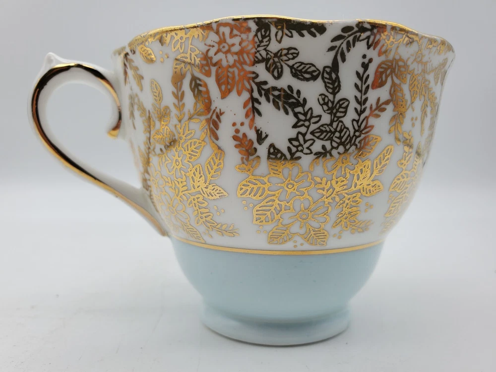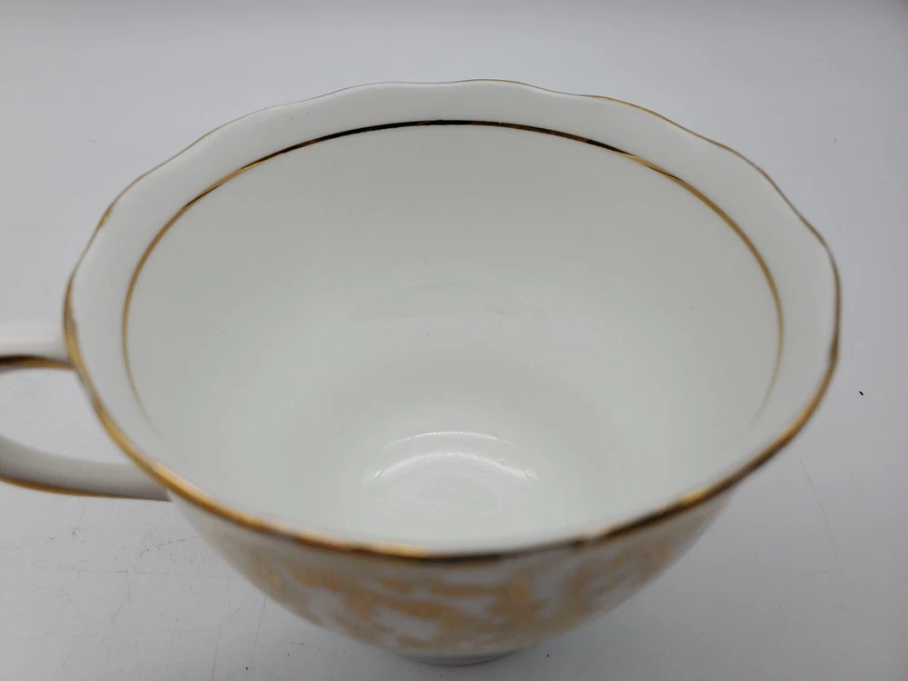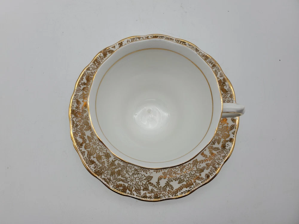This vintage tea cup and saucer set from Colclough China features a beautiful golden floral pattern that is sure to impress. The set includes a round-shaped tea cup and saucer, both made of high-quality bone china and hand-painted with exquisite details.