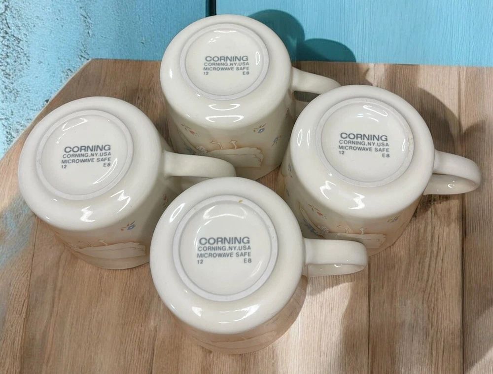 See pictures. There is a stain in the bottom of one of the mugs. Unable to get it off. Add a touch of vintage charm to your collection with this set of four Corning Country Goose Promenade coffee and tea cups. These limited edition mugs feature a round shape with a goose pattern and are made of durable, break/chip-resistant fused glass. Each mug has a 3-inch diameter and height, with a comfortable handle for easy grip. Not only are these mugs functional for everyday use, but they are also decorative with a glossy finish and printed backstamp. They are microwave and dishwasher safe for easy maintenance. Perfect for all occasions, these Corelle brand tea mugs are an original production from the United States and are a must-have for any collector.