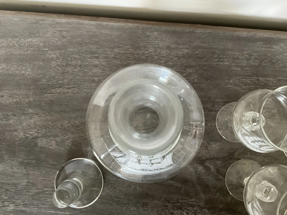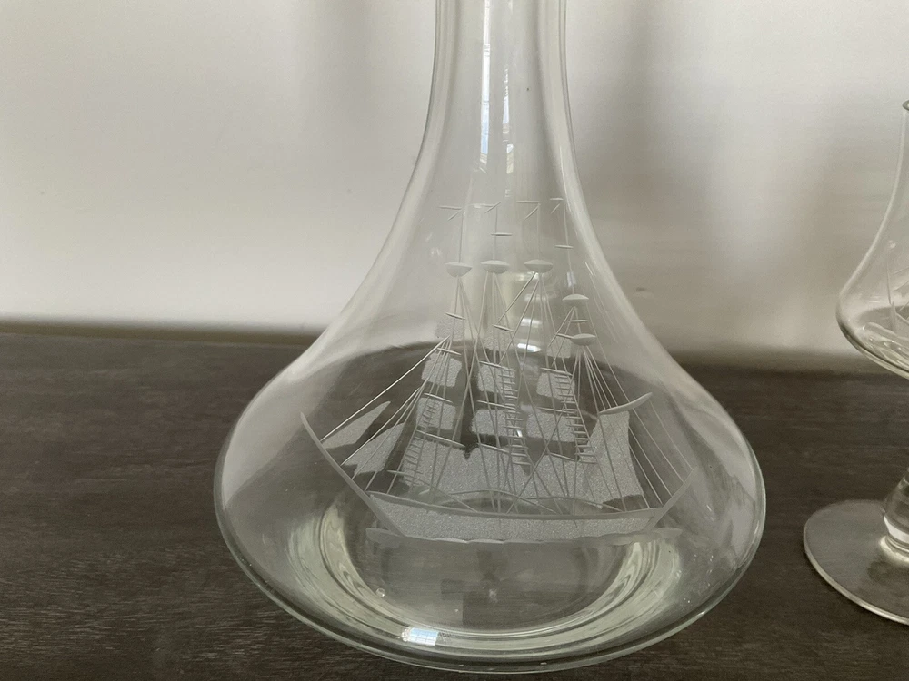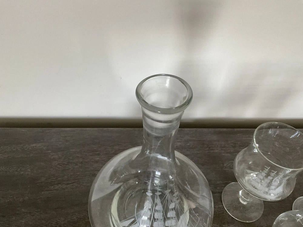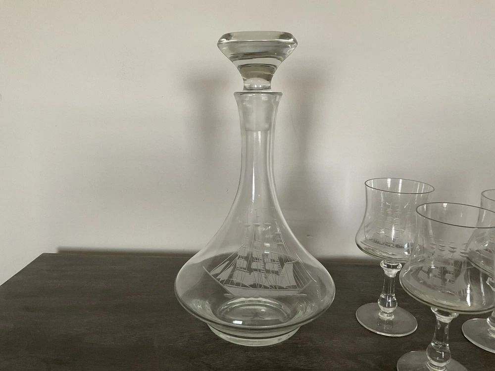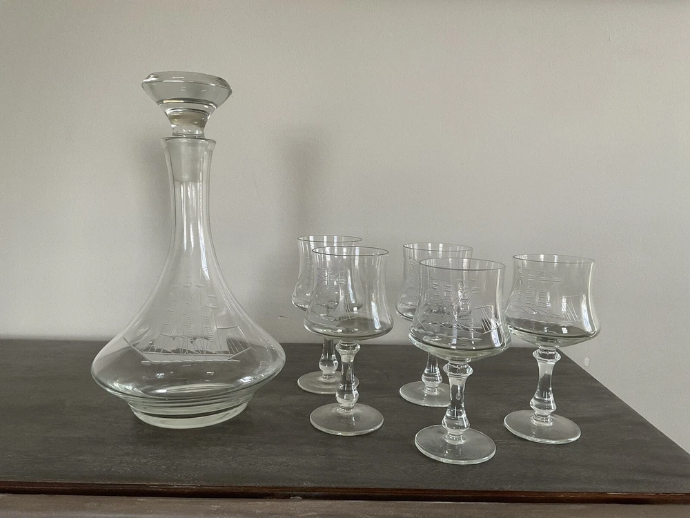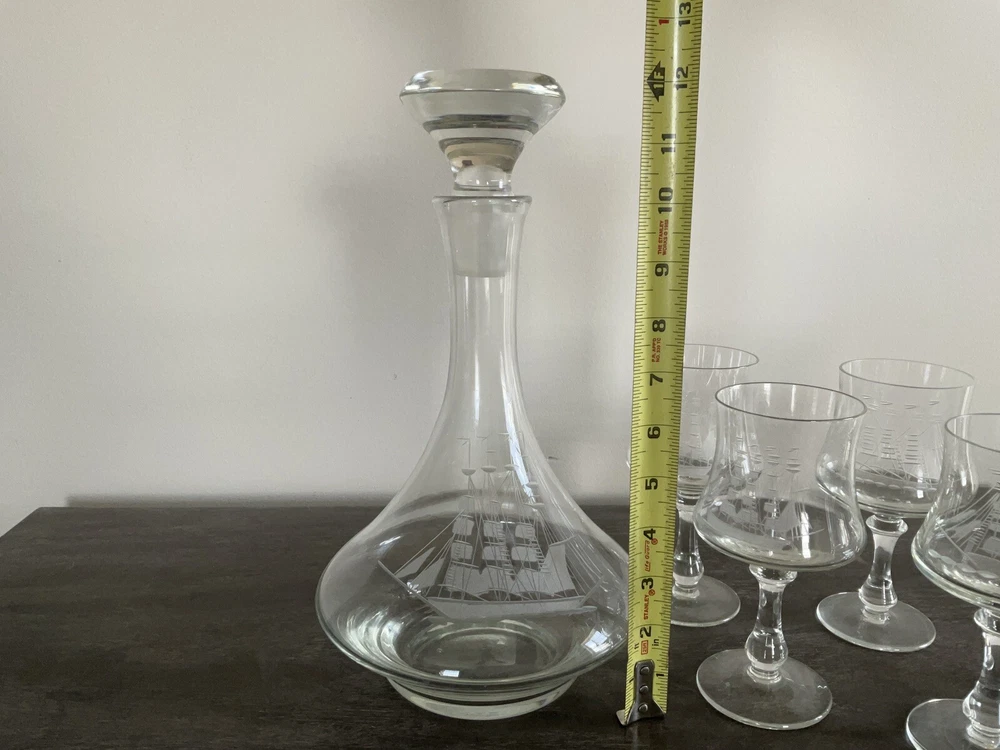 This vintage decanter set will surely elevate your barware collection. Crafted from high-quality crystal, adorned with intricate etched details of a clipper ship, and finished in a clear color, this set exudes a nautical style that will transport you to the sea every time you pour a drink. The set includes a decanter and five glasses, perfect for entertaining guests or enjoying a quiet nightcap. Add this collectible piece to your home bar or gift it to a loved one who appreciates timeless elegance.
