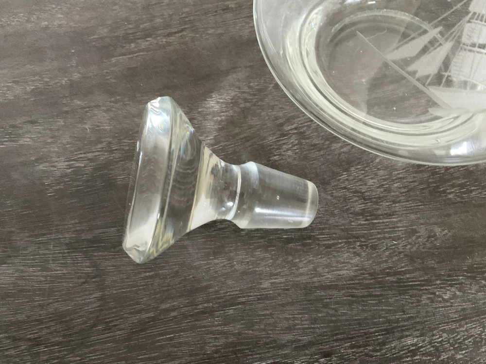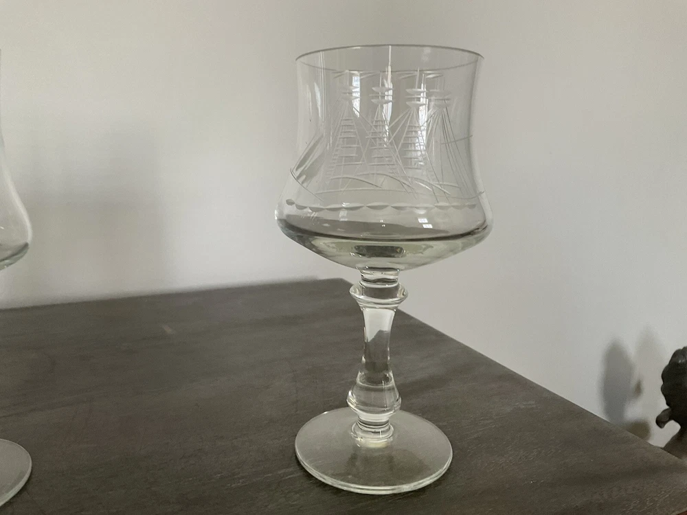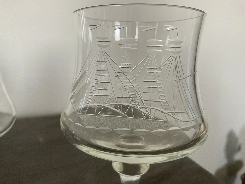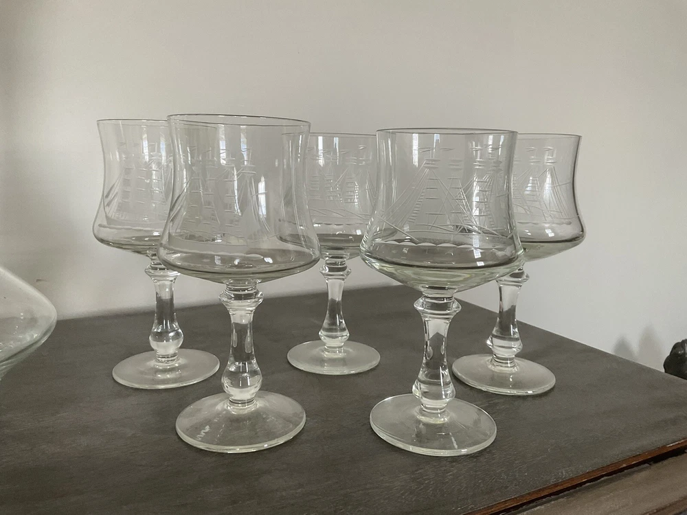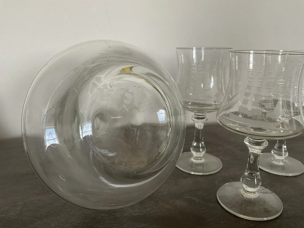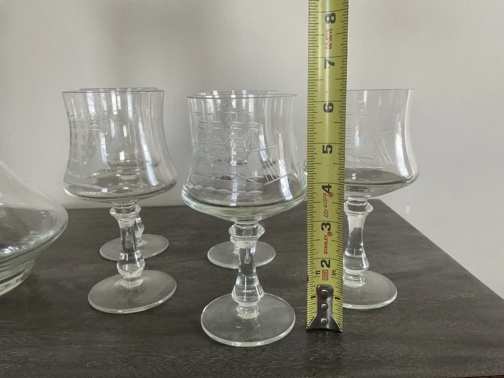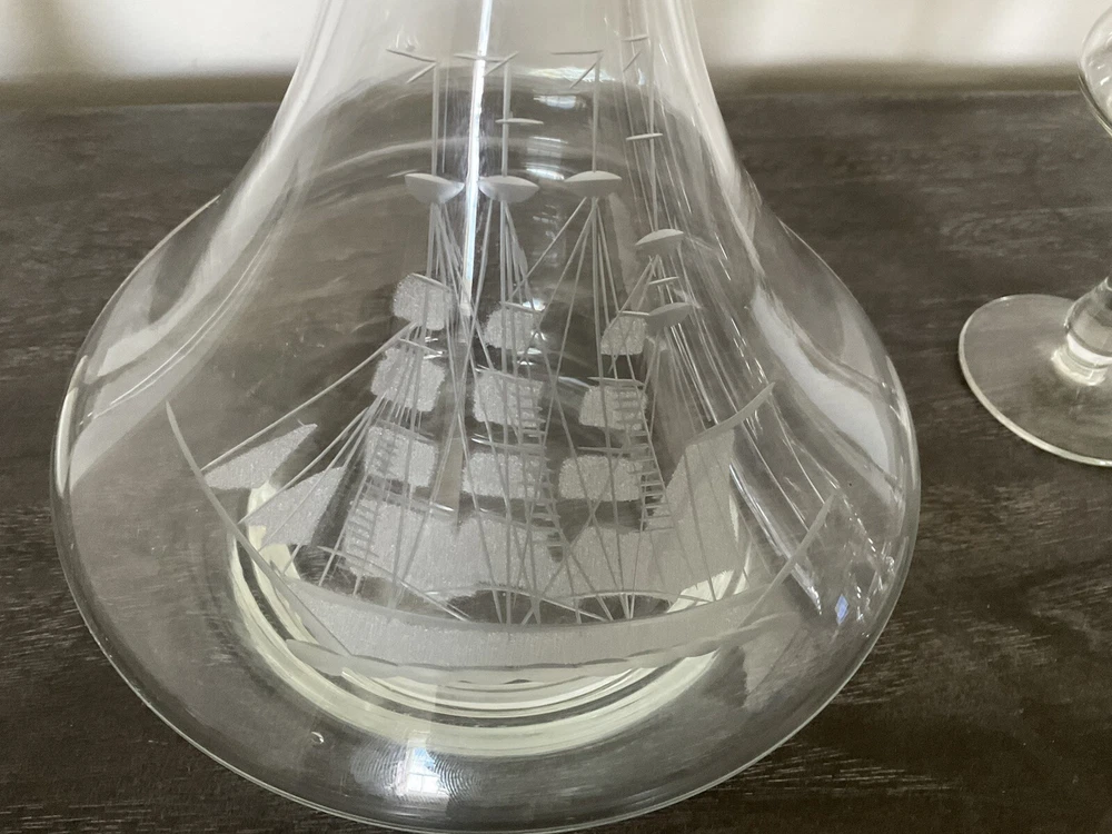 This vintage decanter set will surely elevate your barware collection. Crafted from high-quality crystal, adorned with intricate etched details of a clipper ship, and finished in a clear color, this set exudes a nautical style that will transport you to the sea every time you pour a drink. The set includes a decanter and five glasses, perfect for entertaining guests or enjoying a quiet nightcap. Add this collectible piece to your home bar or gift it to a loved one who appreciates timeless elegance.