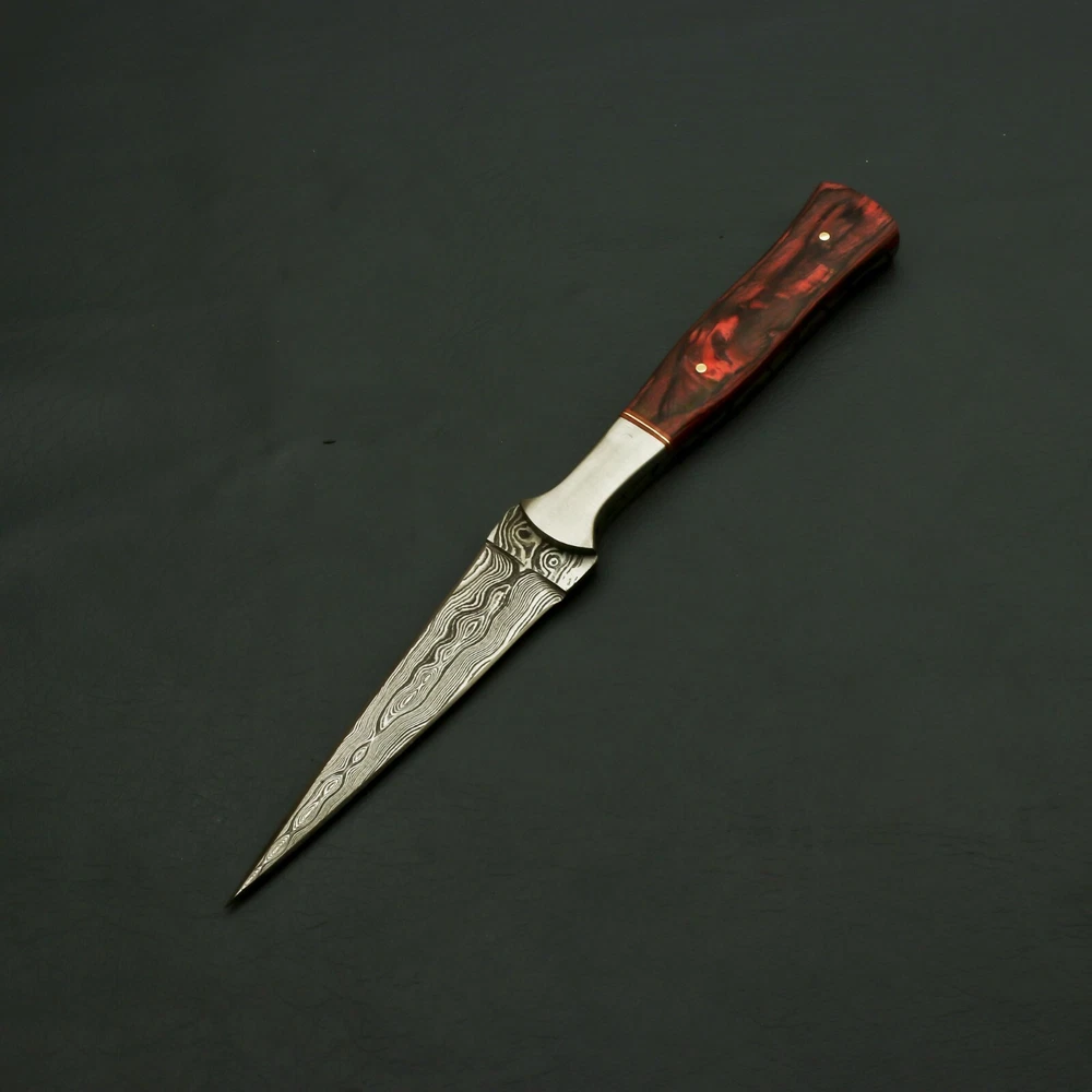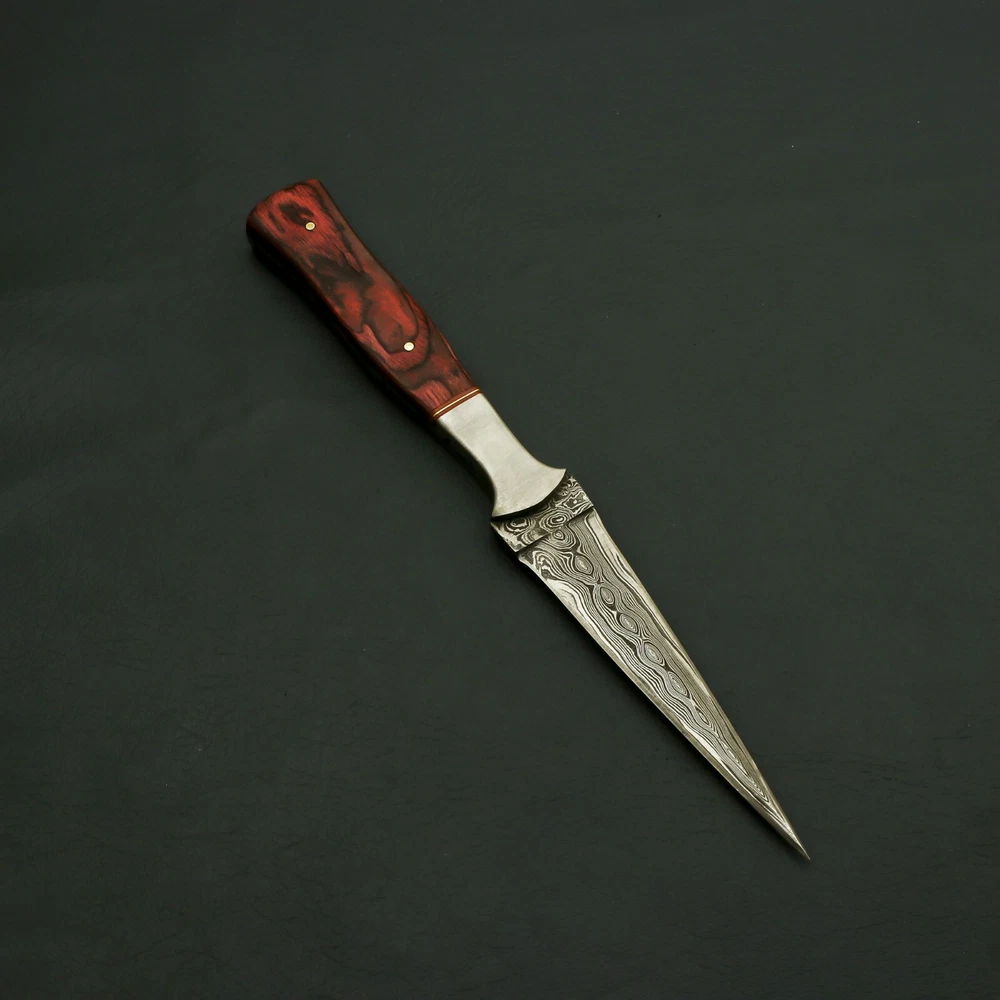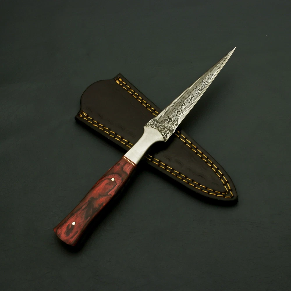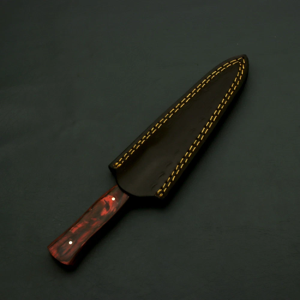 Brilliant Custom Handmade Damascus steel Hunting/Skinner handmade Knife / Sheath Behold the captivating masterpiece that is our Radiant Handmade Damascus Steel Knife with Enchanting Bolster and Custom Sheath. Immerse yourself in the enchantment of this exquisite blade, meticulously crafted to perfection with the finest materials and unparalleled craftsmanship. The heart of this extraordinary knife lies in its exceptional Damascus steel blade. Hand-forged by skilled artisans, the blade showcases the mesmerizing patterns of the Damascus technique, created by carefully layering and manipulating different types of steel. The result is a blade with striking visual appeal, as the intricate waves and ripples dance across its surface, making each knife truly one-of-a-kind. To complement its beauty and ensure its protection, this captivating knife comes with a custom sheath. Expertly tailored to fit the knife perfectly, the sheath is a testament to fine craftsmanship and attention to detail. It not only safeguards the blade but also adds an extra touch of sophistication and luxury to the ensemble. Manufactured with ultra-sharp hand forged Damascus steel cutting core at HRC58-60 hardness, this USA knife comes with unrivaled performance and incredible edge retention; Damascus steel outperforms high carbon steel in durability and is easier to sharpen as mix of high chromium steel enhance the other alloying elements. Perfect for hunting, fishing, hiking, camping, boating, backpacking, or any other outdoor adventure. It is also a key item to add to your survival tactical gear! Overall Length: 9” · Blade Length: 4.5” · Handle Length: 4.5” Handle is made of wood/rose/Pakka We do sell wholesale, please contact us for special discounts on bulk orders. FEEDBACK POLICY: YOUR FEEDBACK IS VERY IMPORTANT FOR US, IF THEIR IS ANY KIND OF PROBLEM PLEASE GIVE US OPPORTUNITY TO SORT THE ISSUE