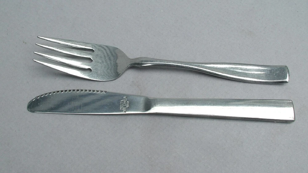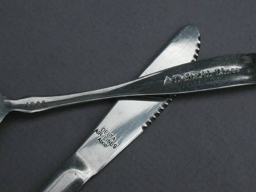 Description: Offered are vintage ABCO Stainless - DELTA AIRLINES - Flatware spoons ... The Two Delta Airline flatware pieces are: (a)- (1) 6-3/4" Dinner Fork (b) (1) 6-3/4" Dinner Knife ... Selling w/ No Reserve.. Condition: The 2 pieces of - Delta Airlines - Stainless flatware are Excellent Condition ... flatware is Shiny... Useage scratches... Maker Hallmark: ABCO Continental Shipping $5.50 ... I combine Shipping... Good Luck to All..
