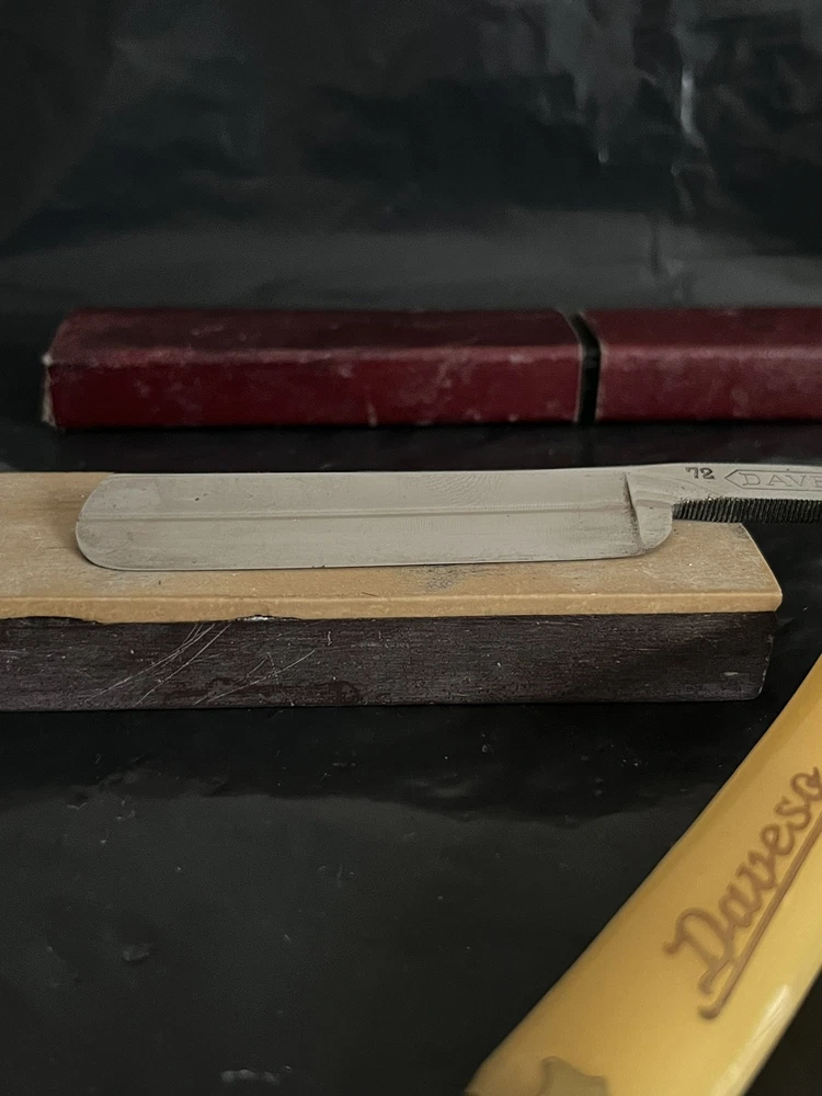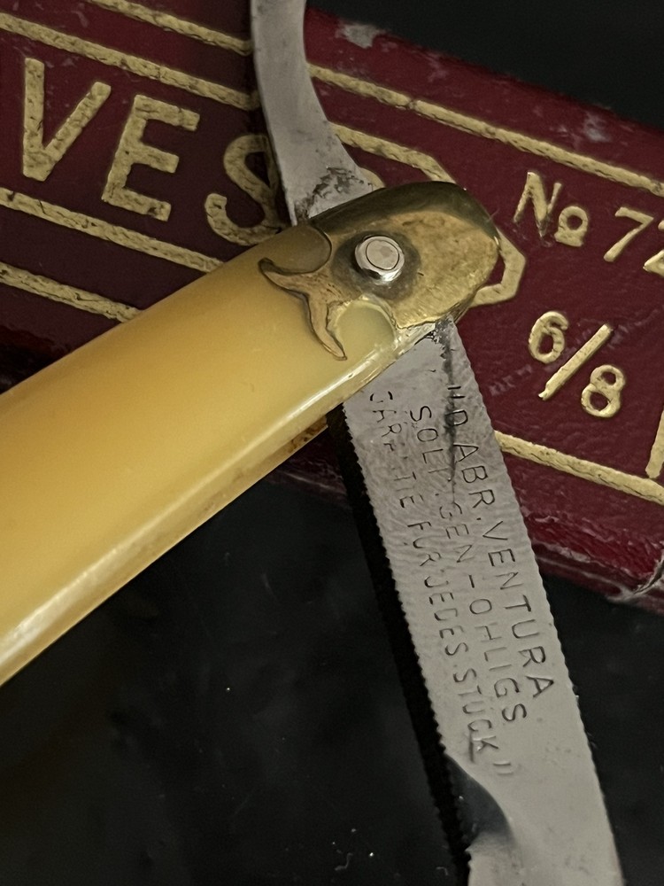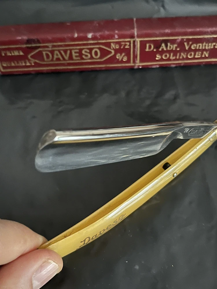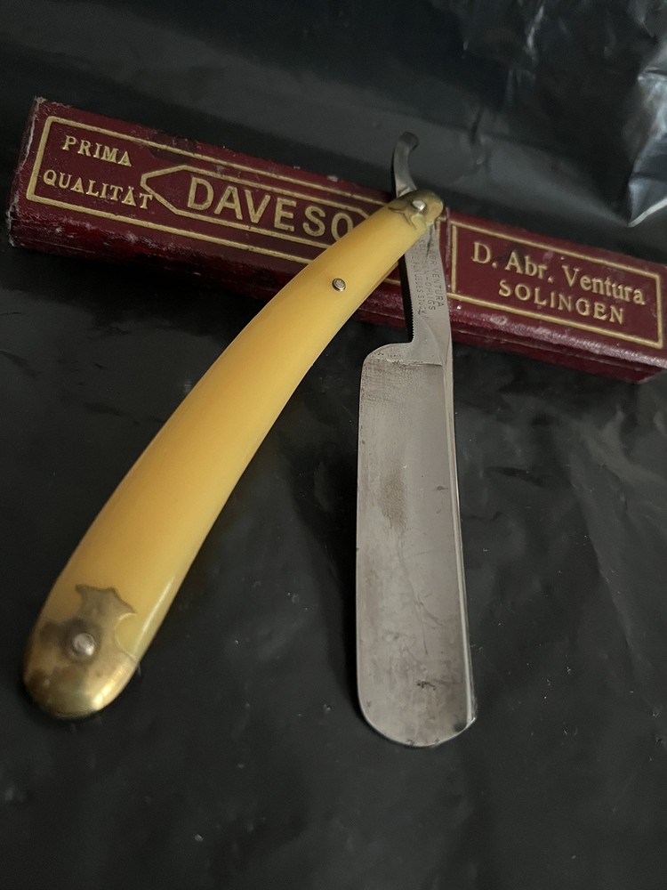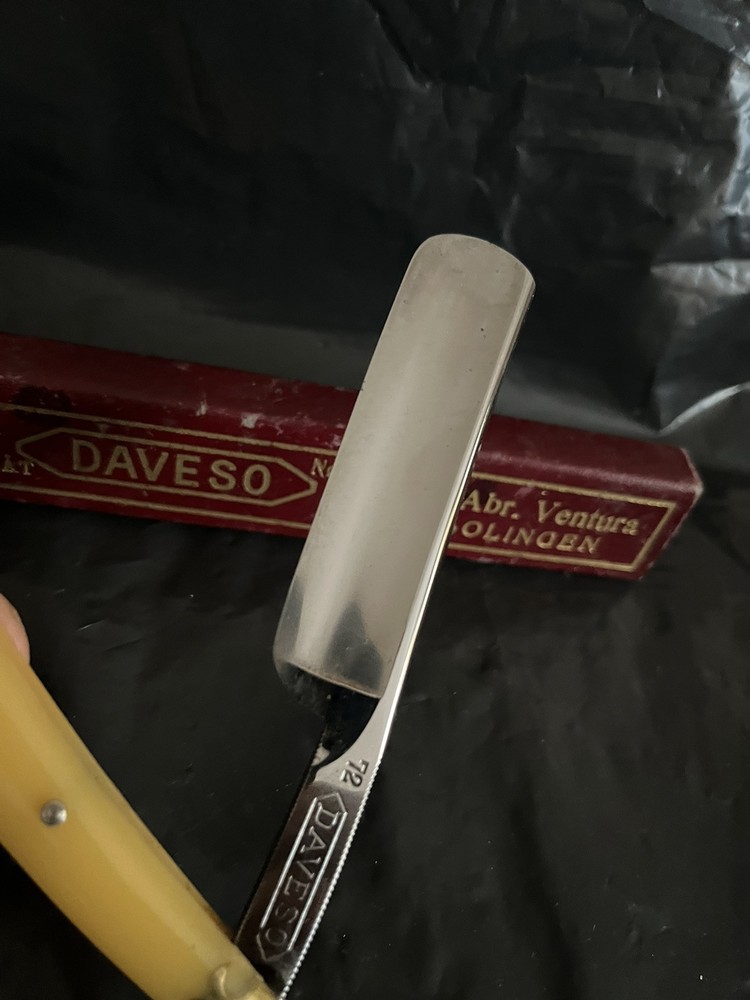Here is for auction Daveso D.Abr.Ventura Solingen 72 6/8 (21mm)in owerall very good conditıon with own box factory edge never honed see all photos as they are part of the description and do not hesitate for +photos and questions ,this item comes with exactly what is shown in the photos,the sharpening stone is not for sale.