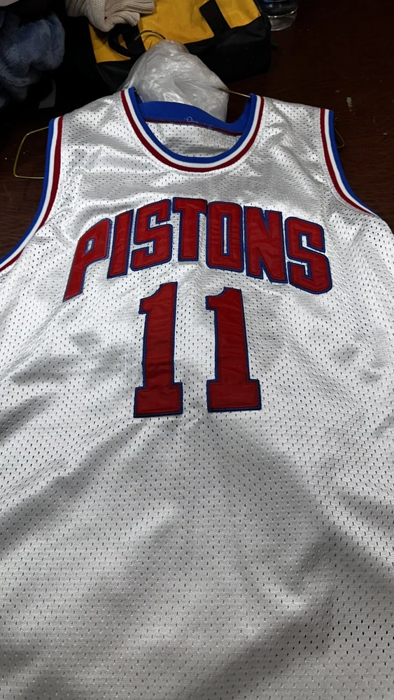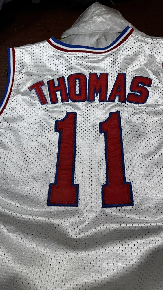 Own a piece of NBA history with this vintage Detroit Pistons Isaiah Thomas Sand-Knit basketball jersey. Made in the United States, this officially licensed jersey features the iconic #11 worn by the legendary Isiah Thomas during the 1980s. The white color and XL size make it a perfect addition to any basketball fan's collection. This Sand-Knit jersey is a must-have for any Pistons fan or basketball enthusiast. Show off your love for the game with this unique and rare piece of memorabilia. Get yours today!