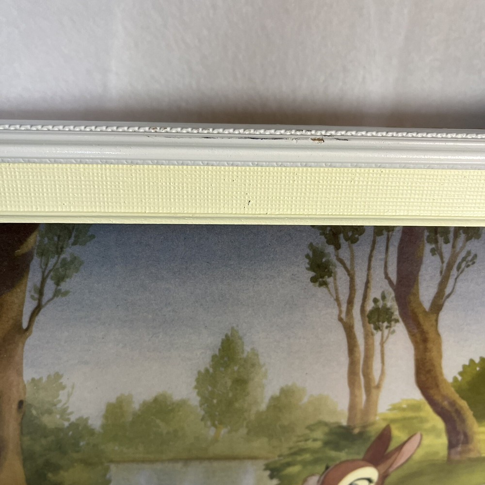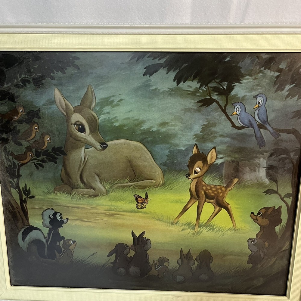 Few marks on the frames see pics These 2 beautiful framed art features Disney's Bambi meeting his friends in the forest. The vintage design is perfect for any Disneyana collector or fan of the beloved character. The piece measures 20 x 24 inches and is in great shape, ready to be displayed in your home or office. The art captures the essence of Disney's magic, showcasing the beauty of the forest and the joy of Bambi's adventure. The piece is a must-have for any fan of the franchise and is sure to be a conversation starter in any room. Add this amazing piece to your collection today!