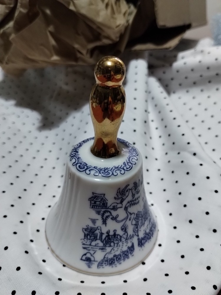 The Vintage Enesco Asian Village Scene with Birds White and Blue Collector Bell is a small porcelain bell with a glossy finish, measuring 4 inches in height and 2.5 inches in diameter. Enesco, a renowned brand, crafted this bell in Japan, featuring a beautiful blue and white color scheme. Perfect for collectors of decorative items, this bell is a charming addition to any collection, showcasing a unique Asian village scene with birds motif. Easy to clean with a damp cloth, this bell is sure to bring a touch of elegance to any home decor.