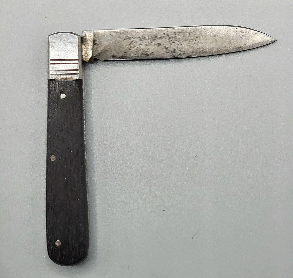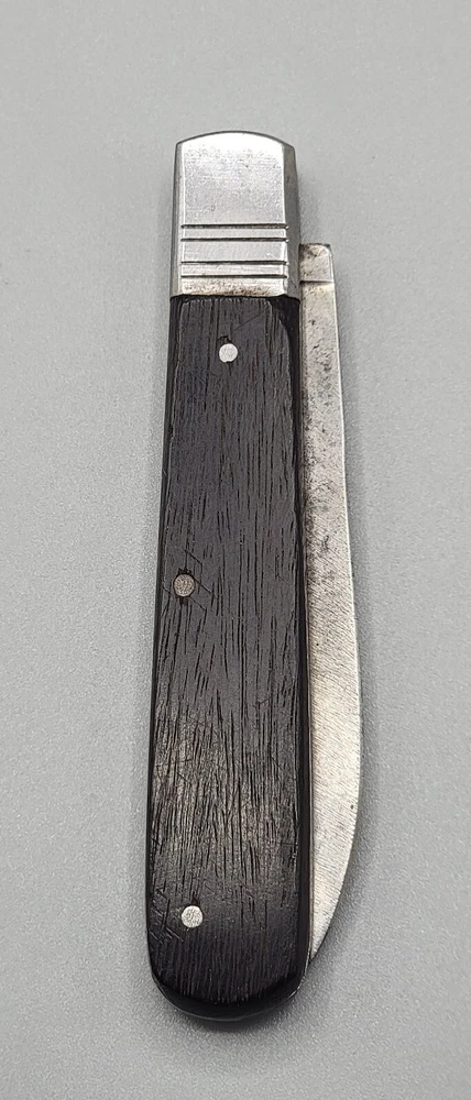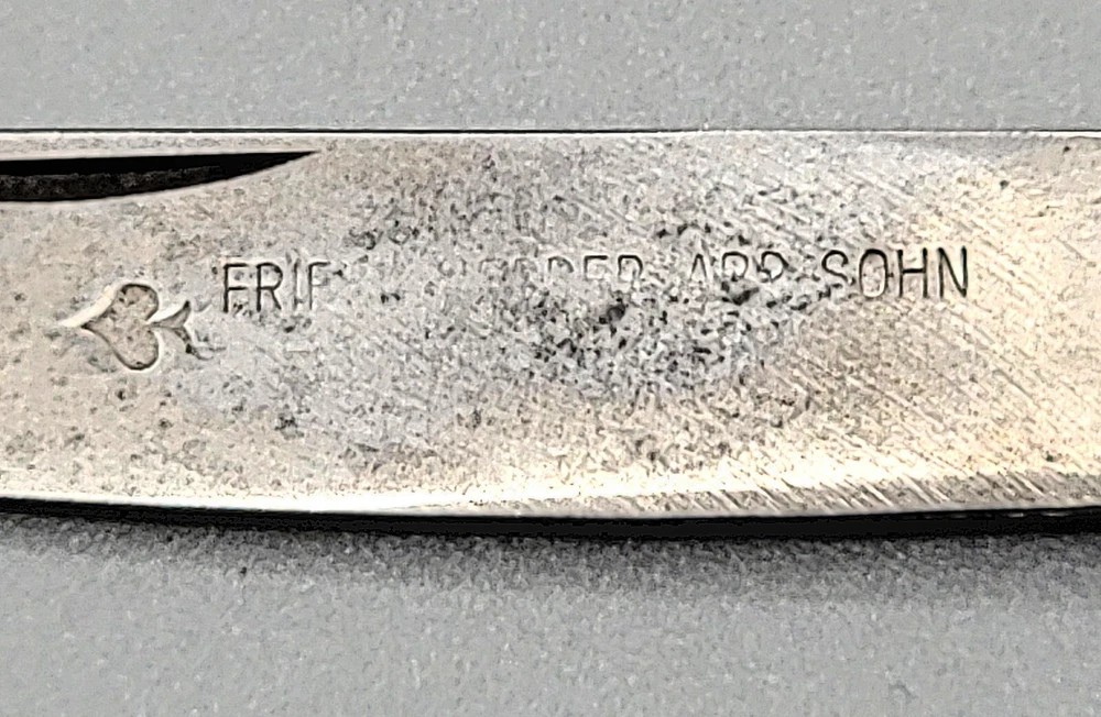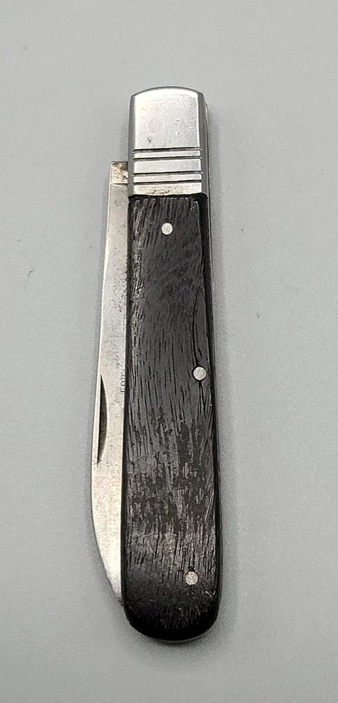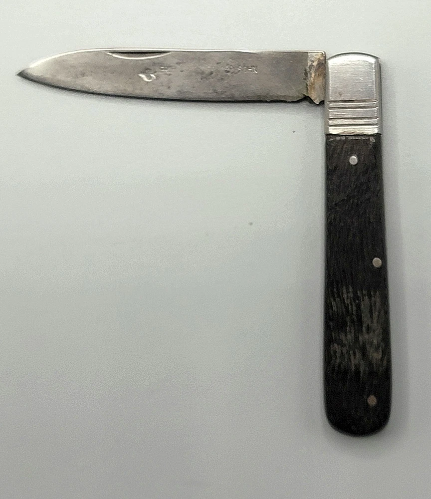 This vintage pocket knife from FRIEDR HERDER ABR SOHN has a beautiful black wood handle and a single blade with a plain edge. The lockback mechanism ensures safe handling and the manual opening mechanism adds an old-school charm to it. The knife is an original piece from Solingen, Germany, where the brand originated. It is a collectible folding knife that belongs to the categories of factory manufactured, vintage folding knives, collectible folding knives, knives, swords and blades, and collectibles. The country/region of manufacture is Germany and the brand has been known for its quality craftsmanship for years. This pocket knife is a rare find for those who appreciate vintage knives.
