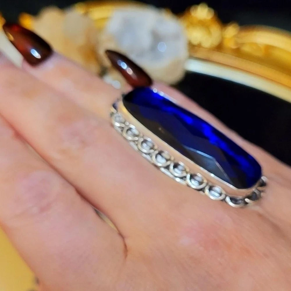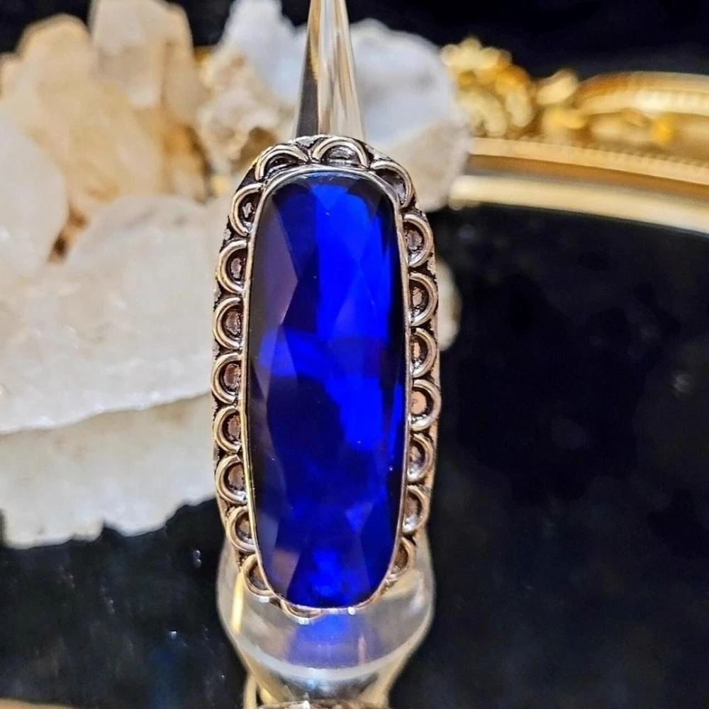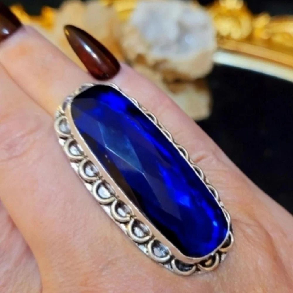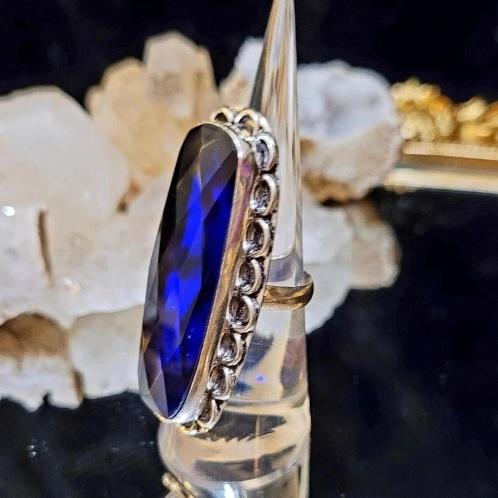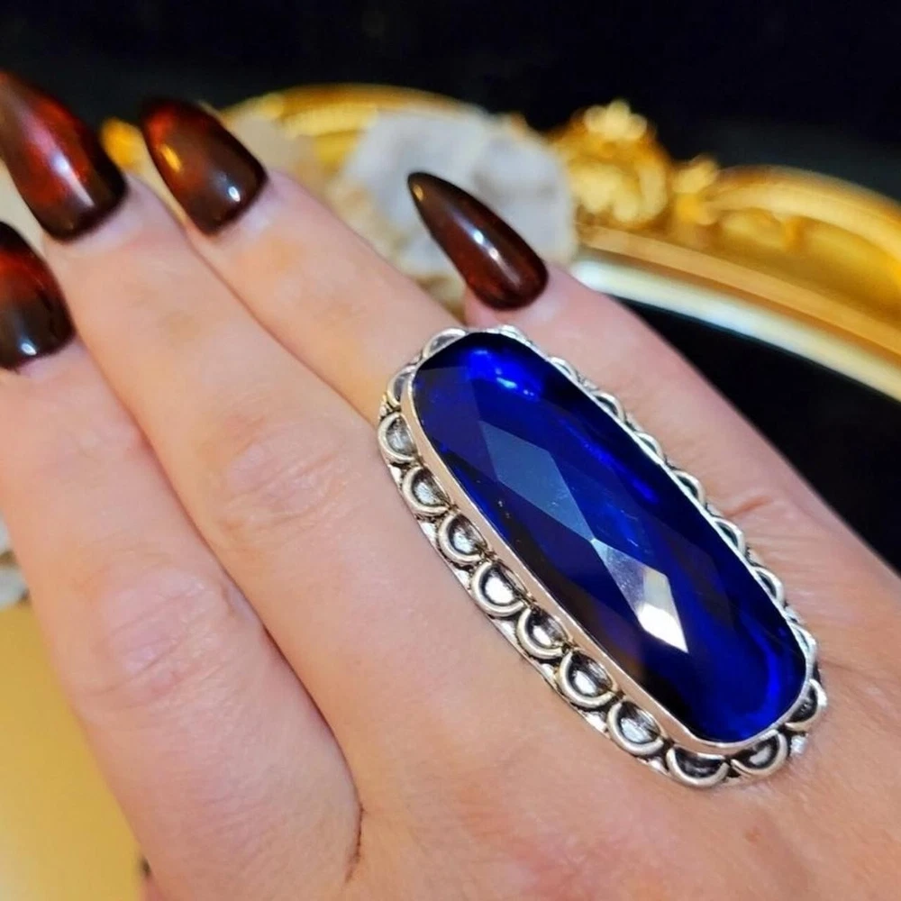 Elevate your jewelry collection with this stunning vintage cocktail ring. The oval-shaped lab-created blue sapphire stone is set in sterling silver with a bezel setting style. This ring is perfect for any occasion, including engagement, Mother's Day, Christmas, anniversary, birthday, or Valentine's Day. The vintage style of this ring adds a touch of elegance and sophistication to any outfit. This ring is a one-of-a-kind piece with a ring size of 8 and is made in India. The metal purity of this ring is 900, and it is perfect for those who love band style rings. This ring is a must-have for any jewelry enthusiast and is sure to make a statement. Size 8 * From my own personal collection Stamped .925 Sterling Silver It's gorgeous and can be worn day or night. Great staple to any jewelry collection. Stones created in a lab are chemically & optically identical to those mined underground, but they have few flaws, a lighter carbon footprint, and are less expensive. The surface of a faceted gemstone is cut and polished into many small, flat facets that amplify light reflection. Faceted gemstones are often used in jewelry and are ideal for creating a classic, elegant look.