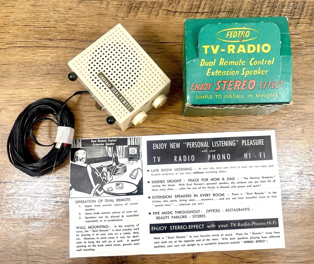Vintage Fedtro TV/Radio Personal Dual Remote Control Extension Speaker w/ Box. Very cool piece of you’re into vintage electronics. Includes original box & paperwork/Instrucyion sheet. Looks to be new or very lightly used. Untested as I have no idea & not worth electrifying myself 💛 Measures approximately 4 inches long, 3.5 inches tall and 3 inches deep. Please let me know if you have any questions. Thank you!