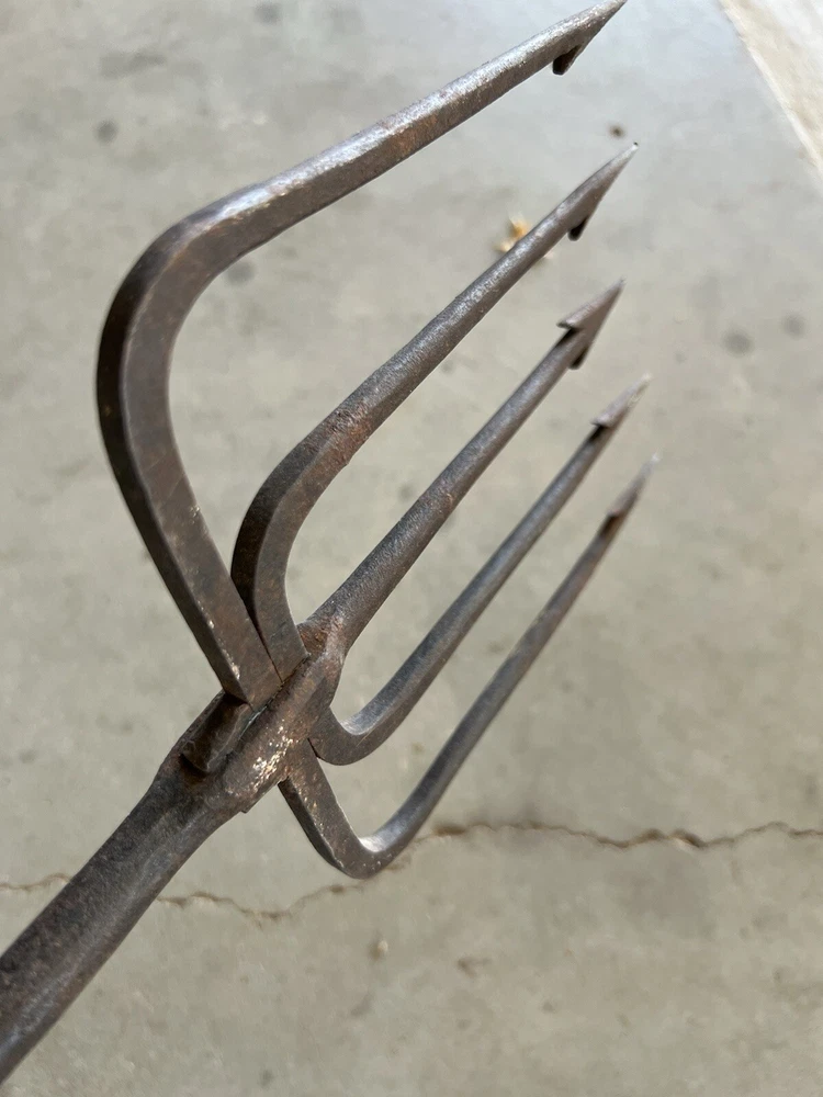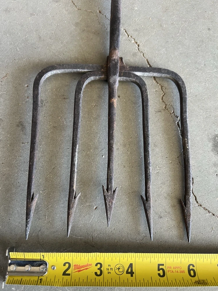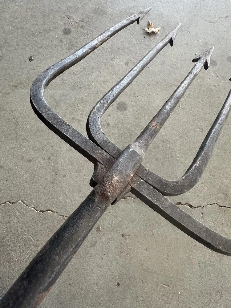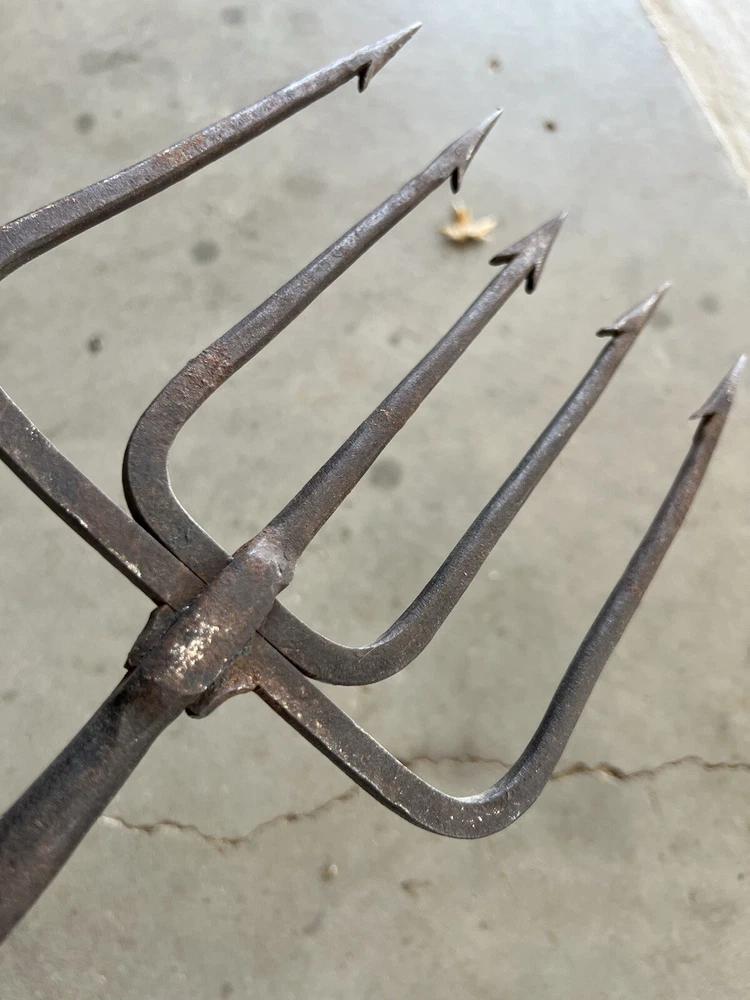Vintage Fishing Spear Iron Barbed Trident Gaff with Wood Shaft