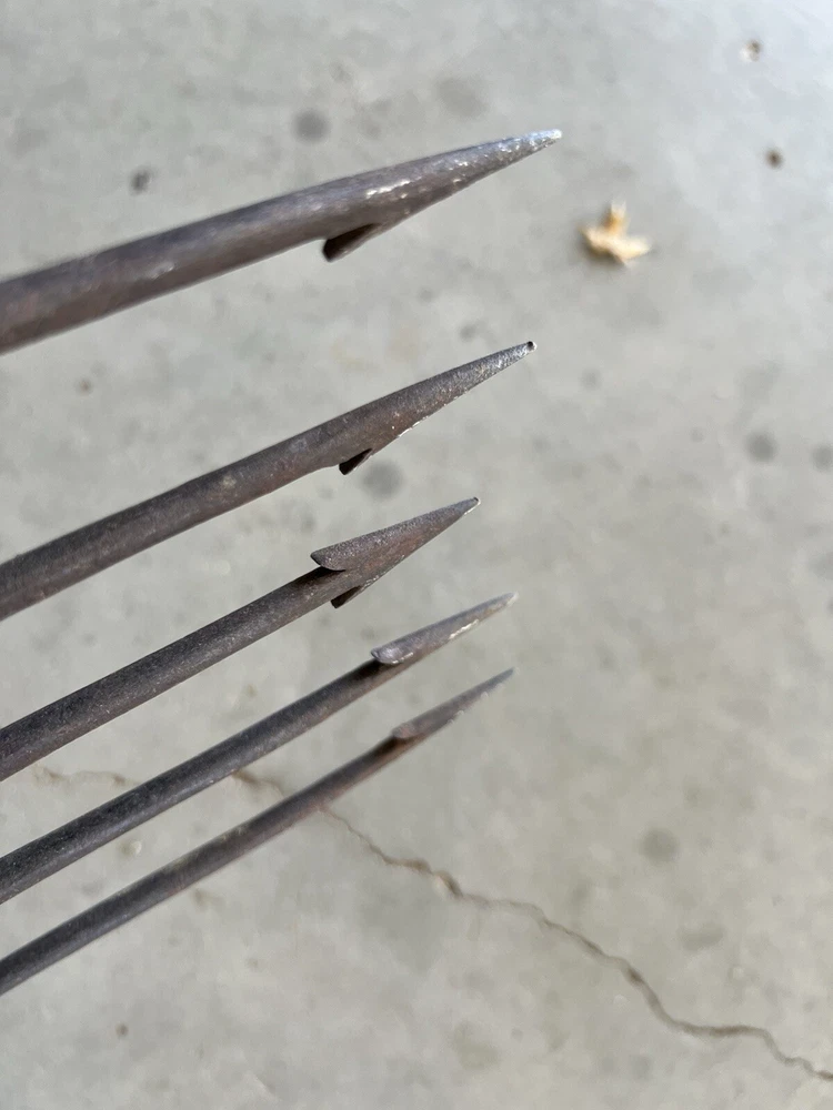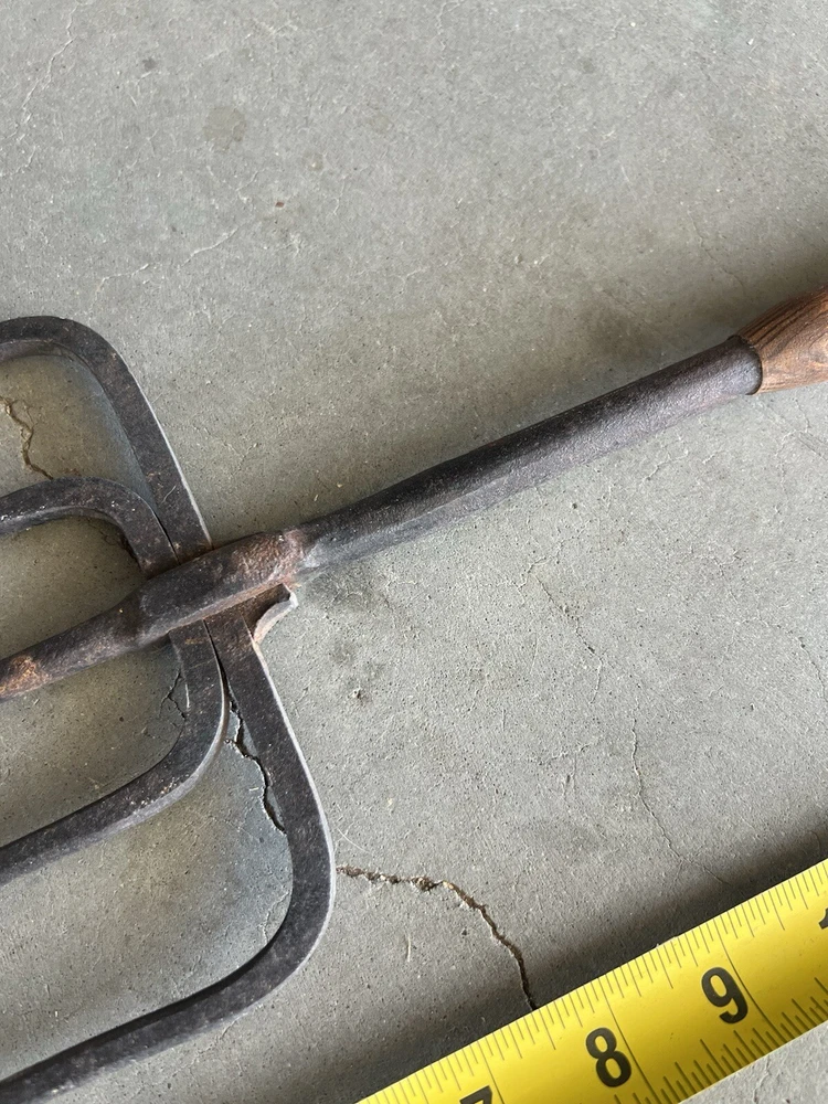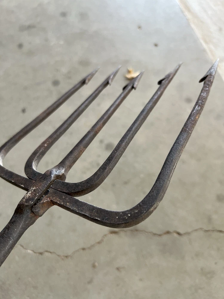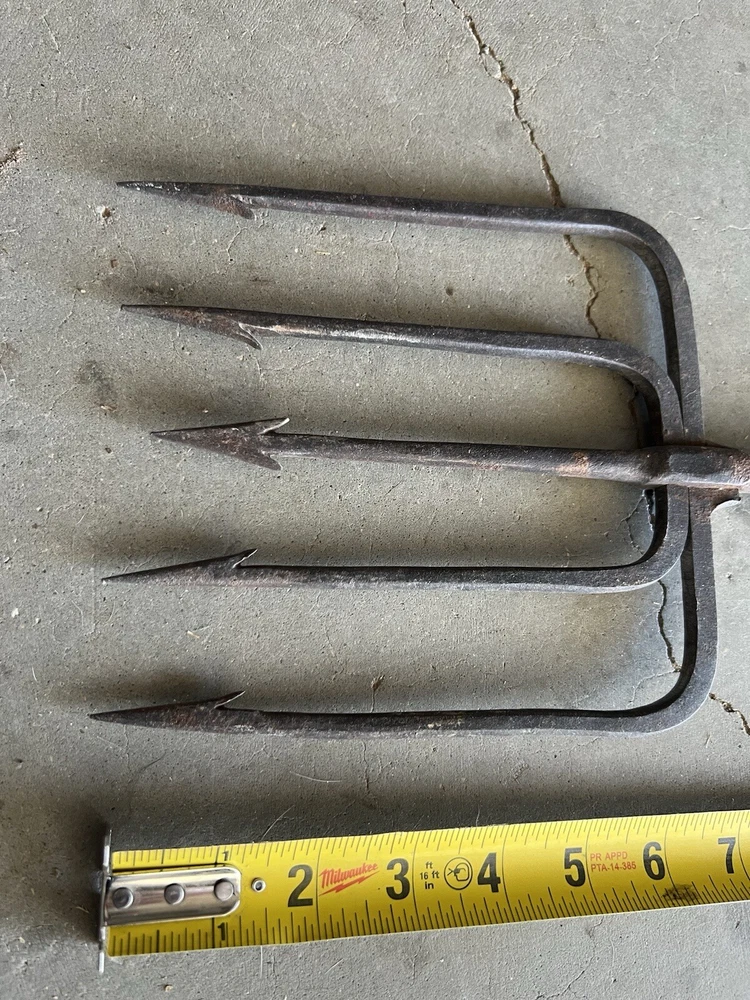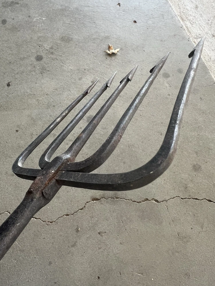 Vintage Fishing Spear Iron Barbed Trident Gaff with Wood Shaft