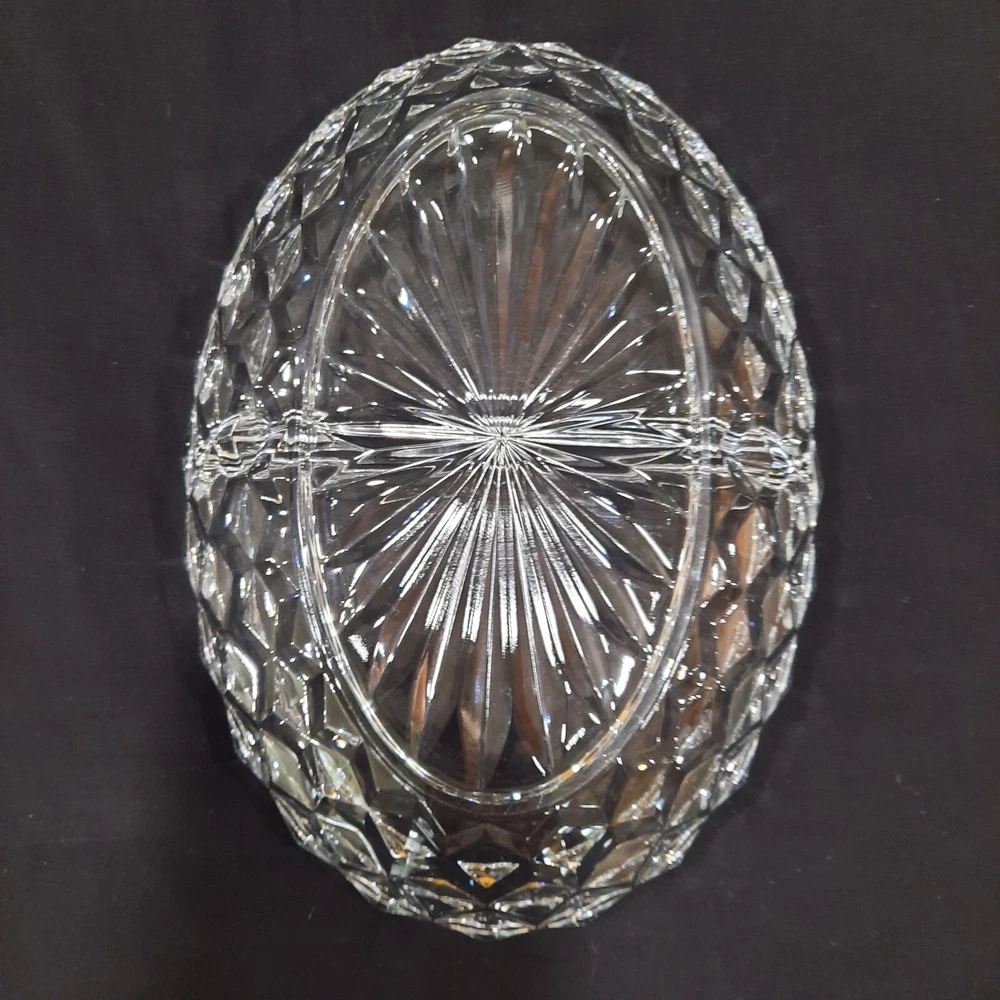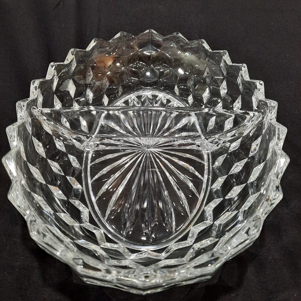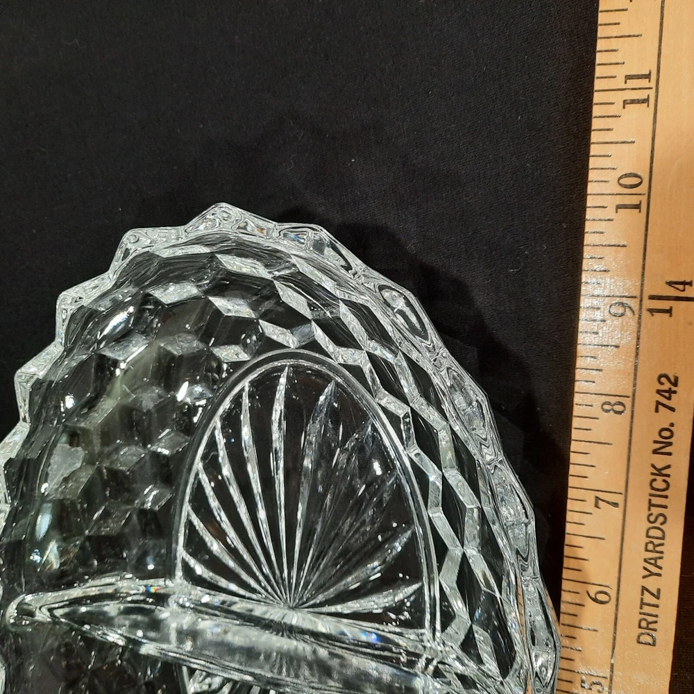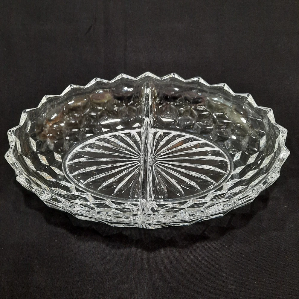 This vintage Fostoria American Clear Glass Divided Dish features an elegant oval shape with a geometric design, measuring 10 inches in diameter and 2 inches in height. Made of clear glass, this dish was manufactured in the United States as part of the American Clear product line. The Fostoria brand is known for its elegant glassware, making this item a stylish and vintage piece for serving various dips or snacks.