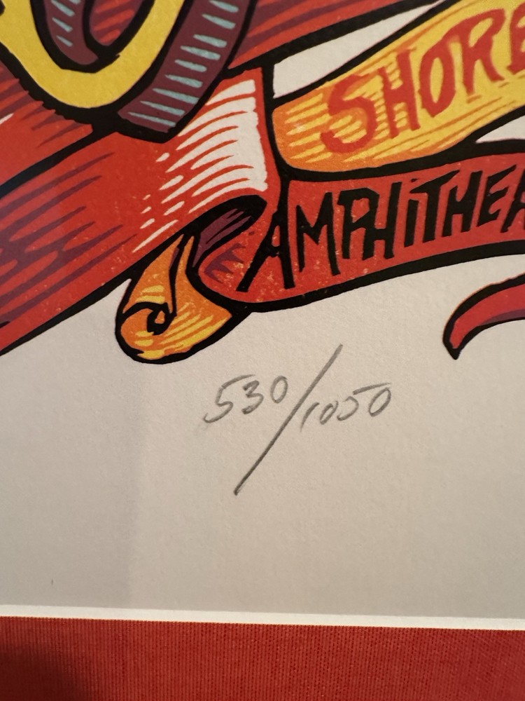 Capture a piece of music history with the 30" X 24" Framed Dead & Company Concert Poster from their performance at the Shoreline Amphitheatre, in Mountain View, CA on July 2-3, 2018. Rare numbered poster # 530 of 1050. Poster artist is AJ Masthay. Poster signed by artist. Excellent condition. Celebrate the iconic Grateful Dead spin-off with this original piece, a must-have for any collector or fan of the rock and pop genre. Expertly crafted in the United States, this poster is not just a visual memento but a tribute to the enduring legacy of the band. It's a standout addition to any music memorabilia collection, bringing a touch of the Grateful Dead's spirited energy into your space.Poster description:White frame with a sheet of glass, orange outer matting, no inner matting;Flying eye ball, skeleton with electric guitar and amp