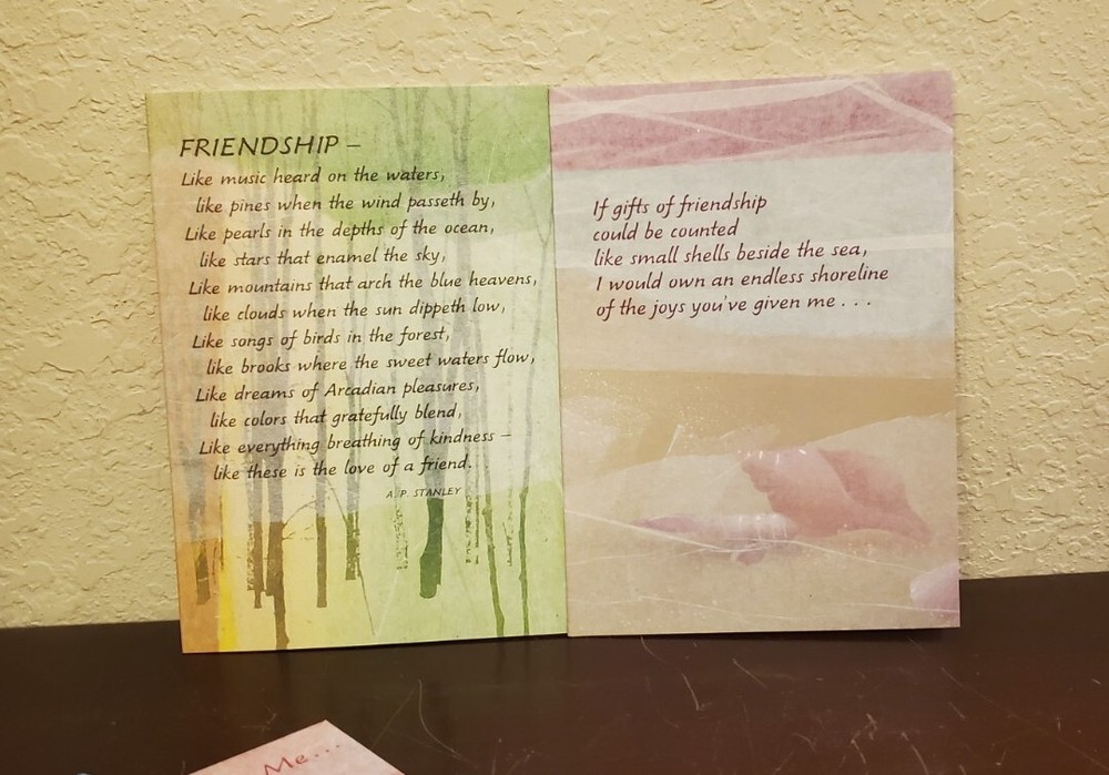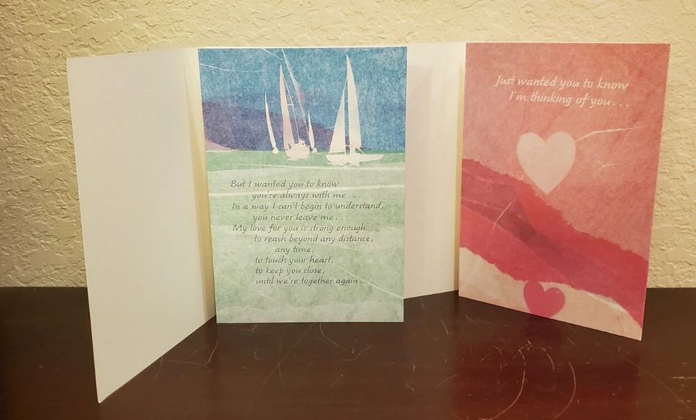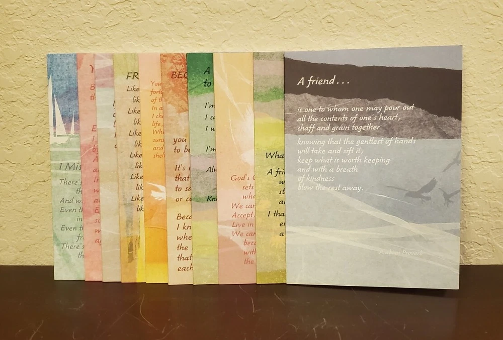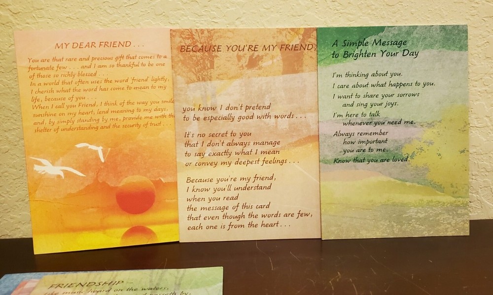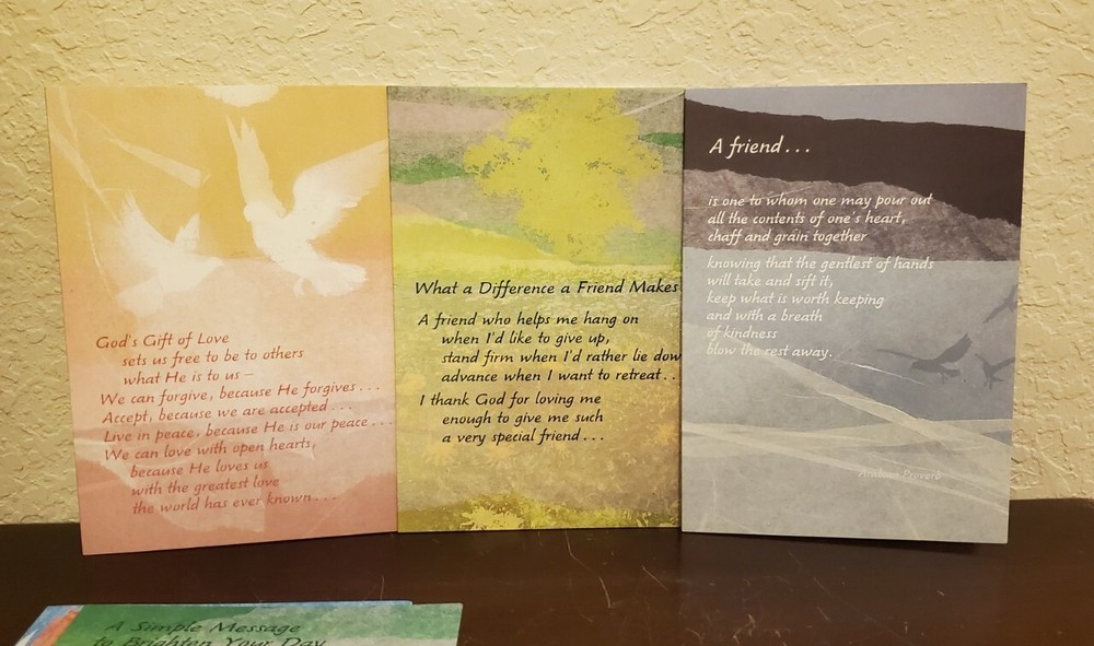 FRIENDSHIP CARDS Abbey Press B.J. Hoff VINTAGE Stationery Set of 10. Very nice shape--clean. Cards measure 5" by 7". There are 12 envelopes. Each card is a tri-fold with a blank middle (inside). You can see most of the fronts of all 10 cards. There is a religious component to the cards--God is often mentioned. Please see all pictures and ask all questions before bidding.