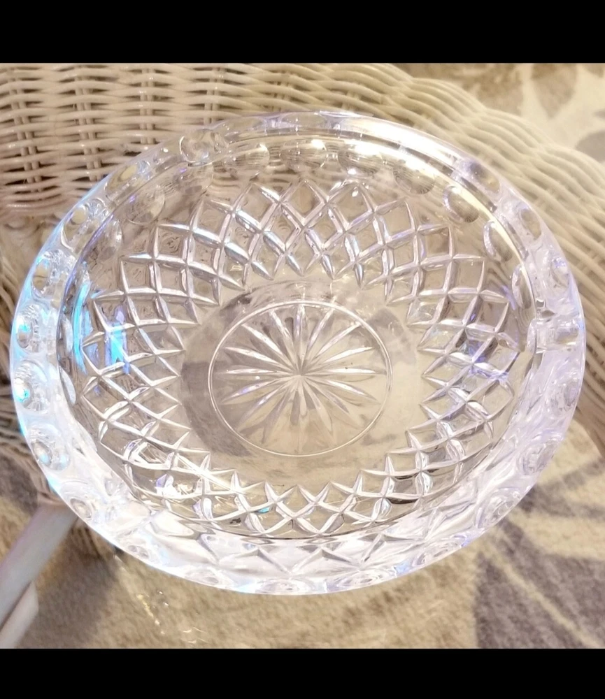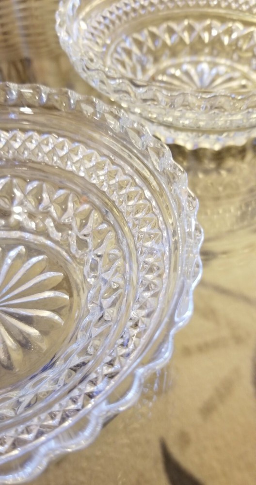 Vintage Glass Trinket Dishes. #1 Fancy 5.5" candy dishes 2 available please specify both if purchasing more than one no flaws mint condition. #2 D ouble leaf dual glass candy dish 11"x 6.5" has mini fine hairline crack bottom blends barely noticeable when empty, no leakage, dish is decorative and usable . #3 Vintage collectable oval frosted floral iris glass trinket dish no flaws mint condition. #4 Vintage sawtooth dual eared trinket dish no flaws mint condition. #5 Vintage sawtooth deco ashtray trinket dish no flaws. #6 Vintage collectable 1960's starburst ashtray trinket dish mint no flaws. Please note item number when placing order thank you.