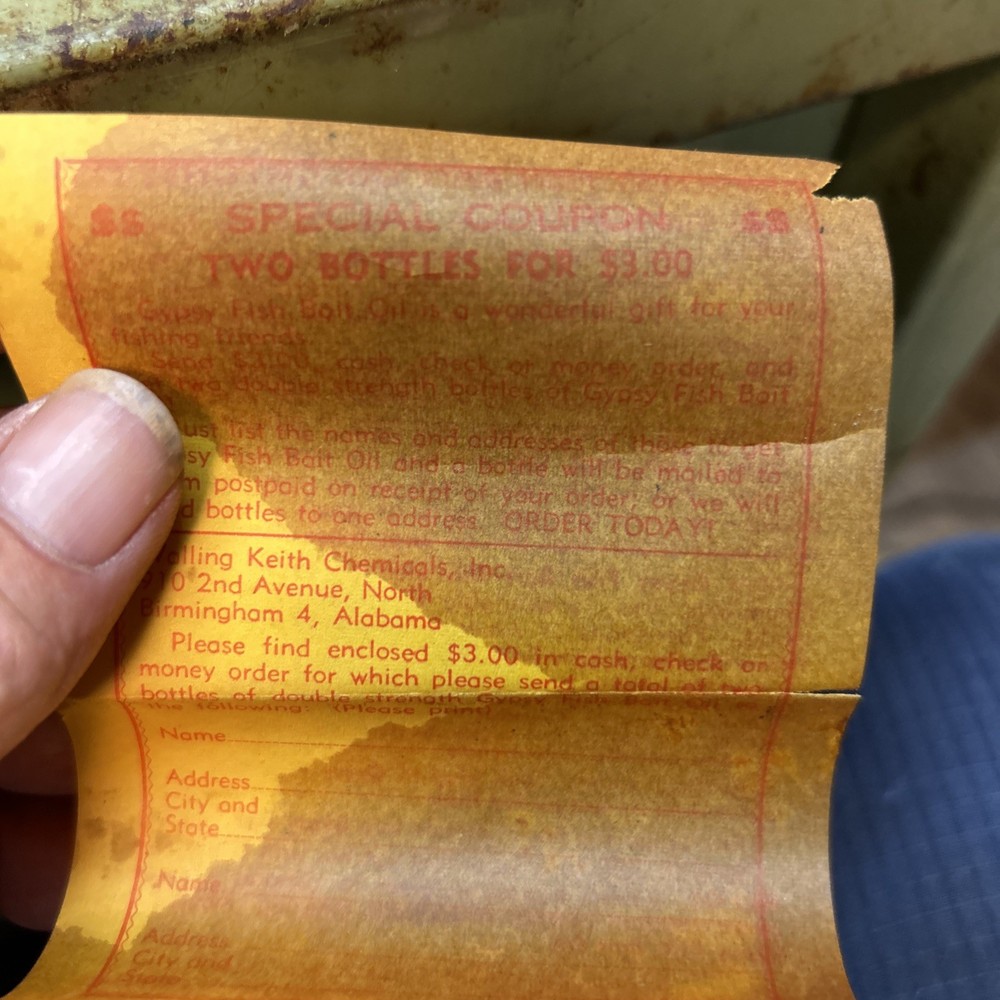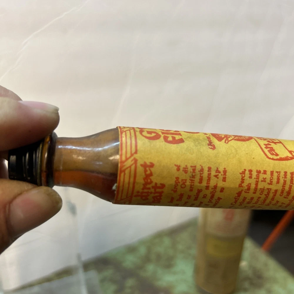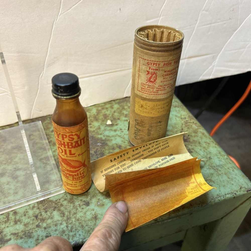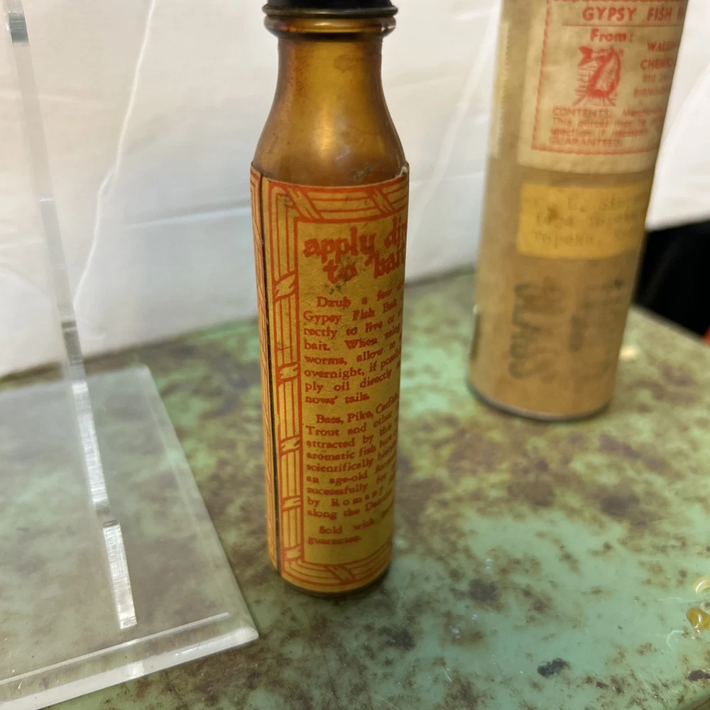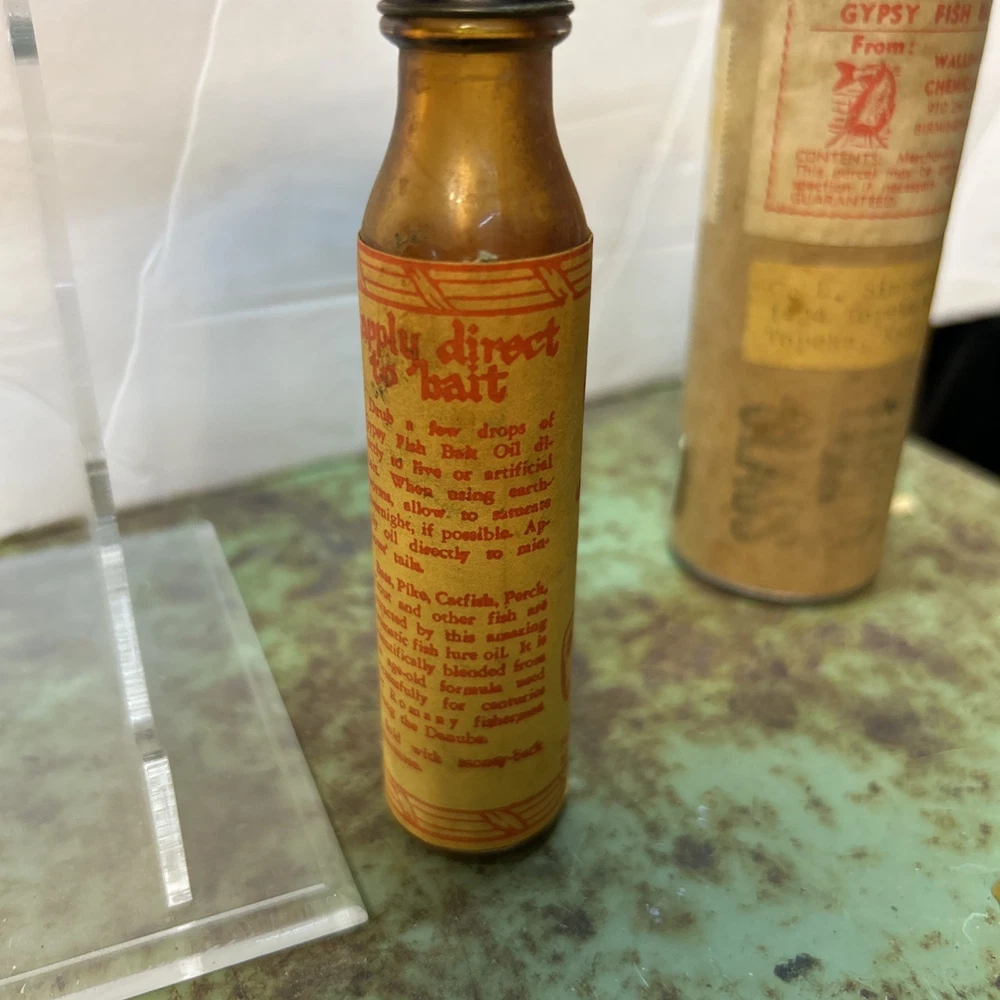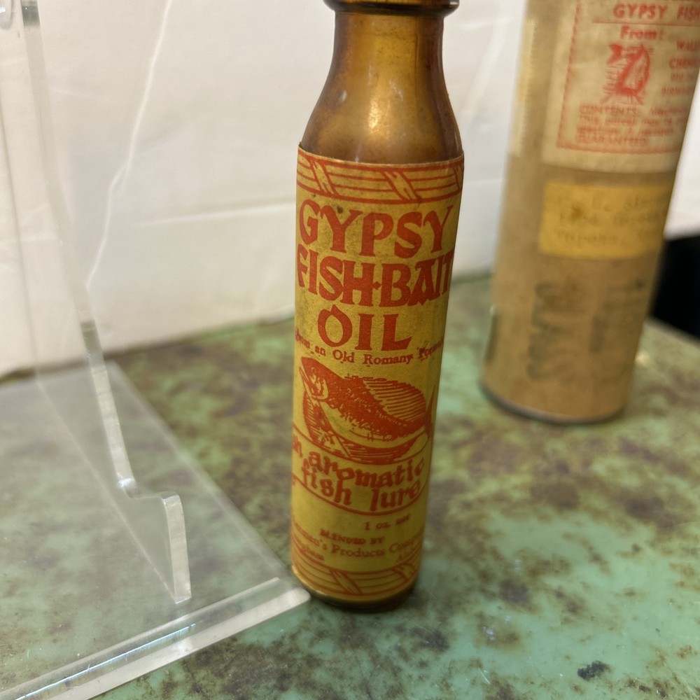 This is a vintage glass bottle of fish bait oil. The label on the bottle features the brand name "Gypsy" and the product is called "GYPSY FISH BAIT OIL". The bottle was manufactured in the United States and is now being sold as a collectible item for fishing enthusiasts. In original shipping container and paperwork