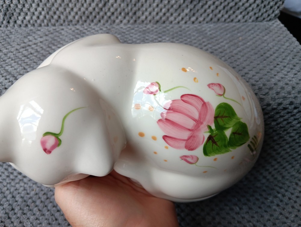 Sweet little sleeping kitty with handpainted pink flowers. It's appropriately 6 " in length. Please message me for additional photos or information.