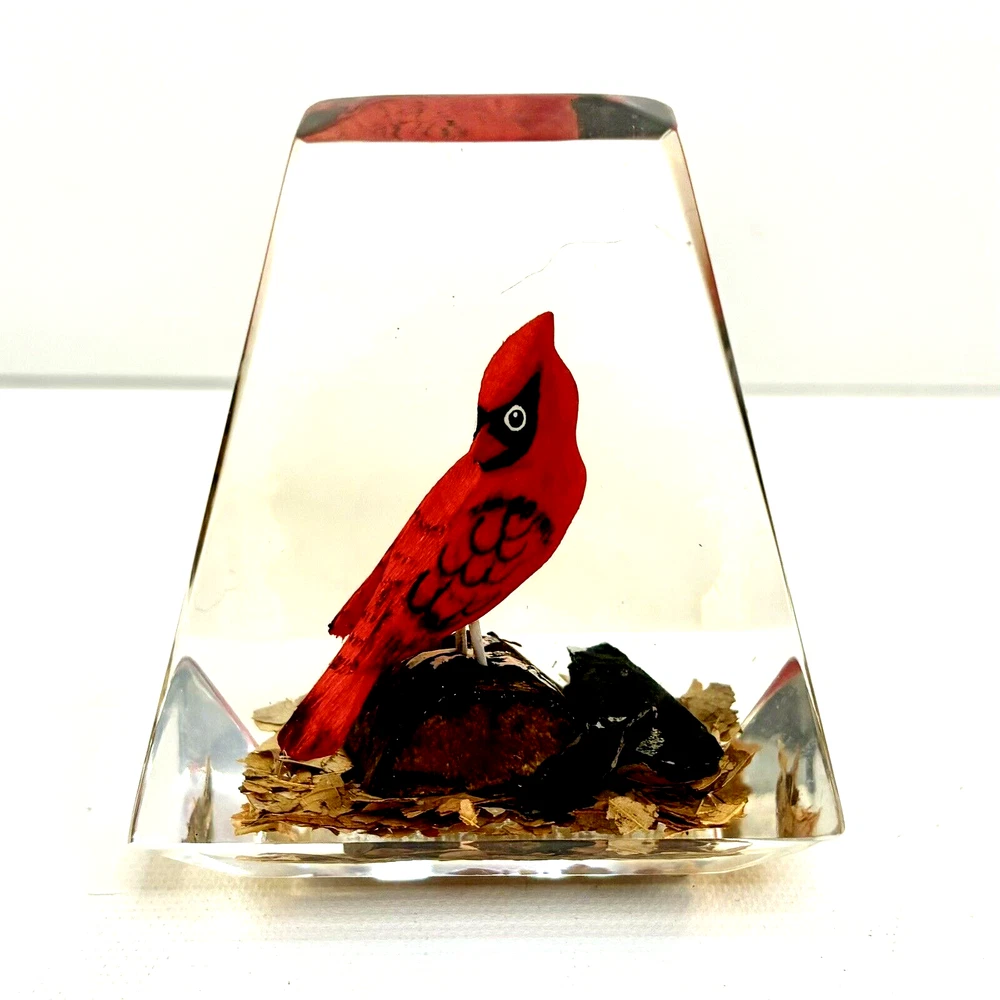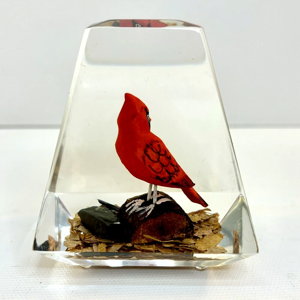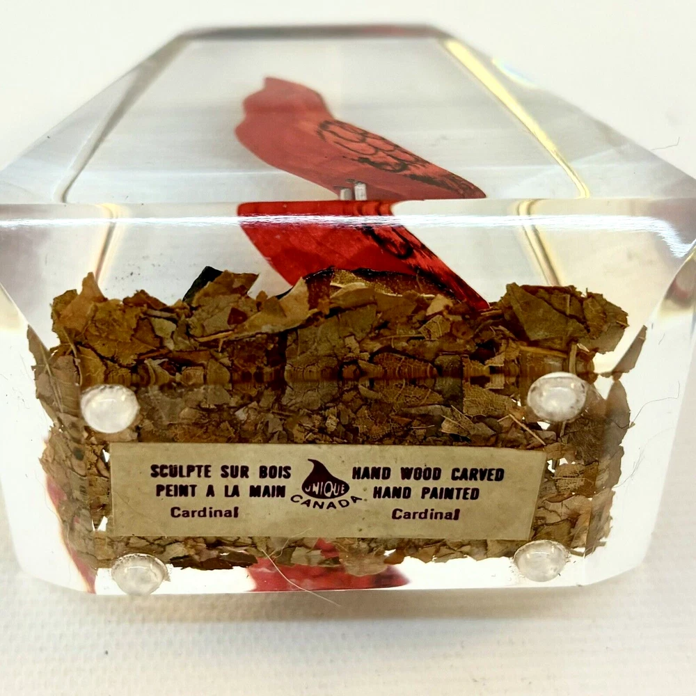 This vintage paperweight is a one-of-a-kind piece that features a hand-carved and painted cardinal. Made in Canada, this unique collectible is perfect for those who appreciate the artistry of handmade items. The paperweight is made of a combination of wood and lucite, making it a durable and unique addition to any collection. Whether you're a fan of vintage collectibles or are simply looking for a standout piece to display in your home, this cardinal paperweight is sure to impress. • Size: 3”h x 2-1/2”w x 2”l * Condition: Great pre-owned, vintage condition, with little wear.