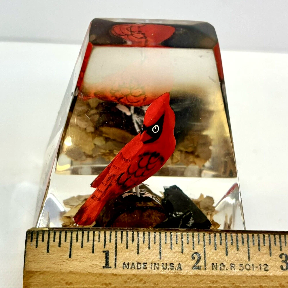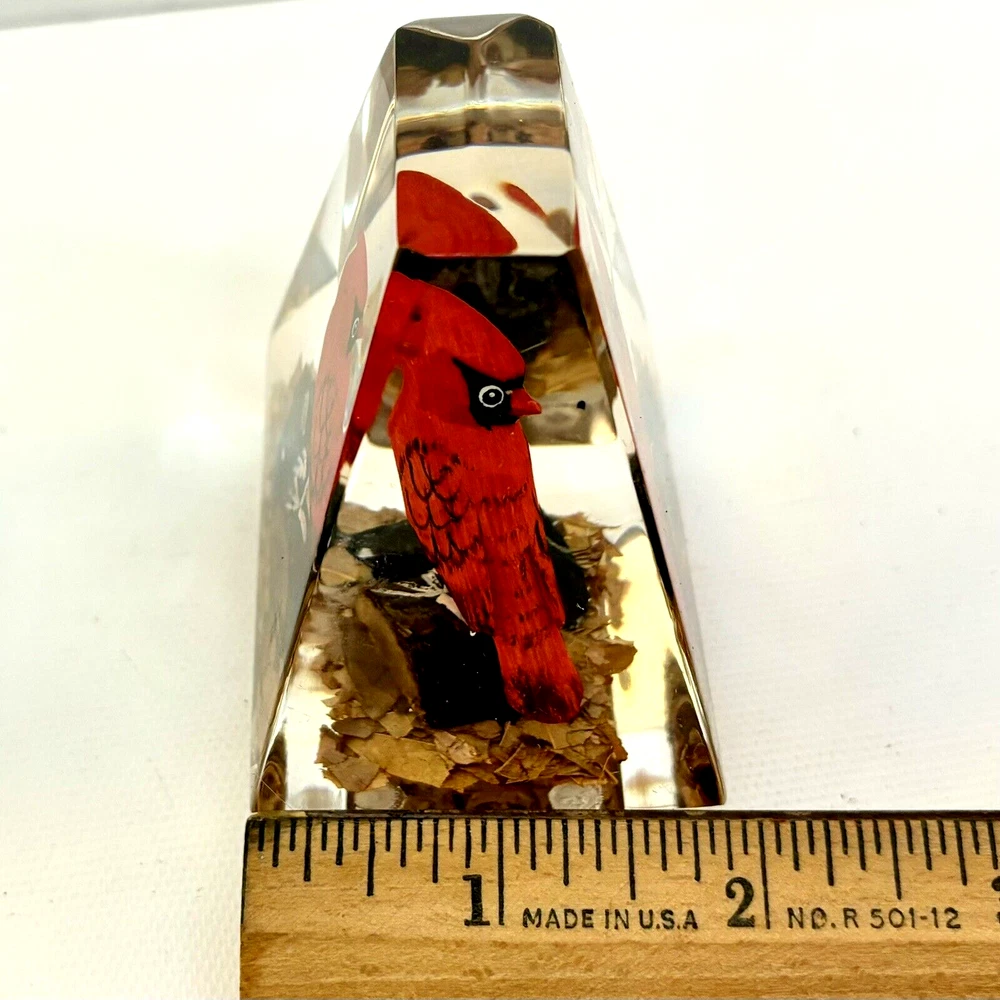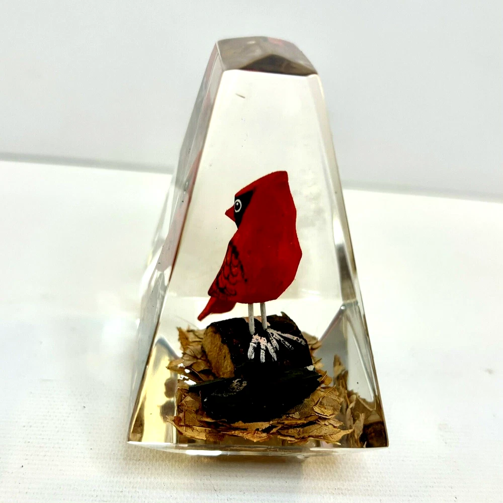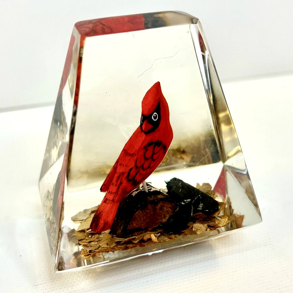 This vintage paperweight is a one-of-a-kind piece that features a hand-carved and painted cardinal. Made in Canada, this unique collectible is perfect for those who appreciate the artistry of handmade items. The paperweight is made of a combination of wood and lucite, making it a durable and unique addition to any collection. Whether you're a fan of vintage collectibles or are simply looking for a standout piece to display in your home, this cardinal paperweight is sure to impress. • Size: 3”h x 2-1/2”w x 2”l * Condition: Great pre-owned, vintage condition, with little wear.