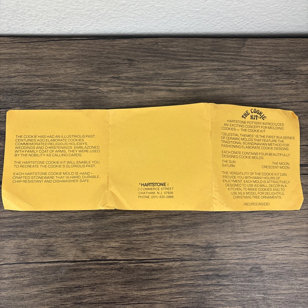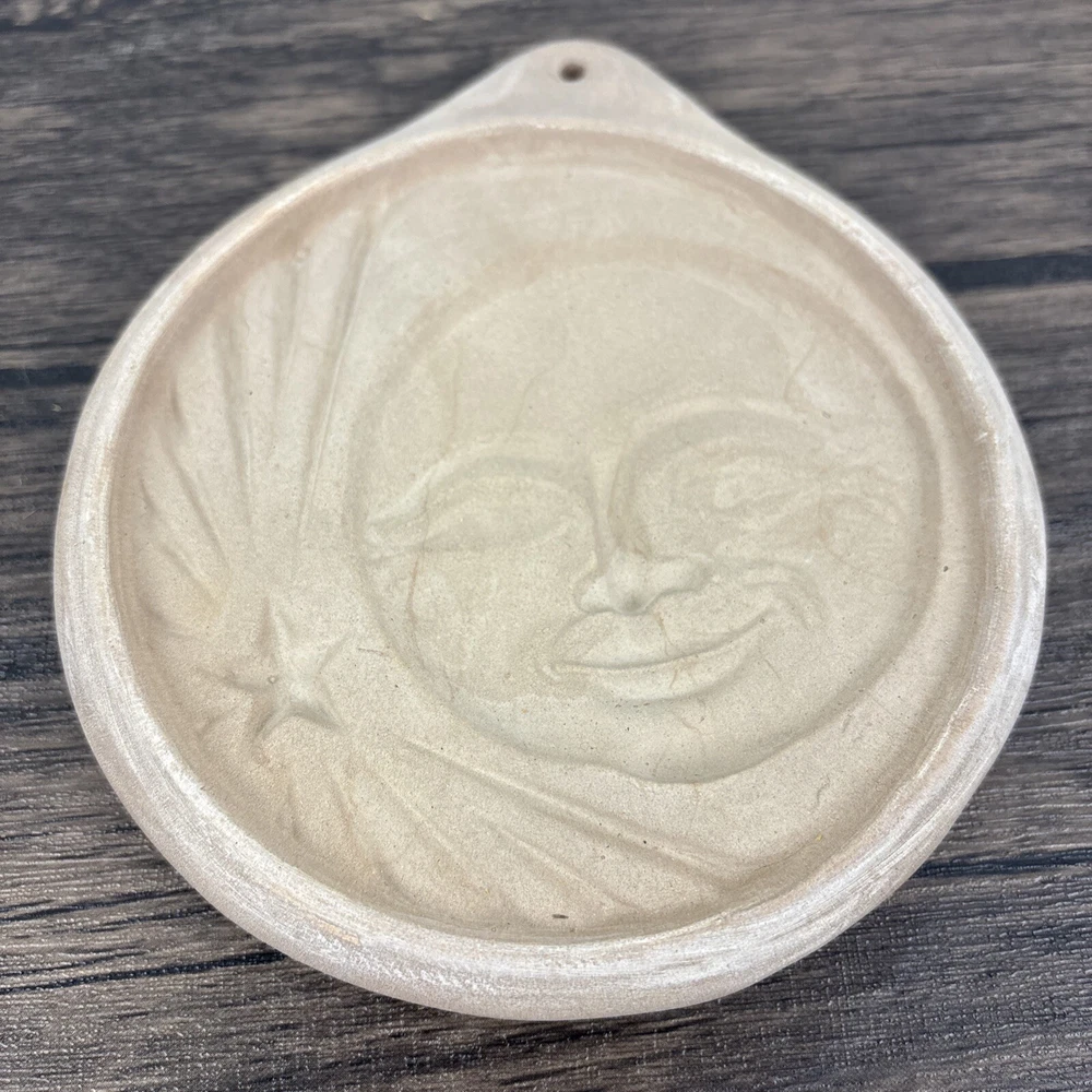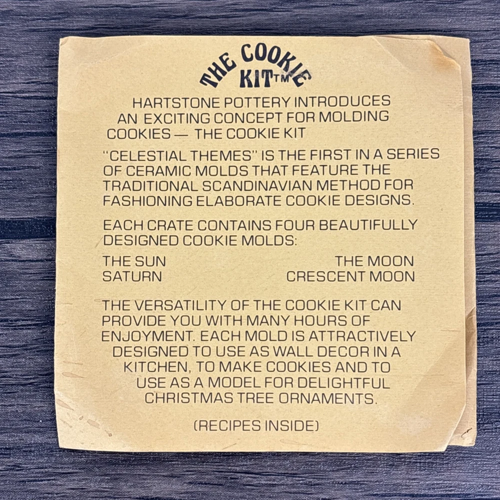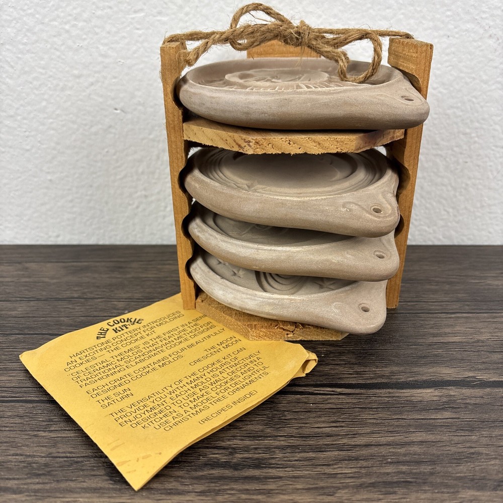 Vintage Hartstone The Cookie Mold Kit USA Sun Moon Stars Celestial 4 with Holder. Beautiful, unused set. Each measures 6” long with the hole, and 5” in diameter for the circle pattern. Comes with wood holder and recipe pamphlet. Shipped with care from a smoke free home.