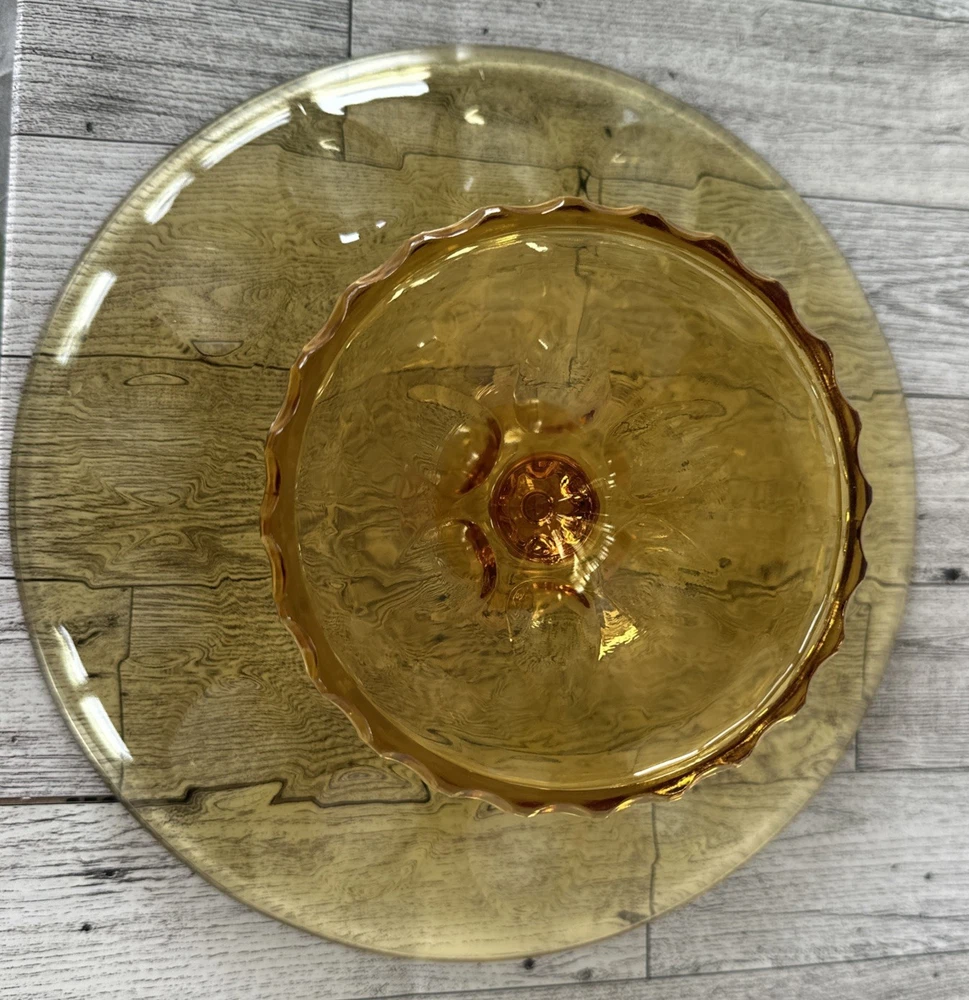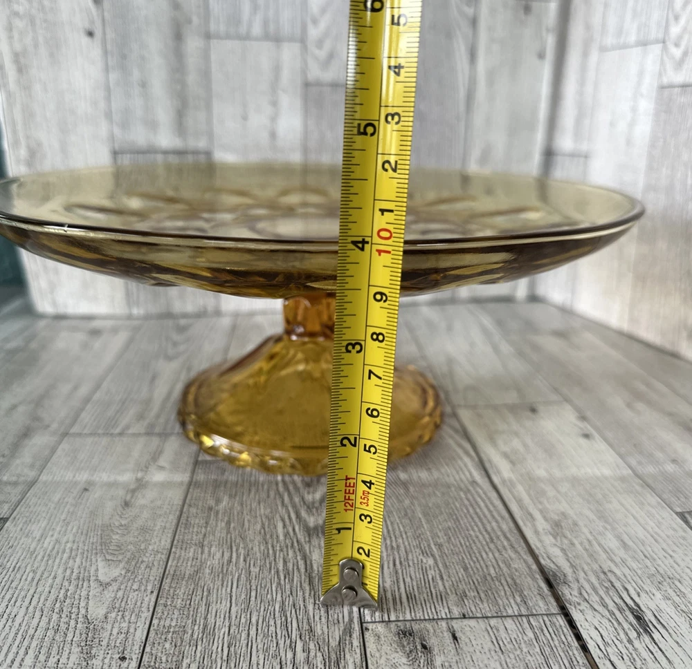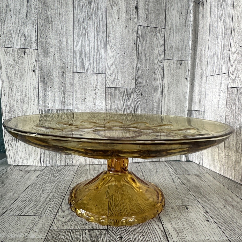 Add a touch of mid-century elegance to your table with this vintage amber glass cake stand from Hazel-Atlas Glass Company. Featuring the iconic Reflection pattern, this piece showcases a scalloped edge adorned with thumbprint impressions, all in a warm amber hue.  • Manufacturer: Hazel-Atlas Glass Company • Pattern: Reflection • Color: Amber • Material: Pressed Glass • Dimensions: Approximately 9¾” diameter x 4” height • condition: good condition review photos for additional condition and description details. • Era: 1950s–1960s    This pedestal cake stand is perfect for serving desserts or as a decorative centerpiece, adding vintage charm to any setting. Vintage Glass Disclaimer Thank you for your interest in this vintage glass item! Please read the following details carefully to ensure you are fully informed before making your purchase: Condition: This is a genuine vintage/antique piece and is sold as-is. It may display signs of age and wear, such as minor scratches, discoloration, or manufacturing imperfections, which are typical for items of this era. I strive to describe all notable flaws accurately and include detailed photos as part of the description. Please review the images carefully, as they are considered part of the listing. Authenticity: To the best of my knowledge, this item is an authentic vintage glass piece from the [specific era, if known]. Use Disclaimer: Due to the items age, this piece is not recommended for food or drink use. It is intended for decorative purposes only. The buyer assumes all responsibility for use or misuse of this item. Packaging and Shipping: I take great care to package each item securely with protective materials to ensure safe delivery. However, I cannot be held responsible for damage that may occur during shipping. If any issues arise, please contact me, and I will assist in filing an insurance claim. Shipping insurance is included with your purchase for added peace of mind. Returns: All sales are final unless the item is significantly not as described in the listing. Please contact me within 3 days of receiving the item if you believe there is a discrepancy. Questions: I encourage buyers to ask questions or request additional photos before purchasing. I?m happy to provide any additional information to ensure your confident in your purchase. By purchasing this item, you acknowledge and accept the terms of this disclaimer.