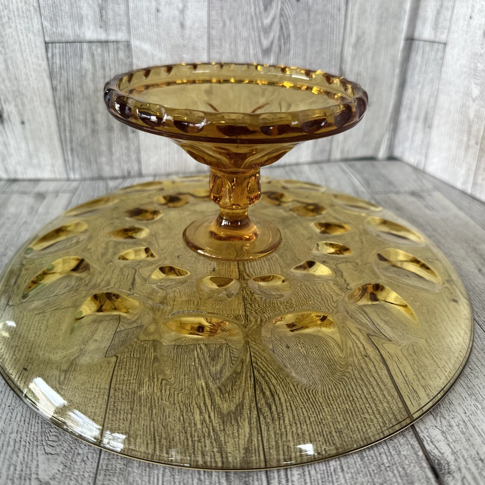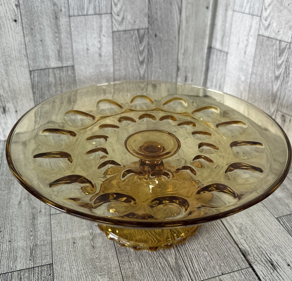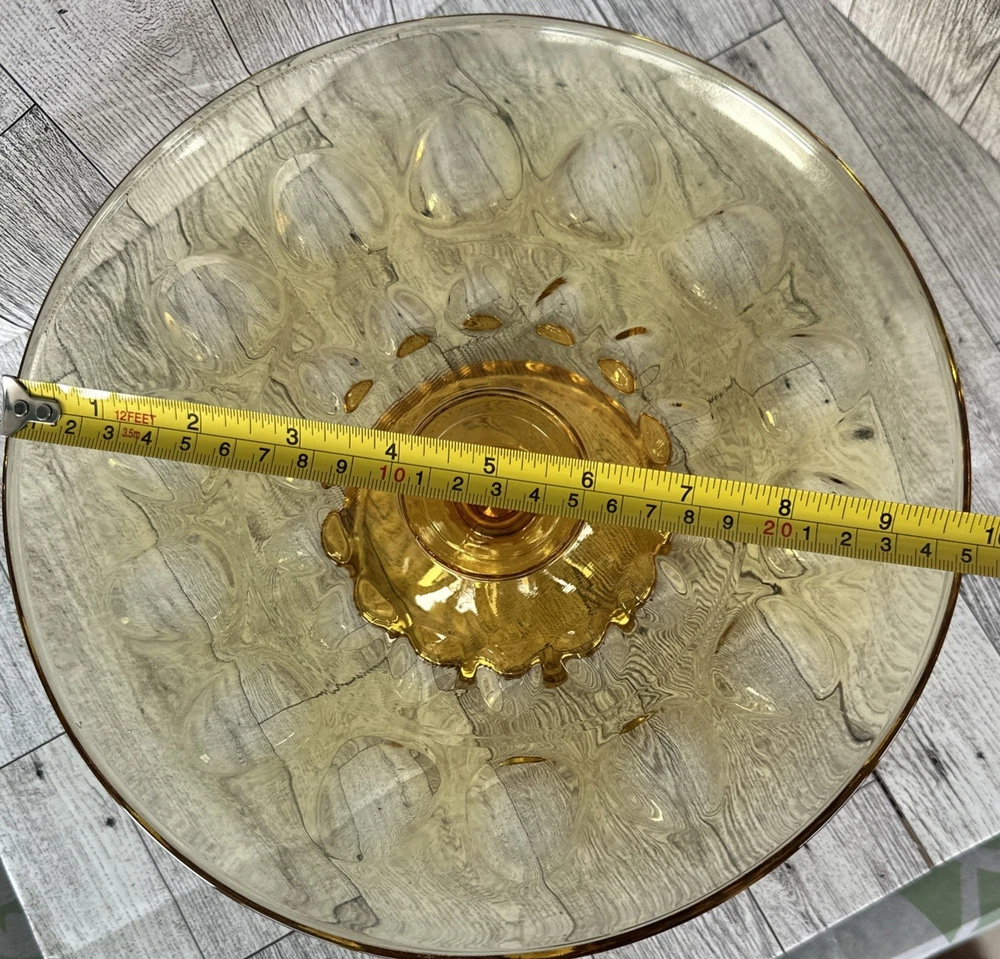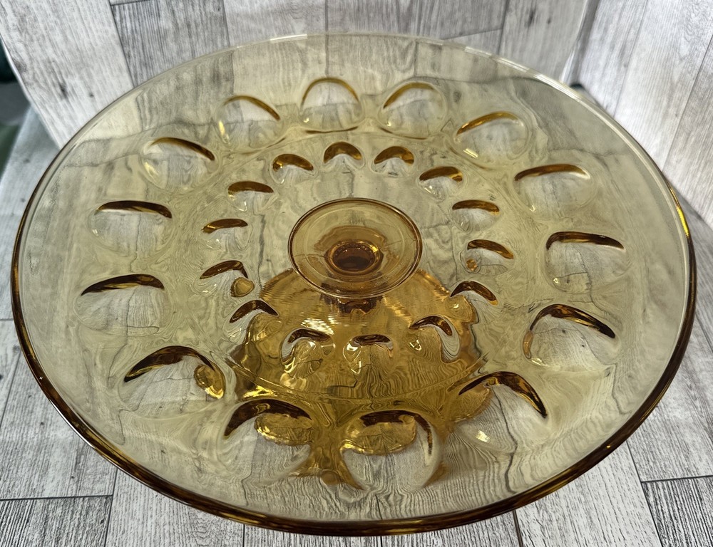 Add a touch of mid-century elegance to your table with this vintage amber glass cake stand from Hazel-Atlas Glass Company. Featuring the iconic Reflection pattern, this piece showcases a scalloped edge adorned with thumbprint impressions, all in a warm amber hue.  • Manufacturer: Hazel-Atlas Glass Company • Pattern: Reflection • Color: Amber • Material: Pressed Glass • Dimensions: Approximately 9¾” diameter x 4” height • condition: good condition review photos for additional condition and description details. • Era: 1950s–1960s    This pedestal cake stand is perfect for serving desserts or as a decorative centerpiece, adding vintage charm to any setting. Vintage Glass Disclaimer Thank you for your interest in this vintage glass item! Please read the following details carefully to ensure you are fully informed before making your purchase: Condition: This is a genuine vintage/antique piece and is sold as-is. It may display signs of age and wear, such as minor scratches, discoloration, or manufacturing imperfections, which are typical for items of this era. I strive to describe all notable flaws accurately and include detailed photos as part of the description. Please review the images carefully, as they are considered part of the listing. Authenticity: To the best of my knowledge, this item is an authentic vintage glass piece from the [specific era, if known]. Use Disclaimer: Due to the items age, this piece is not recommended for food or drink use. It is intended for decorative purposes only. The buyer assumes all responsibility for use or misuse of this item. Packaging and Shipping: I take great care to package each item securely with protective materials to ensure safe delivery. However, I cannot be held responsible for damage that may occur during shipping. If any issues arise, please contact me, and I will assist in filing an insurance claim. Shipping insurance is included with your purchase for added peace of mind. Returns: All sales are final unless the item is significantly not as described in the listing. Please contact me within 3 days of receiving the item if you believe there is a discrepancy. Questions: I encourage buyers to ask questions or request additional photos before purchasing. I?m happy to provide any additional information to ensure your confident in your purchase. By purchasing this item, you acknowledge and accept the terms of this disclaimer.