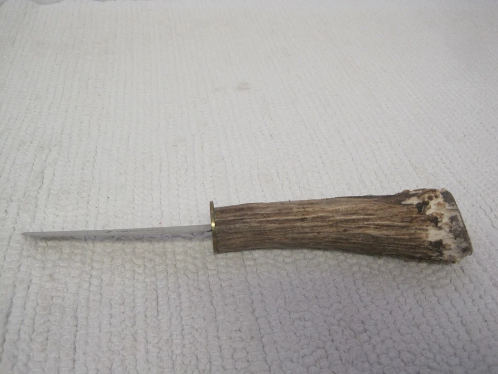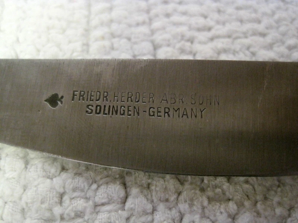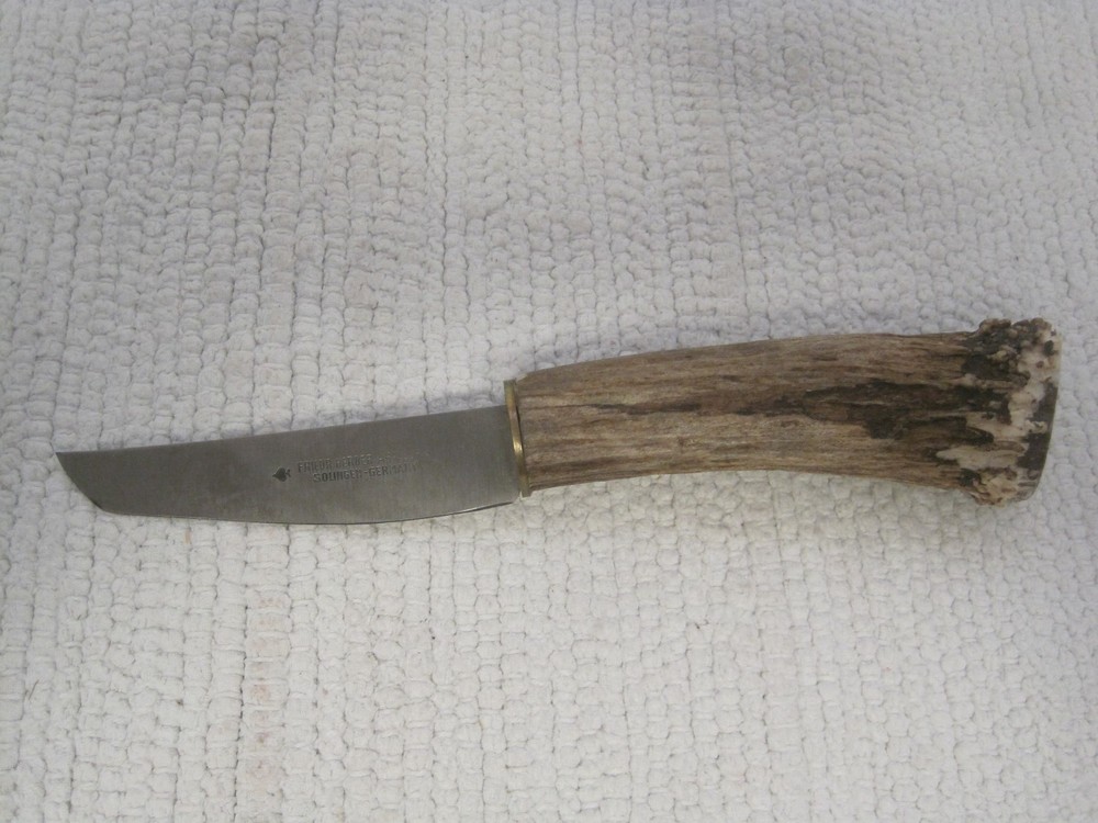 Item Custom Friedr. Herder Abr Sohn Solingen Germany Antler Spade Blade Knife Description Hello. I want to say that I always try to describe the items as best as I can. I do not claim to be an expert on the majority of the items I sell. If there is a problem or defect with the item you purchased, please contact me before leaving feedback and DO NOT open a case. I will 100% make it right. I am human and do make mistakes from time to time. 5 Star service is my goal. Here is another collectible knife from Ed Massey!! Please note that this blade edge and point were possibly reshaped by Tex. I am not sure but the edge does have a curve to it that doesn't look factory. This is a fixed blade knife with Friedr. Herder Abr. Sohn Solingen Germany and the spade etched on it. This blade is pretty sharp but I am guessing it could be sharpened more. The handle has Antler/Stag. Most likely Elk or Whitetail. A token or coin was used for the bolster. Blade measures 3 1/2" x 3/4" (widest part). The whole knife measures 8". The widest part of the handle is just under 4" in diameter. The blade is marked as noted above. See photos. The tip is pointed. Blade is straight and not bent. No play in the blade. Shows some age on the blade. Curved blade edge. Camouflage Nylon sheath with Velcro closure included. Any questions or concerns, please ask! Purchase with confidence!! I SHIP FAST!!! Disclaimer If you cannot make a payment immediately after purchase, please notify me as to when payment will be made. I am more than happy to hold an item for you if you simply communicate with me and let me know when payment will be made. If I do not hear from you within 48 hours after purchase, the item will be re listed. Please visit my store for the multiple other items I have listed. All of my items come from a smoke free, clean and pet free home. Any questions, please feel free to ask. Bin AA