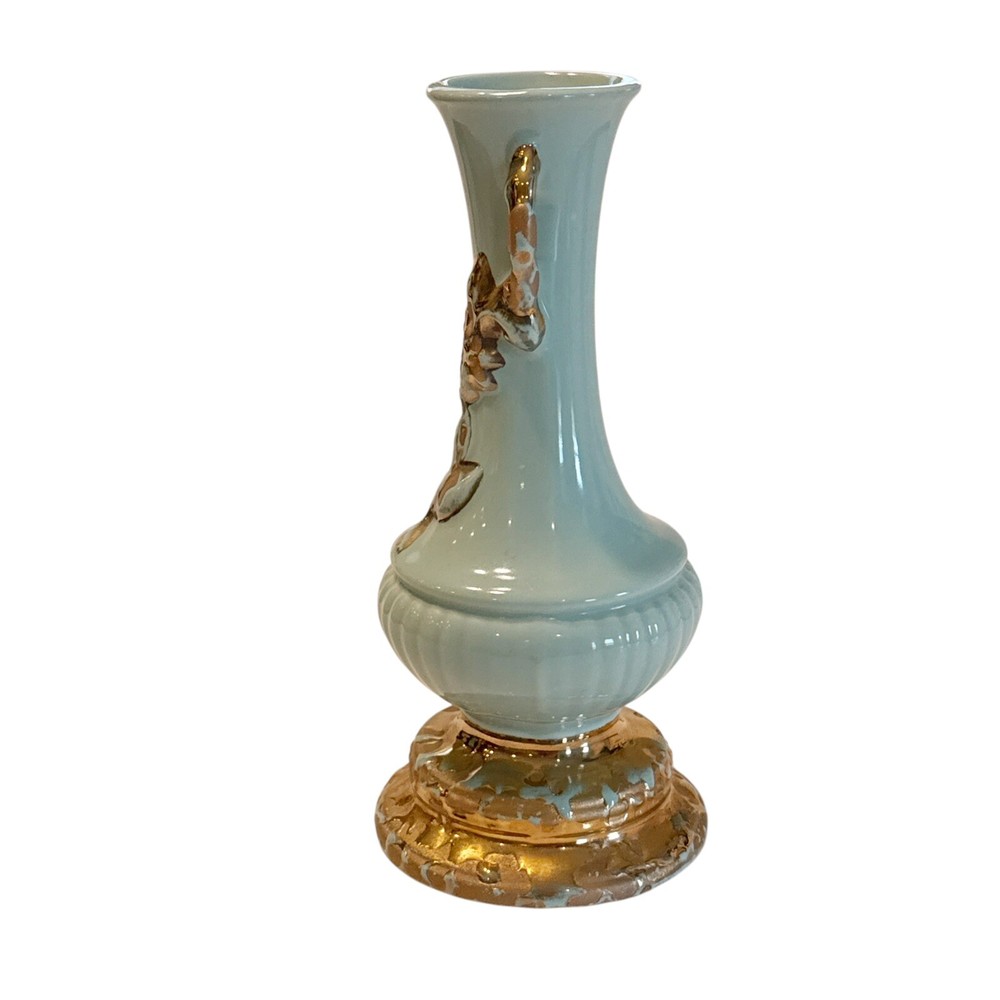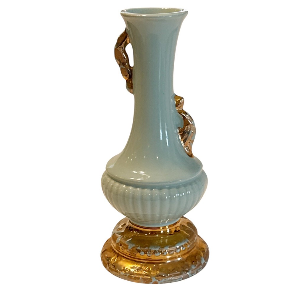 Add a touch of vintage glamour to your home decor with this stunning 24kt gold vase. With its textured surface and weeping gold design, it's a one-of-a-kind piece that will catch the eye of any visitor. Measuring 7.5 inches in length and 3.2 inches in width, it's the perfect size for displaying your favorite flowers or as a standalone decorative item. Crafted by hand in the United States during the 1960s, this original Hollywood Regency vase is a must-have for any collector. Its gold finish and elegant style make it suitable for all occasions and it will surely be a conversation starter in any room. Care instructions include hand wash only to maintain its quality. Smoke free home Please visit my store at https://www.ebay.com/str/theuniqueredhead . Thank you for your consideration. Please message me if you have any questions. I do combined shipping on my items in the store.