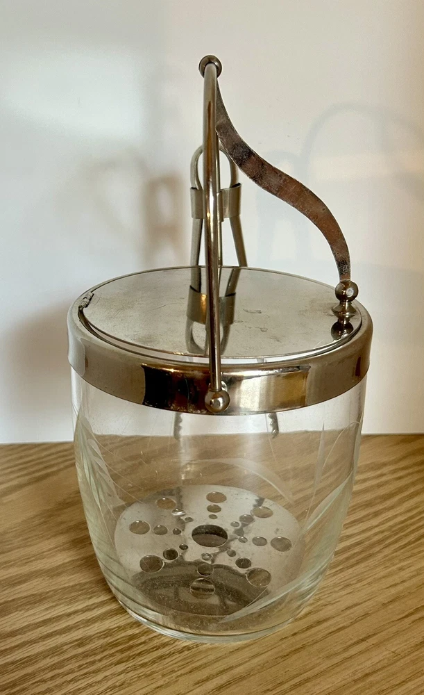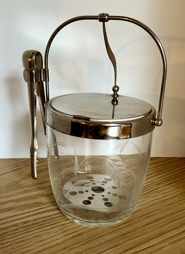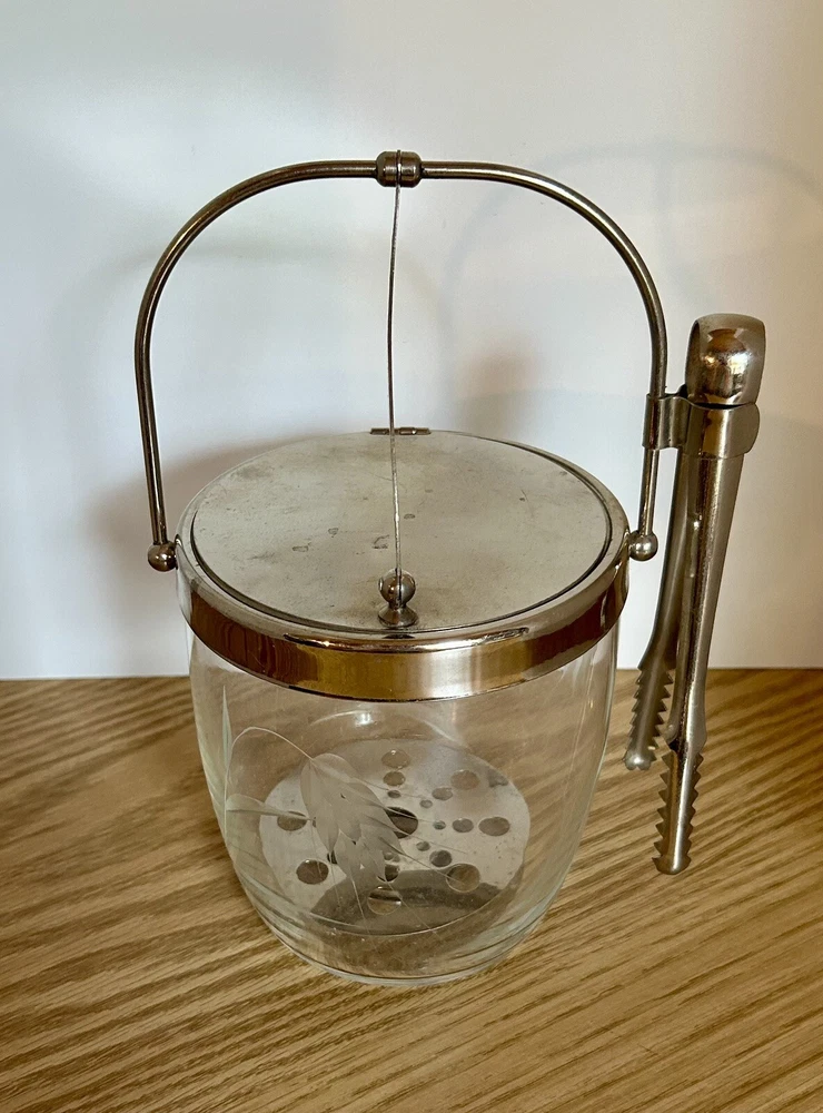 Vintage glass ice bucket with metal hinged lid and tongs. This item includes a hinged lid, hanging tongs and a small strainer at bottom. It has frosted wheat leaves etched in the glass. Approx size: with lid handle up is 9" tall (including handle) x 6 3/4" wide (including the tong handle) x 5" length (back to front)