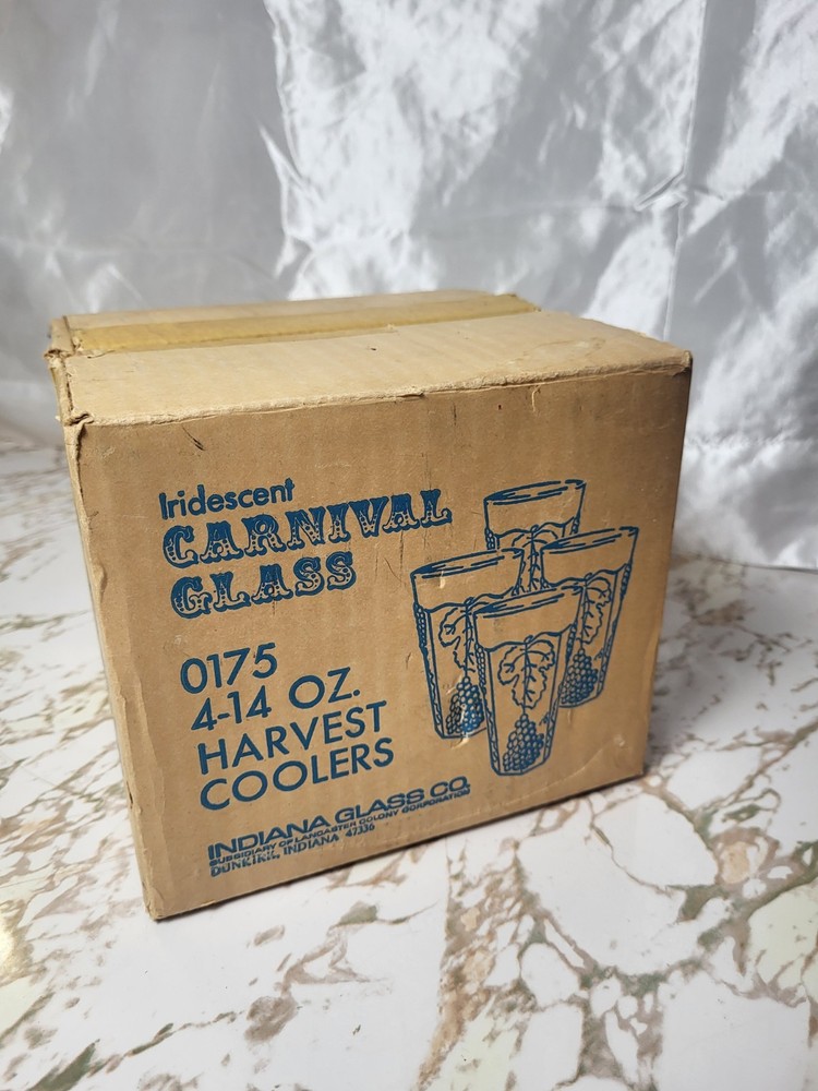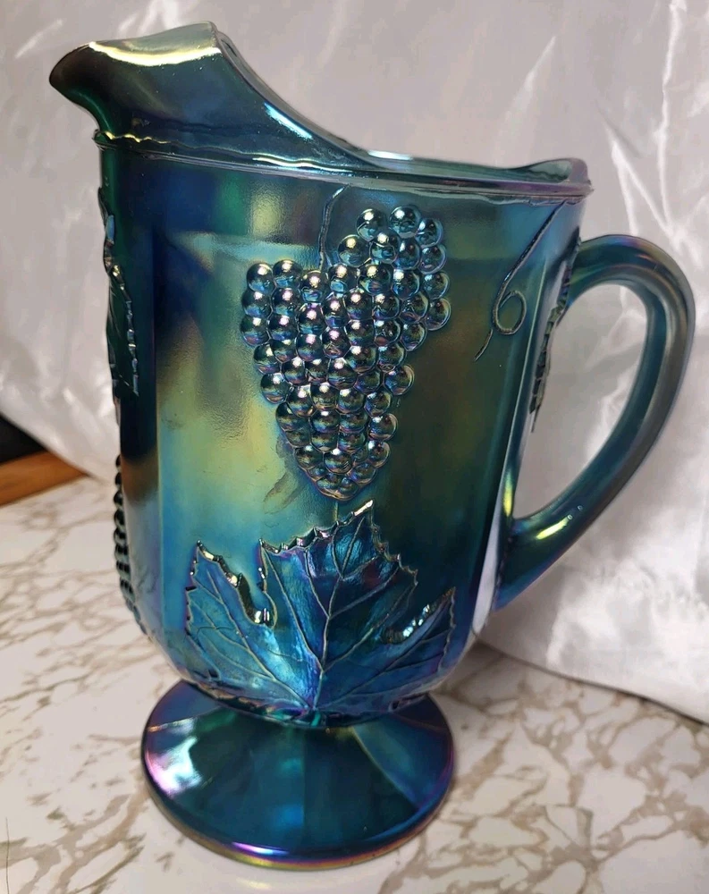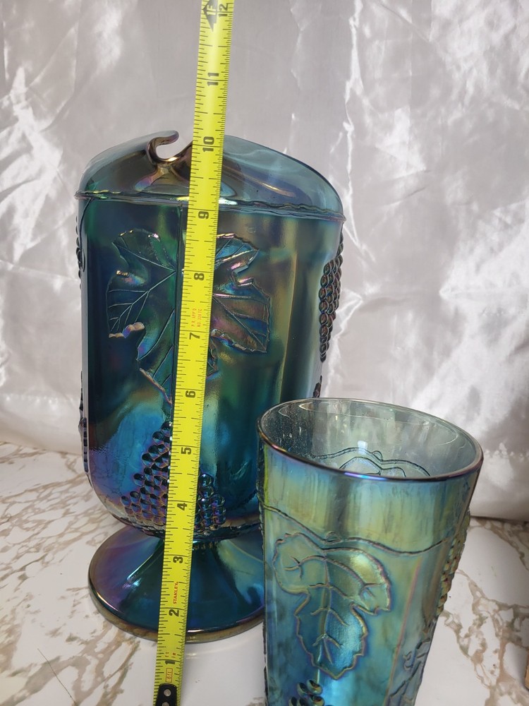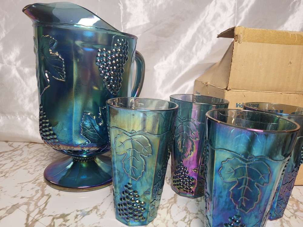 The product is a set of Vintage Indiana Carnival Glass Iridescent Blue Harvest Grape Pitcher and 4 Tumblers. The pitcher is made of glass with a shiny finish and features an iridescent blue color, typical of Indiana Glass's craftsmanship. This set would be a charming and unique addition to any kitchen, dining room, or bar, adding a touch of nostalgia and elegance to your home decor. Perfect for serving drinks or displaying as a decorative piece, these items are sure to stand out and create a statement in your space. pitcher not in original.