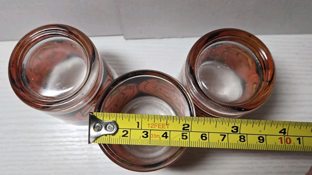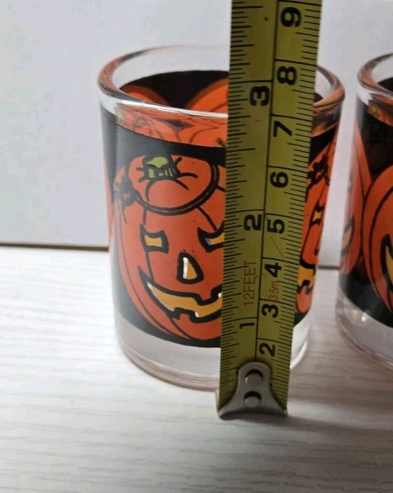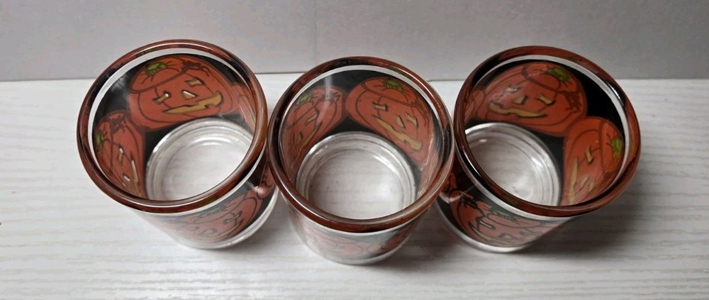 This listing is for a set of 3 vintage Indiana Glass Halloween Jack O Lantern votive candle holders. The glass holders are round in shape with a pumpkin pattern in orange and black. They are suitable for votive candles and measure 3 inches in height and length, with a width of 2 inches. The contemporary style features a high gloss finish, making them perfect for Halloween decor in any room.