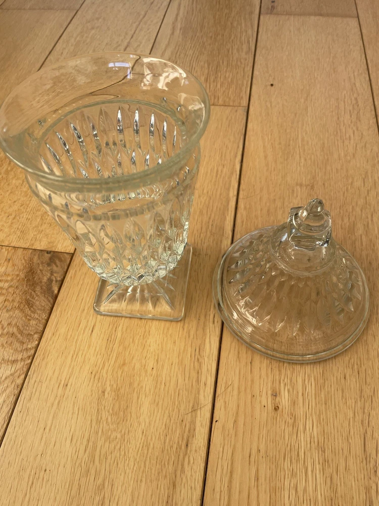 This vintage Mount Vernon candy dish by Indiana Glass Company is a round pedestal bowl with a lid, perfect for storing and displaying sweets. The design features a cut glass pattern in clear glass, giving it a timeless mid-century modern style. The dish is dishwasher safe, making it easy to clean and maintain. A lovely addition to any home, this covered candy dish is both functional and decorative, ideal for serving treats in style.