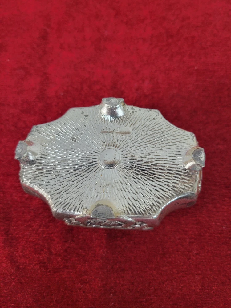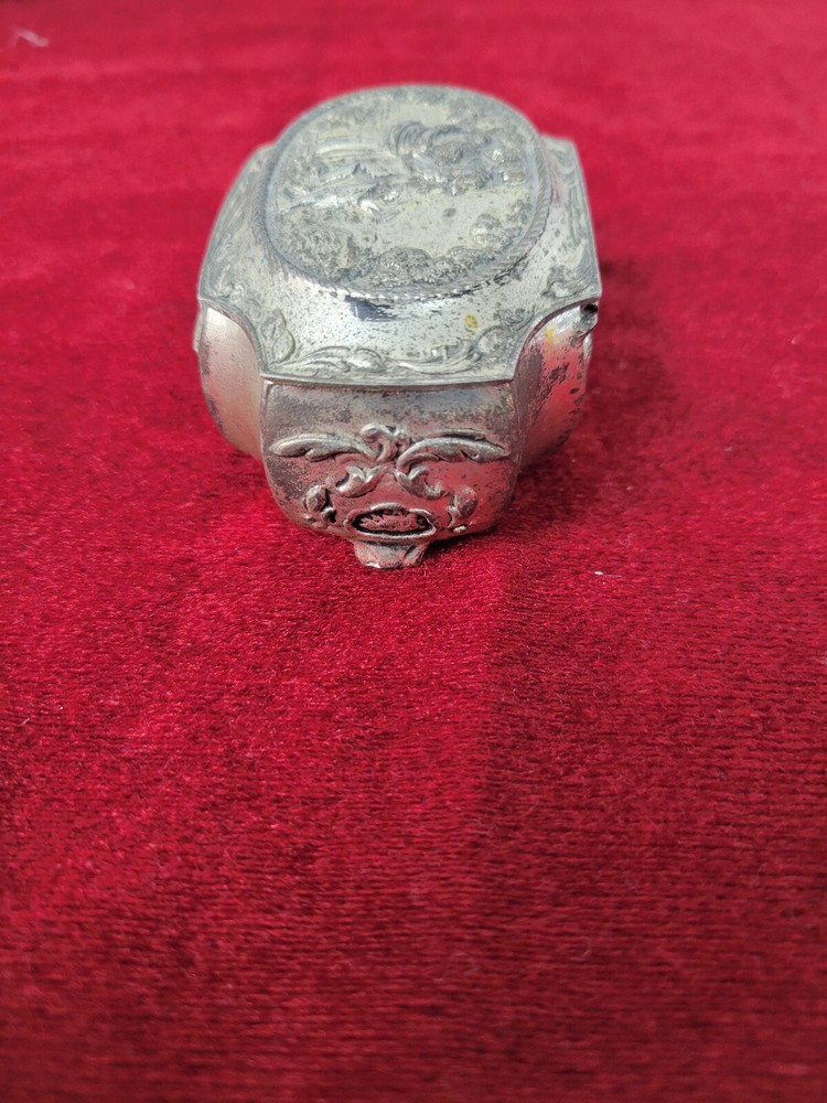 Vintage silverplate (?) trinket box with red velvet interior. Victorian style couple on the top. Top has some wear due to age and use. Interior is in very good condition. Hinge on lid is very good. 3" wide at the widest point and 2" across. Item will ship within one business day of completed sale. I DO NOT ship media mail. All items will be securely packaged and will ship USPS Ground Advantage, Priority mail, UPS or Fedex depending on weight and size. I do offer a 30-day money back guarantee on almost every item I sell. If there are issues with your item, please return it for a refund. Refund will be issued upon return of item. Some restrictions may apply. It is always appreciated if you contact me before starting a return so that I can try and assist without the hassle of a return.
